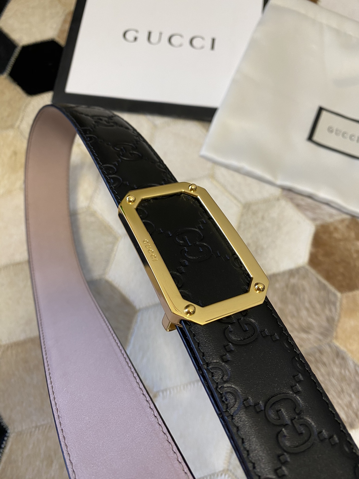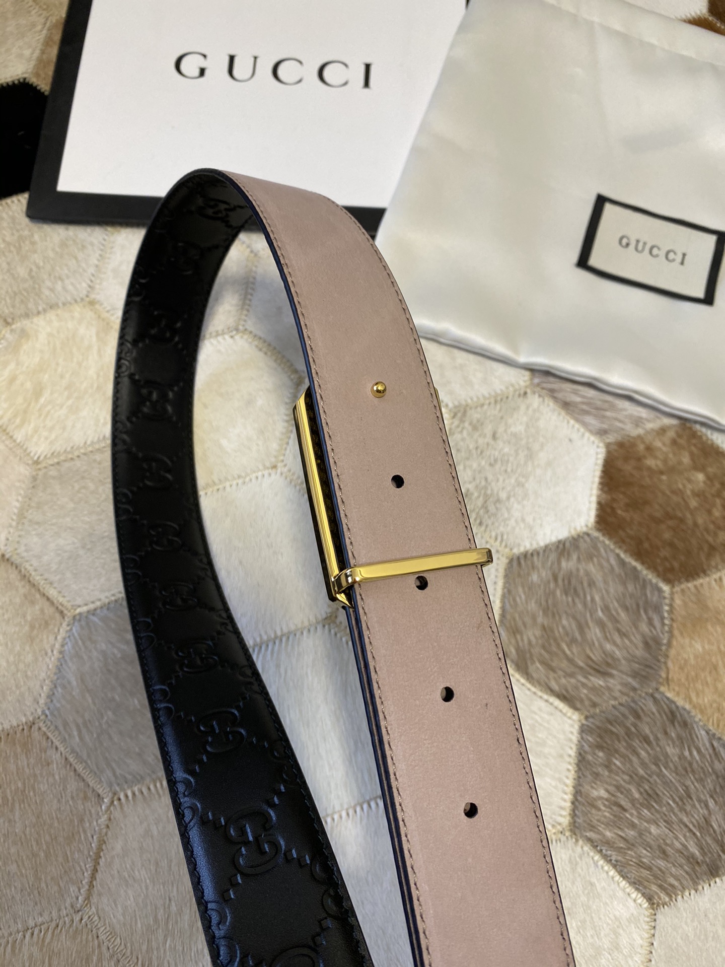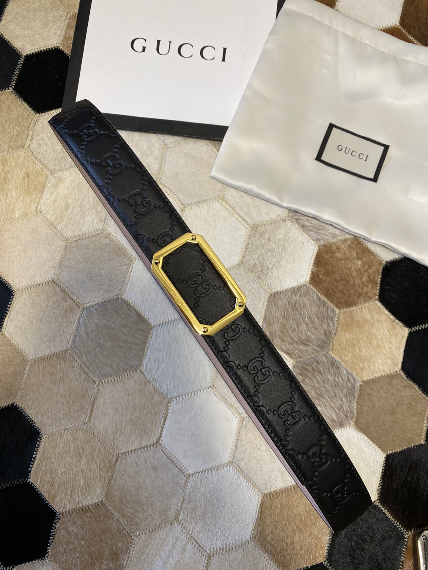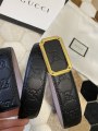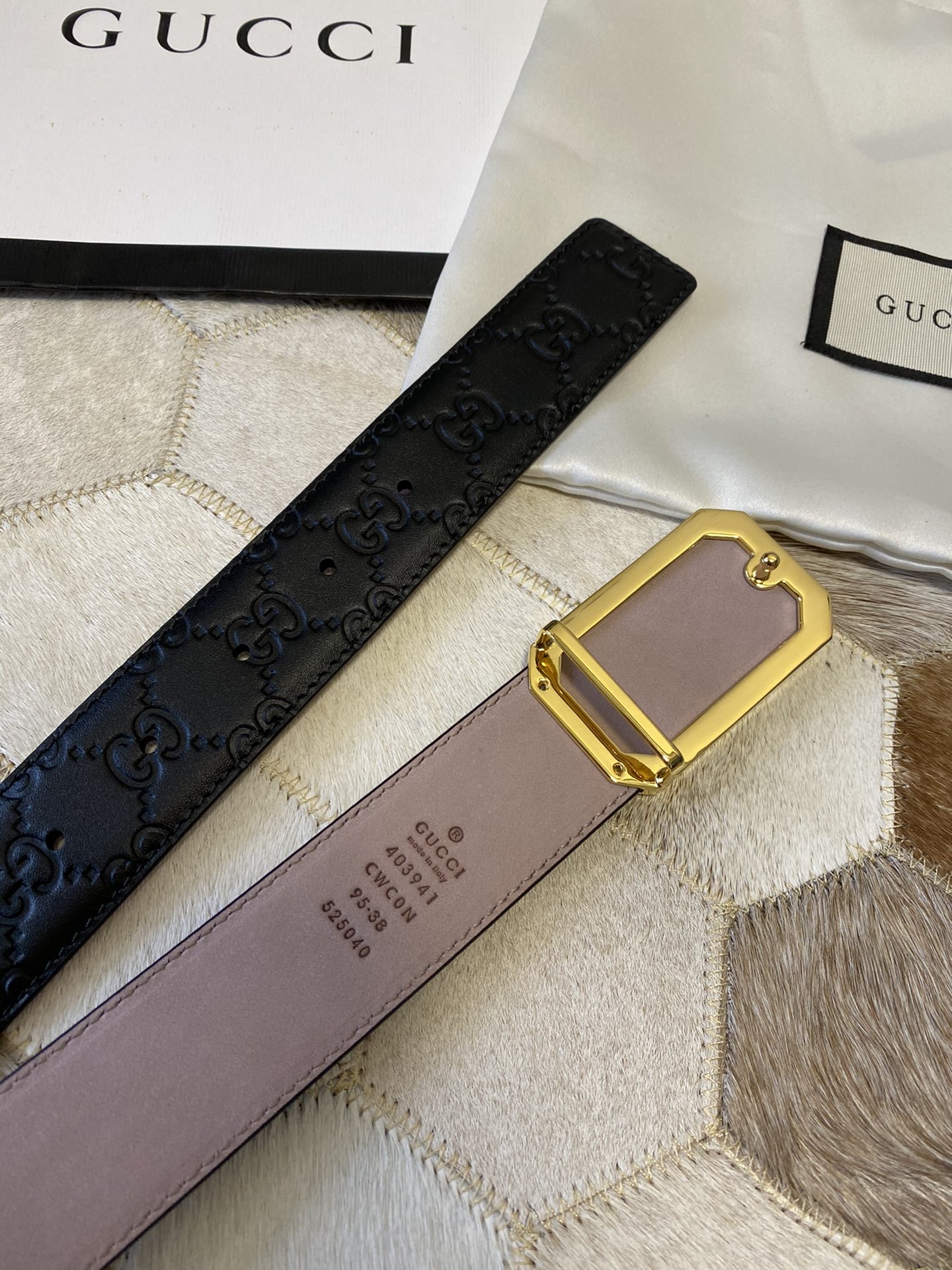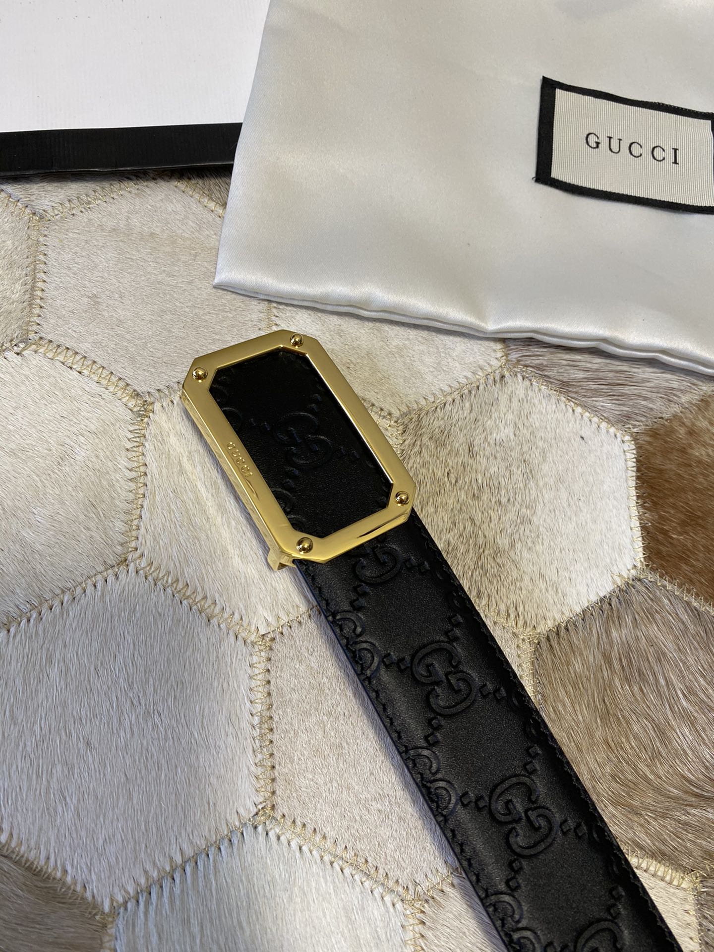 This GUCCI belt with an exquisite square metal buckle is crafted from imported black cowhide and embossed with the classic Double G pattern, creating a discreet yet luxurious feel. The belt's smooth, delicate texture and natural sheen are complemented by a textured metal square buckle, showcasing the brand's uniquely elegant style.