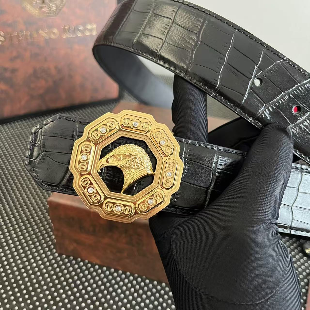 The two-tone octagonal eagle head leather belt is a unique and fashionable accessory, popular for its distinctive design and high-quality materials. This belt often features two colors, creating a striking contrast and adding visual impact. The octagonal eagle head buckle is not only instantly recognizable but also symbolizes strength and elegance, making it suitable for a variety of occasions. Whether paired with casual or formal attire, the two-tone octagonal eagle head belt adds a touch of personality and style to any outfit, making it a popular choice among fashion enthusiasts.