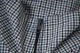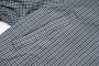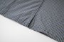 The fine check pattern and dimensional tailoring create a slimming, elevated look, and a striking presence.
