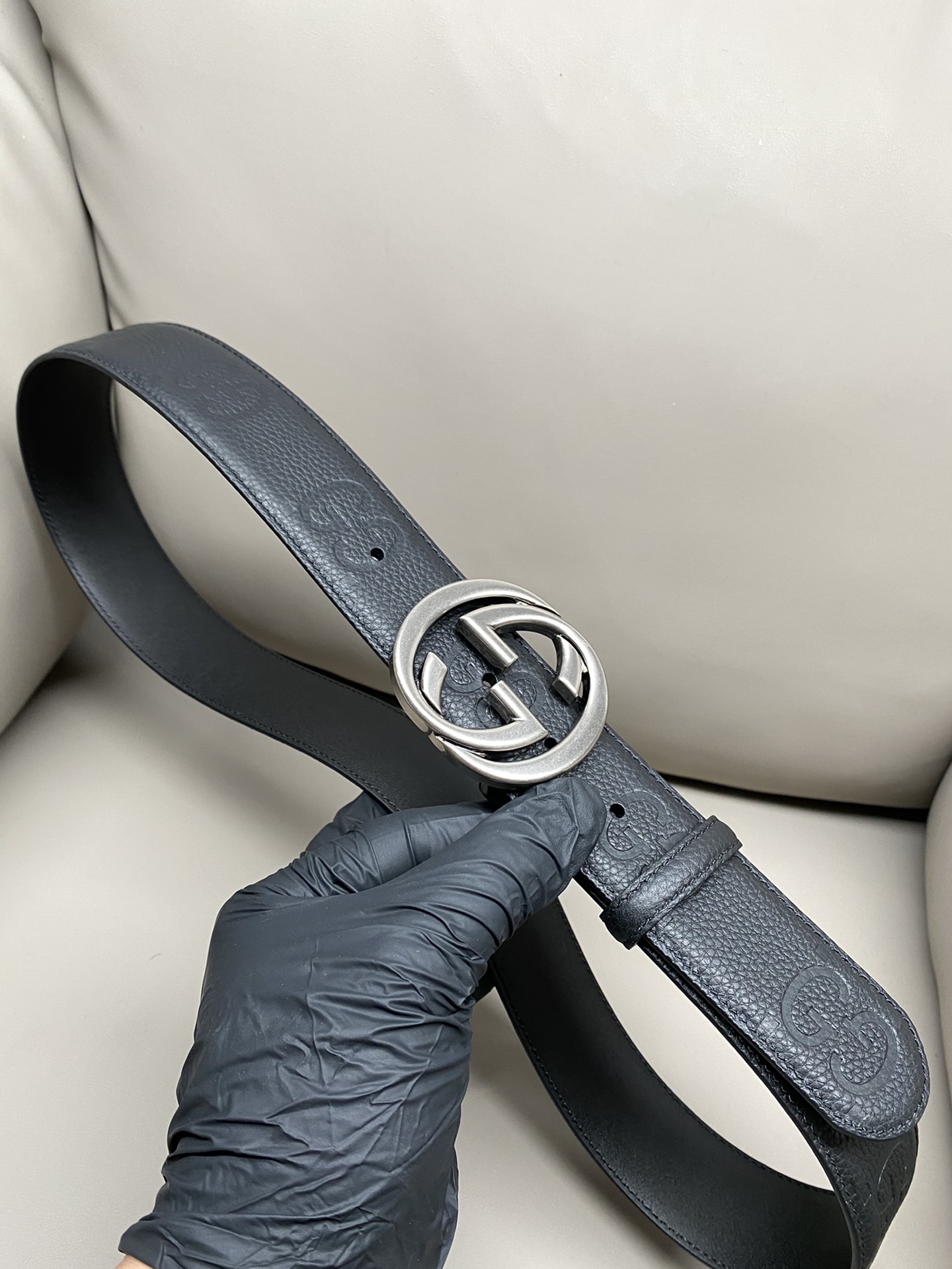 This classic GUCCI double-sided belt is crafted from the brand's signature Gucci Signature heat-embossed leather. Made from imported top-grain cowhide, it boasts a thick, crisp, and smooth feel. The distinctive, three-dimensional print creates a rich, textured look. The interlocking G metal buckle exudes the brand's understated luxury.