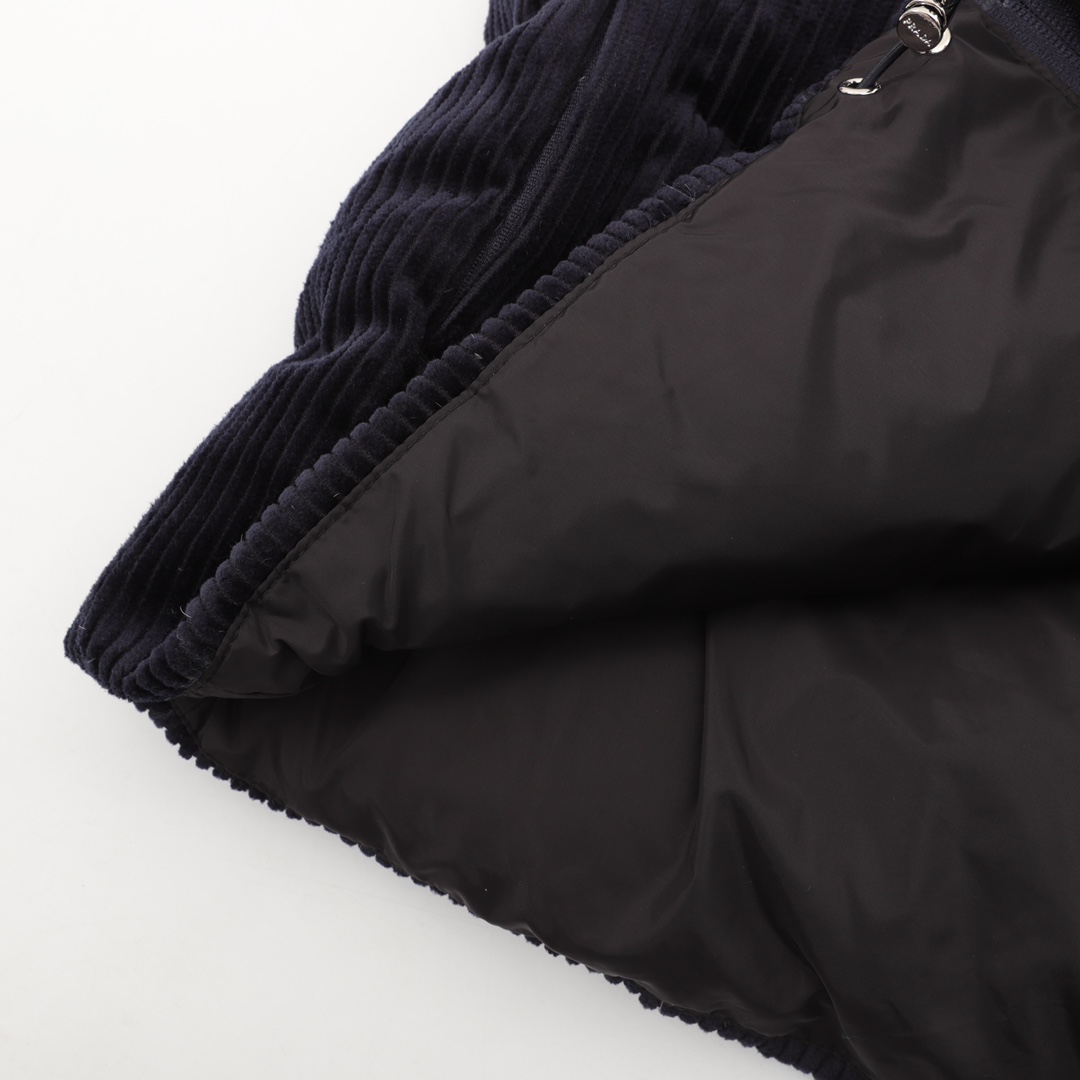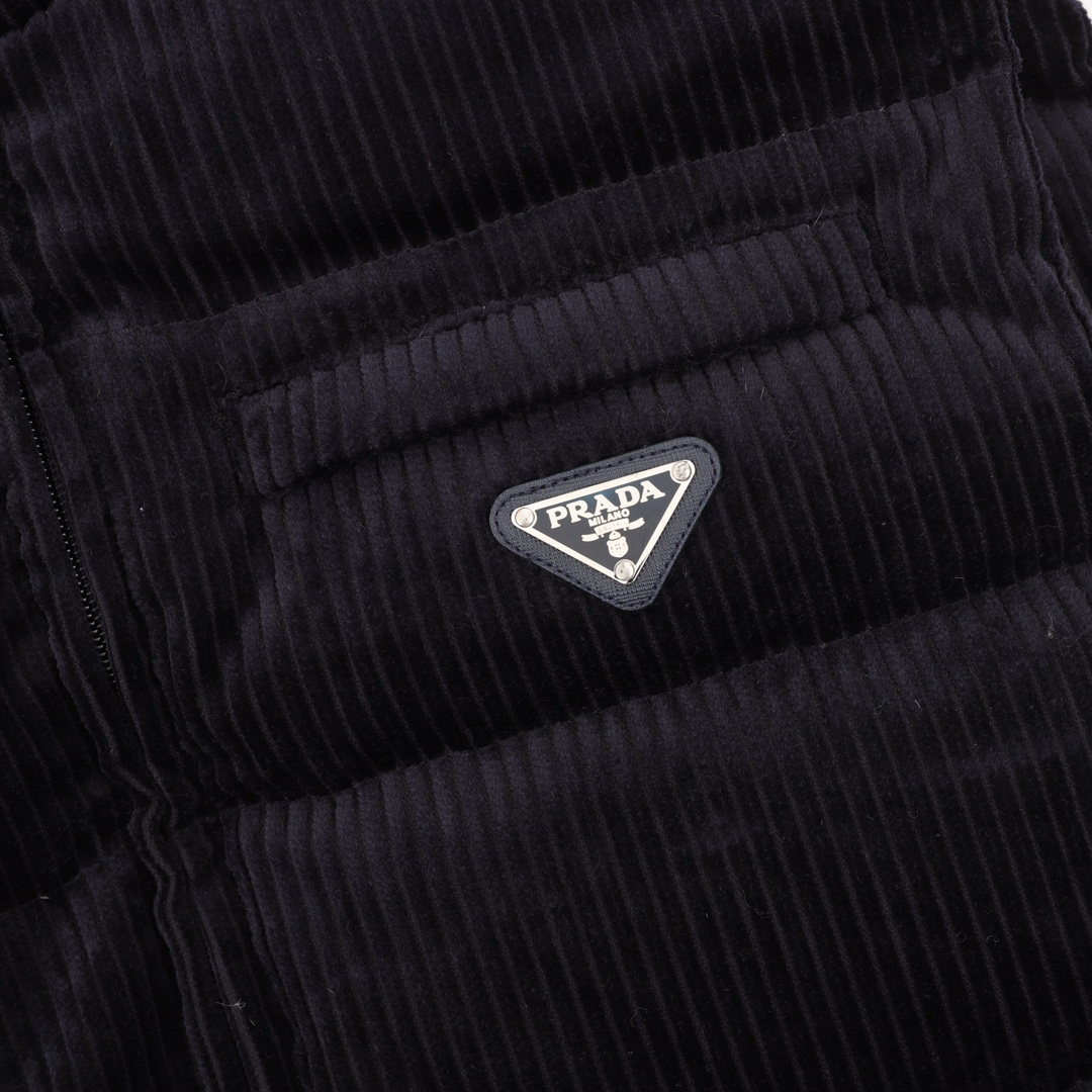 A Prada piece embodying the mix-and-match aesthetic for fall and winter, this cropped corduroy down vest features a "corduroy texture and a cropped silhouette," perfectly blending the brand's signature elements with practical warmth. Replicating the original with meticulous attention to detail, from the custom-woven and custom-dyed corduroy fabric to the brass pulls, every detail showcases luxury quality. The metal triangle logo reinforces the brand's identity, making it versatile and a stylish accent piece, balancing retro style with modern trends. 1. Core Fabric: Custom-Woven, Custom-Dyed Corduroy, Overcoming Pain Points and Demonstrating Ingenuity