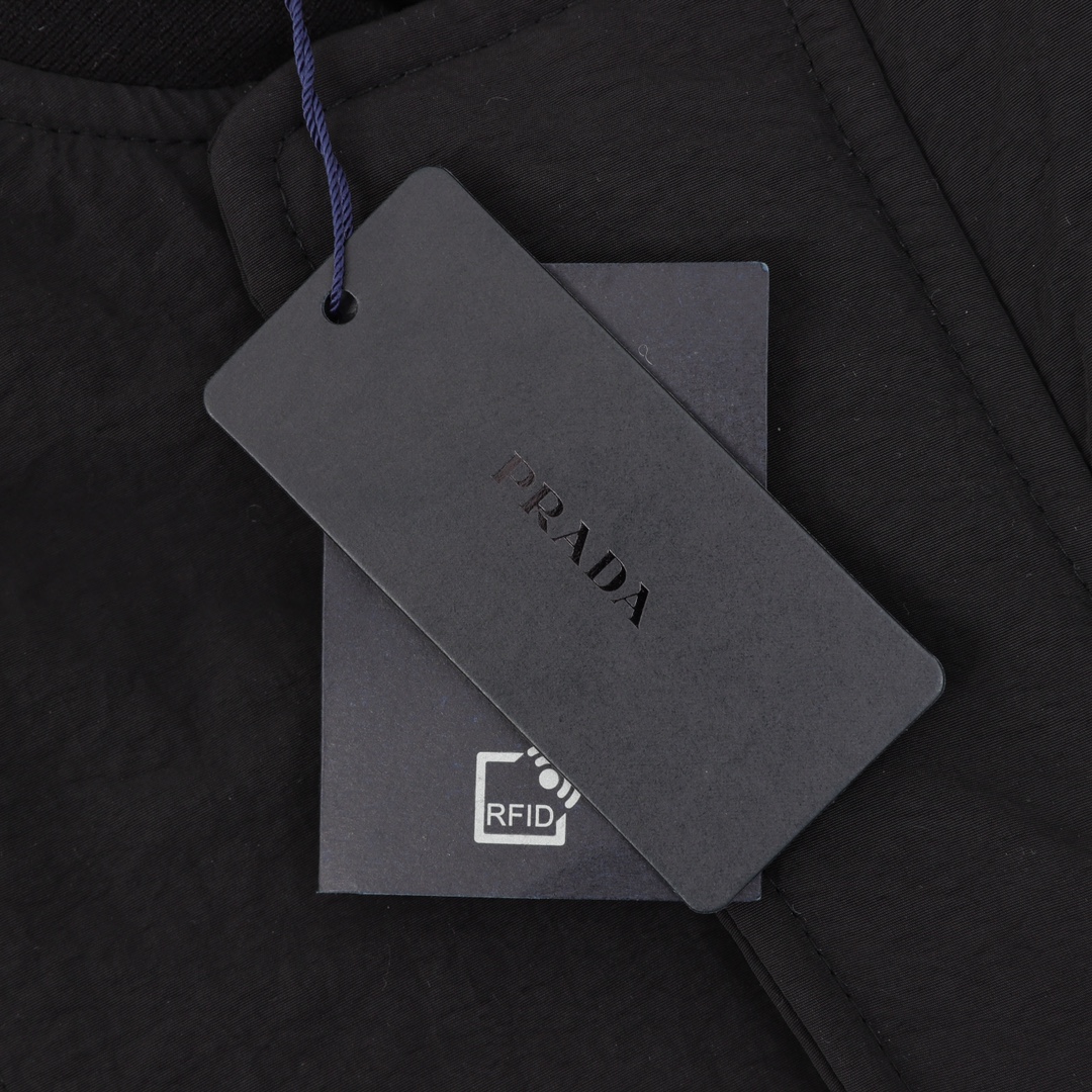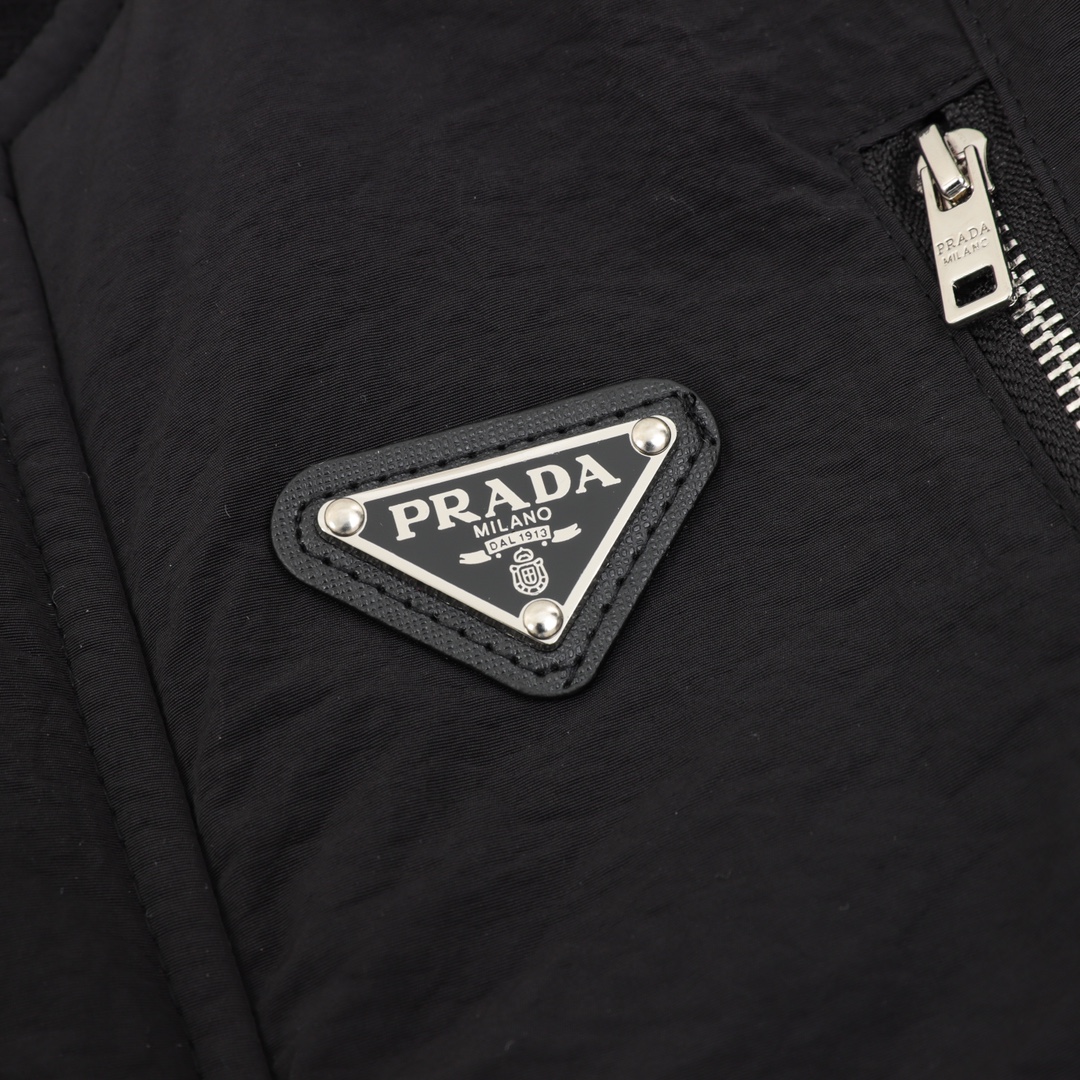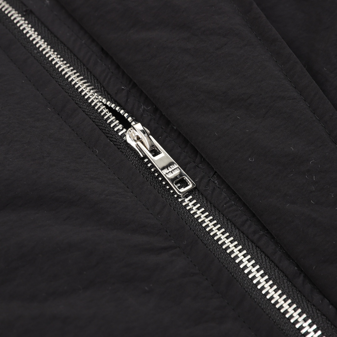 Front slip pockets feature a built-in imported lambswool lining: The front slip pockets conceal a subtle "trick" inside, featuring a built-in imported lambswool lining that serves as the finishing touch to the jacket. The lambswool is fluffy and soft, with a warm and delicate touch. When you insert your hands into the pockets, they feel instantly warm, making it perfect for keeping your hands warm outdoors in autumn and winter. Furthermore, the imported lambswool fibers are fine and uniform, making them less likely to shed or clump, maintaining their fluffy texture over time. The contrast with the pure black fabric enhances practicality while adding a sophisticated touch to the minimalist design, exuding a sense of luxury in a subtle yet understated way. Custom silver metal zipper on the placket: The placket features a custom silver metal zipper with a rich, lustrous finish and a premium metallic finish, creating a striking visual contrast against the pure black fabric and instantly elevating the jacket's stylish appearance. The zipper teeth mesh tightly together, ensuring smooth zippering without any sticking or misalignment. Even with extended use, it resists oxidation, rust, or loosening. The zipper pull is cleverly integrated with PRADA branding, further enhancing brand recognition and distinguishing it from the cheap, traditional metal zippers. This meticulously crafted detail showcases the jacket's craftsmanship.
