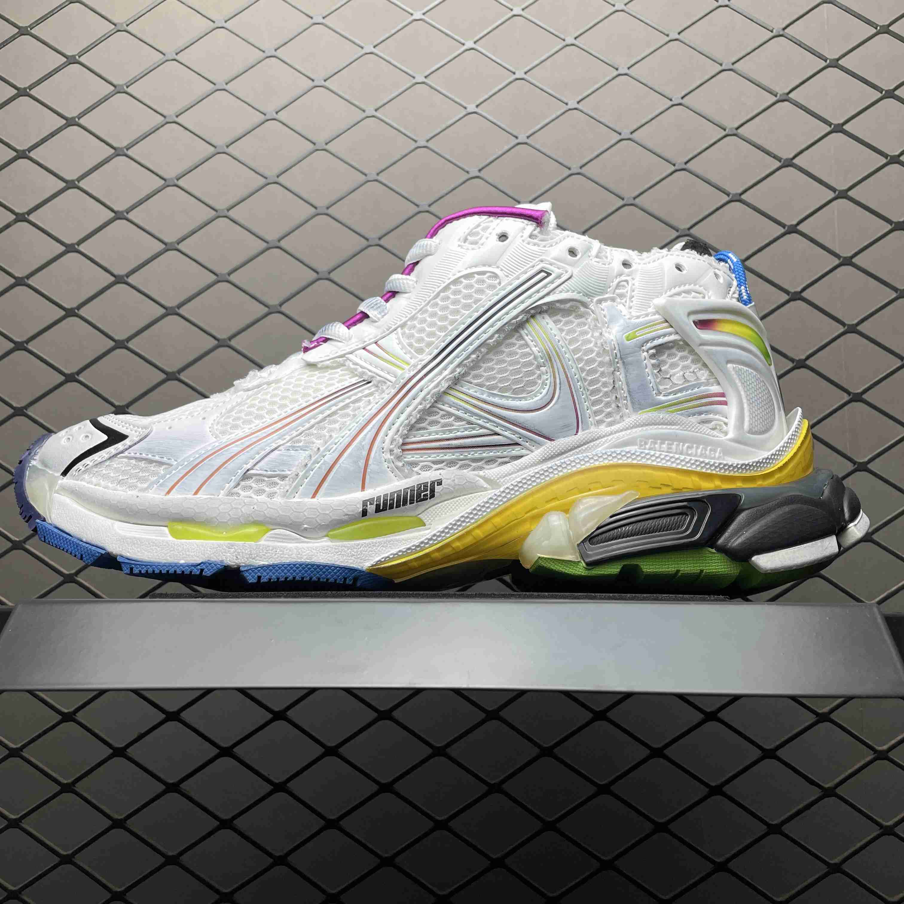 Balenciaga's Runner, a distressed, hand-finished retro sneaker, redefines modern streetwear with its unique design and bold color palette. Combining the comfort of a sneaker with the visual impact of vintage style, this shoe is a favorite among fashionistas. The lightweight, breathable upper features a high-tech mesh, a classic white base accented with vibrant pops of pastel purple, yellow, blue, and green, creating a uniquely distressed look.