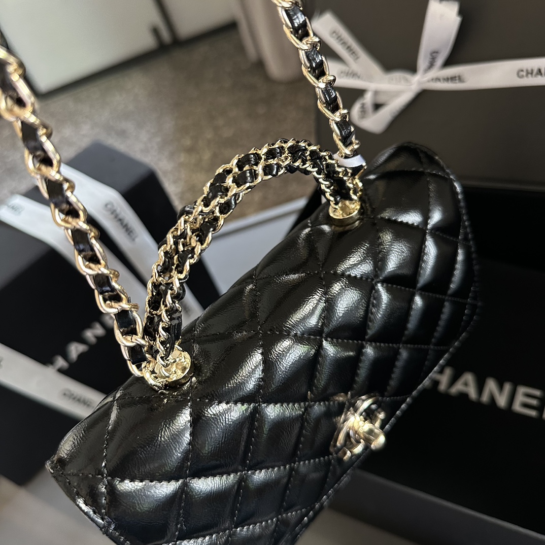 This bag features a leather-through-chain shoulder strap and metal handles, allowing it to be carried by hand or crossbody, making it easy to carry for everyday outings or on dates. The gold metal buckle, embellished with the Chanel Double C logo, adds a refined and elegant touch, enhancing the overall look. Despite its lightweight design, the bag boasts a well-organized interior with multiple card slots and compartments for conveniently storing your phone, cards, cash, and other essentials.