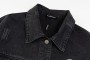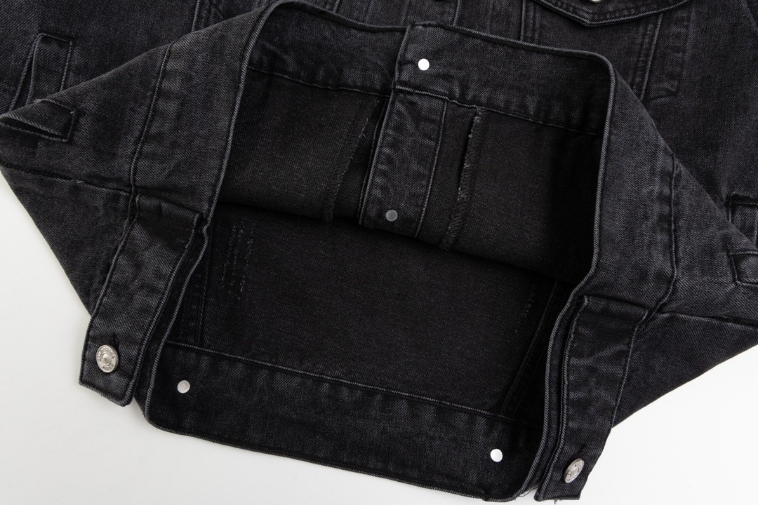 The jacket is made from an exclusive custom-woven, custom-dyed eco-friendly denim fabric, dyed with raw yarn for high color fastness.