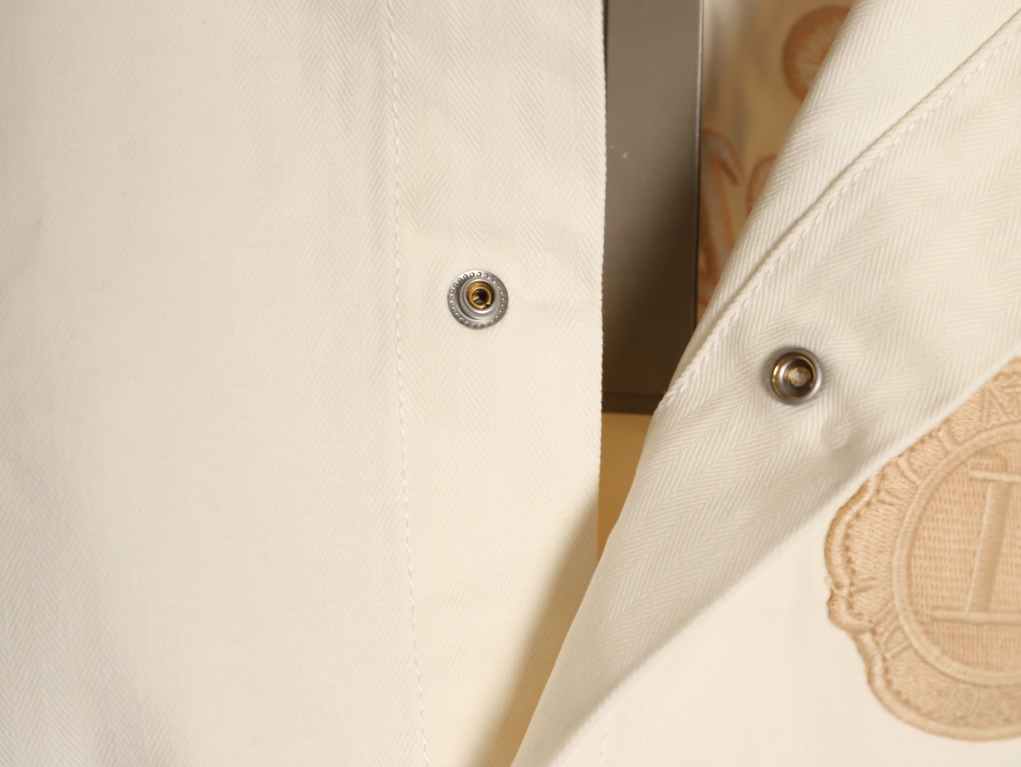 The design draws inspiration from classic American preppy style, seamlessly blending vintage charm with modern chic. The off-white denim fabric exudes a fresh, clean aesthetic, complemented by the signature embroidery and metal buttons, embodying the energy and elegance of American preppy style while avoiding an overly heavy, retro feel, more in line with contemporary aesthetics. Whether you're out and about or on campus, this jacket easily creates a youthful, youthful vibe, perfect for a variety of lifestyles.