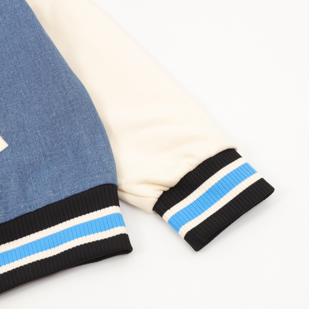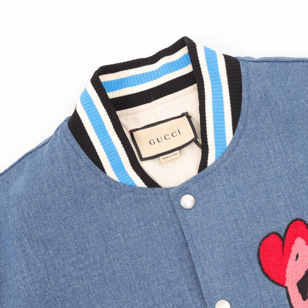 This Gucci baseball jacket is crafted from patchwork blue denim, boasting a unique texture and rich color, perfectly showcasing Gucci's meticulous pursuit of high-quality fabrics. Every stitching is meticulously crafted to ensure a perfect balance of visual impact and wearability, showcasing Gucci's meticulous craftsmanship.