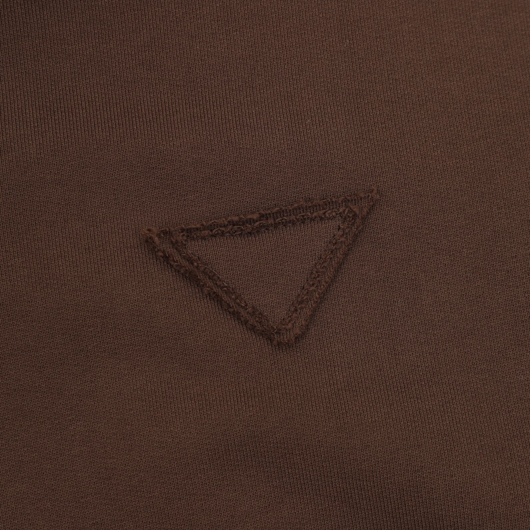 Half Zip Closure: The front features a half-zip closure, featuring a custom Prada zipper that provides smooth, secure movement and resists damage over time. The zipper pull features a hidden branding detail, and the metallic finish creates a subtle contrast with the fabric, enhancing the overall look. The half-zip design allows for versatile styling, creating a simple, sophisticated look when closed and a casual, relaxed feel when open. It can be adjusted to suit any occasion and style, breaking the monotony of a sweatshirt. IV. Signature Element: Fabric Triangle Logo, Understatedly Embossed Brand Identity