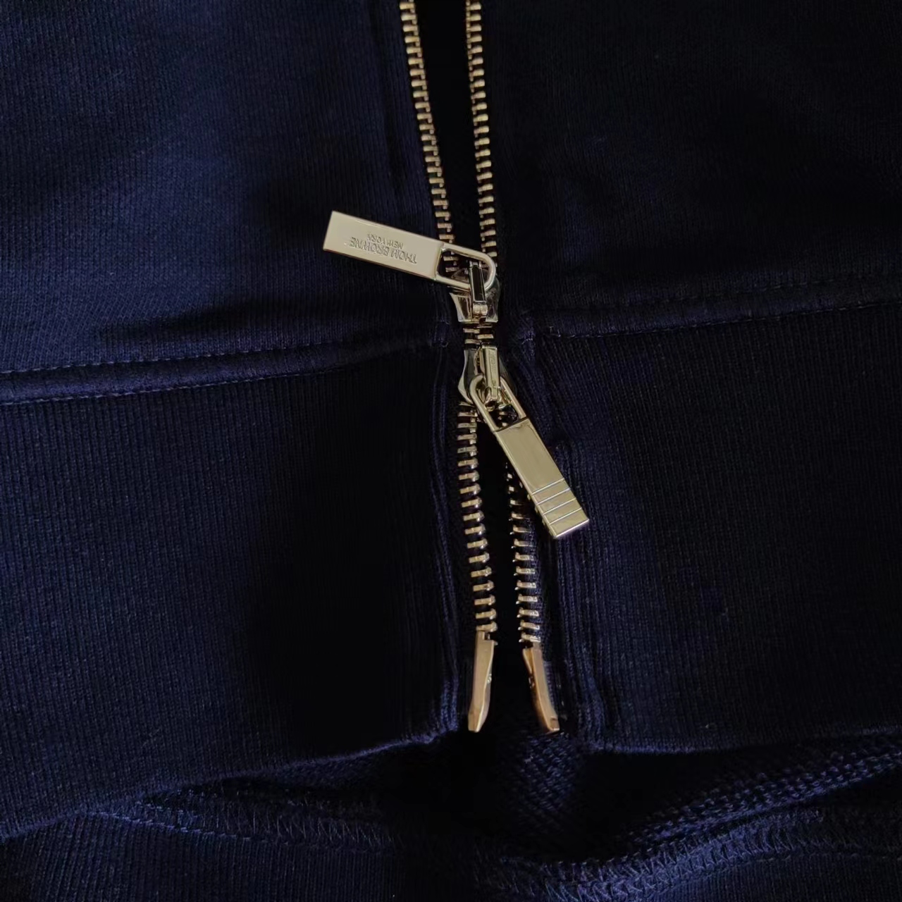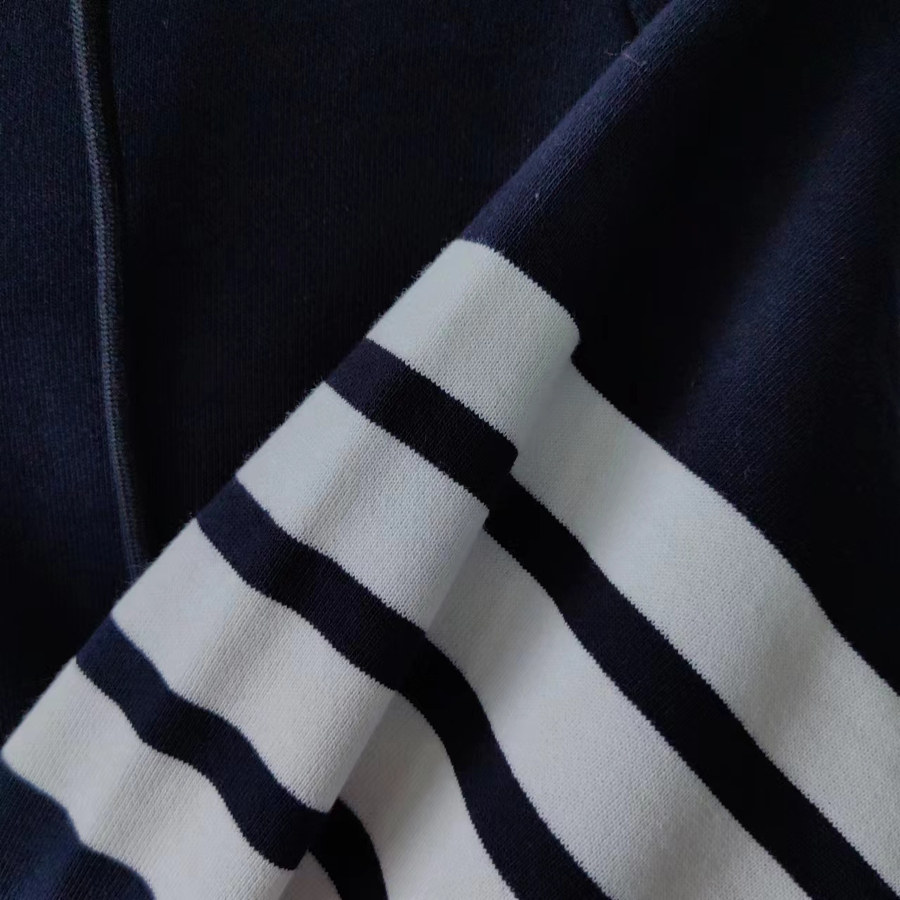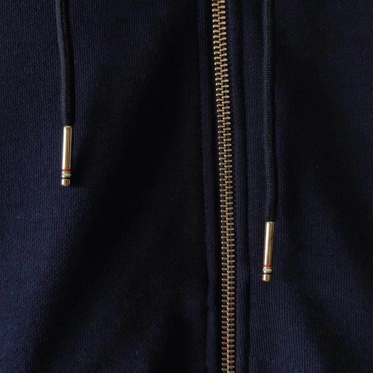 Thom Browne's four-bar design has always been a signature element. This jacket features contrasting white stripes on the sleeves, breaking the monotony and adding a sense of layering and dynamism. The four white stripes not only reflect the brand's signature style but also enhance the garment's visual impact, creating a striking blend of sporty and sophisticated aesthetics.