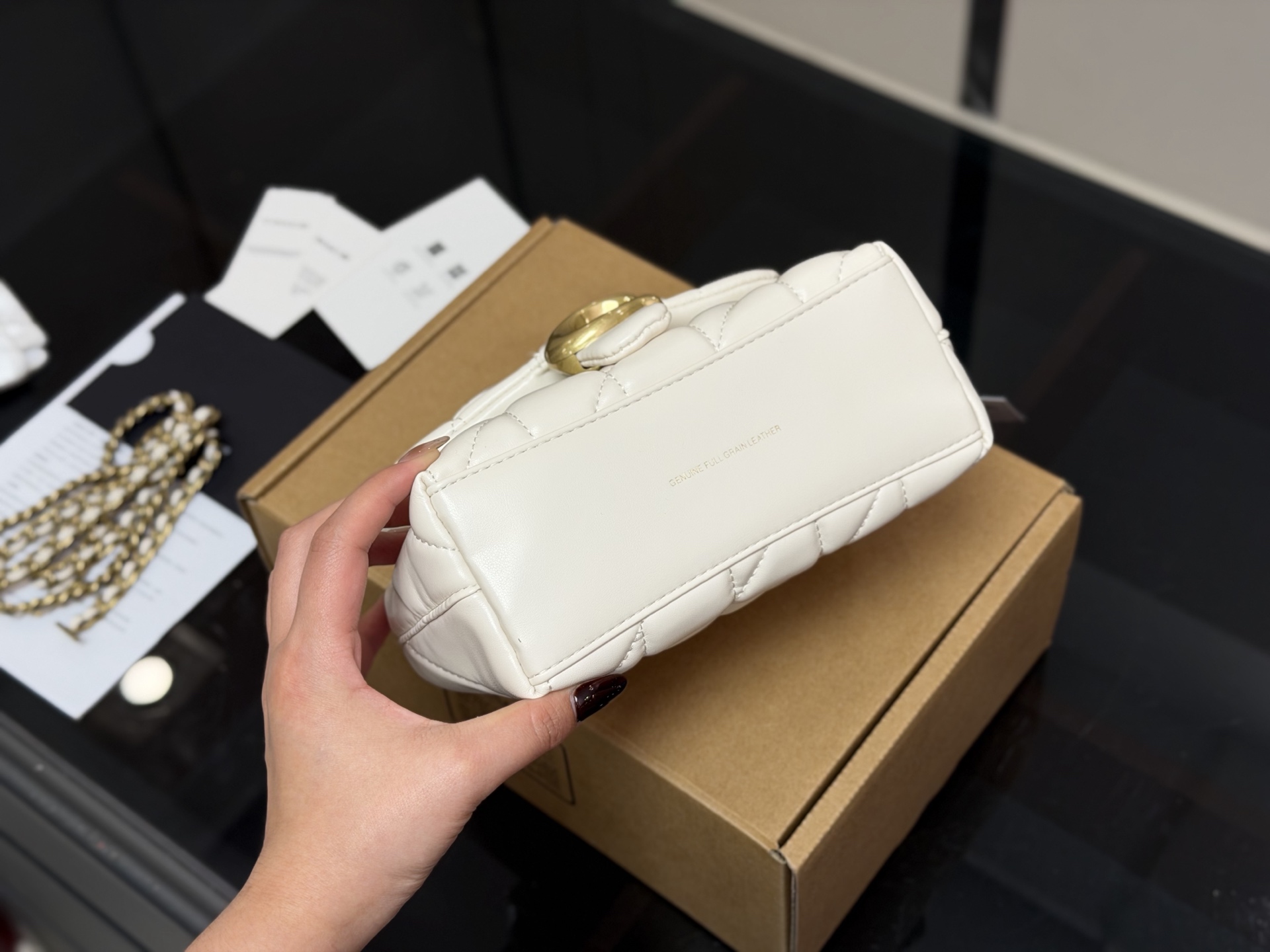 The bag is crafted from Nappa leather, which is not only durable but also incredibly soft and accommodating, providing a very comfortable feel. Furthermore, this leather develops a deeper, more vibrant hue, and its luster and texture will gradually improve with use, elevating its sophistication with every use.
