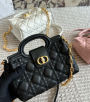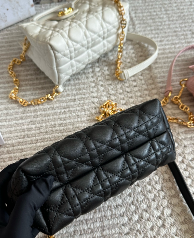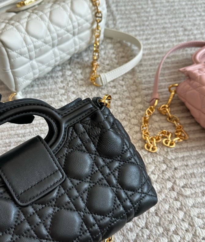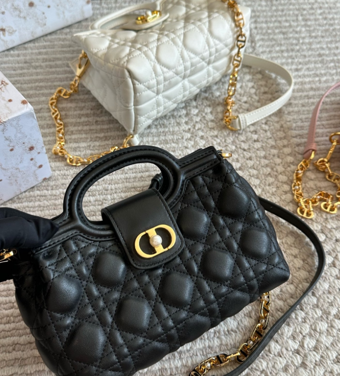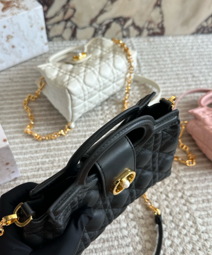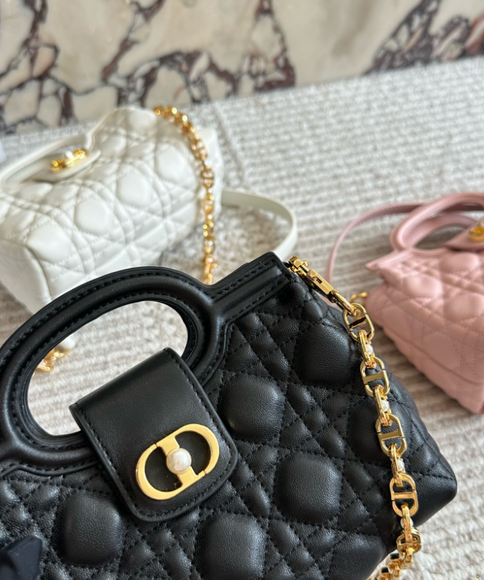 The DIOR Jolie Handle mini bag is crafted from cannage lambskin leather for a soft, refined feel, showcasing a luxurious feel. White resin beads and the iconic CD buckle add a unique decorative touch and brand identity. The versatile design allows for hand, shoulder, or crossbody carry, making it an ideal choice for any occasion. Its mini size makes it easy to carry anywhere, and its understated black color makes it a versatile choice for both everyday travel and sophisticated styling.