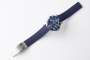The flexible blue rubber strap fits snugly on the wrist, providing a comfortable and lightweight look. It combines sporty and stylish elements, perfect for both the city and the outdoors.