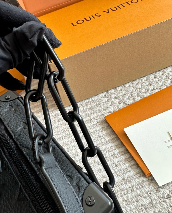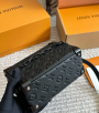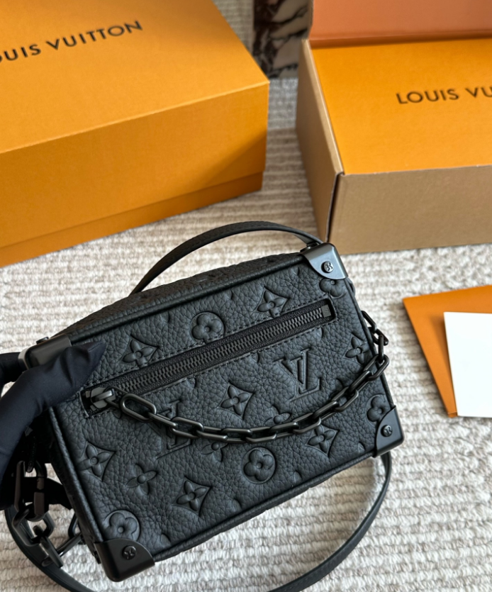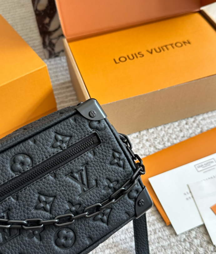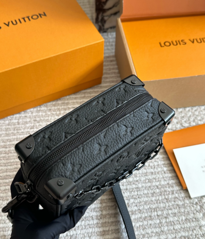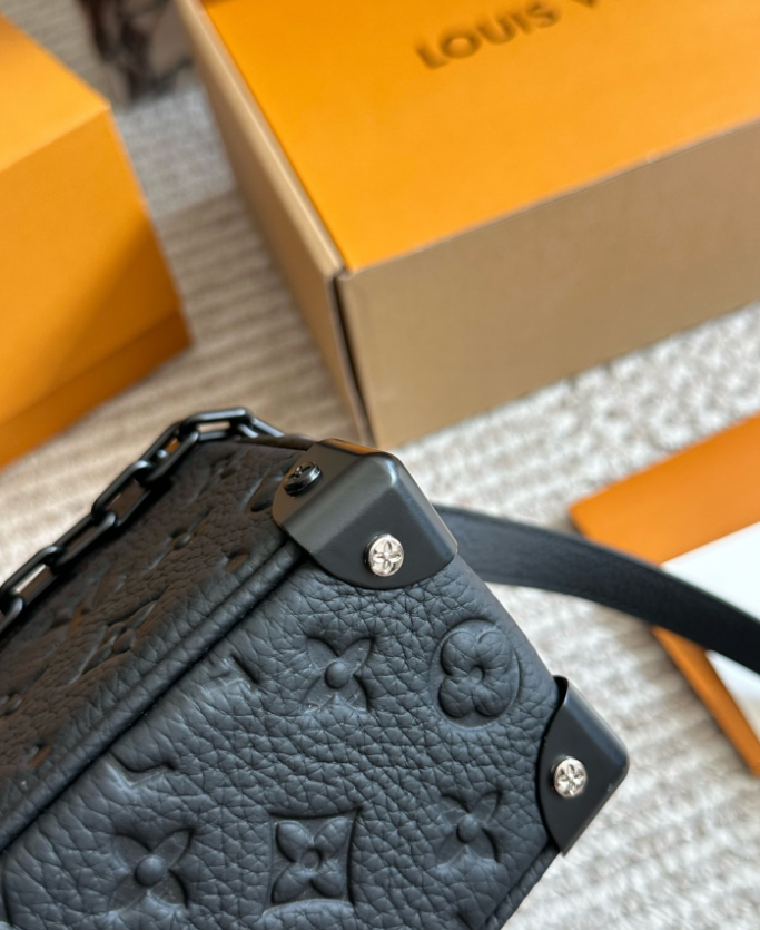This Soft Trunk mini bag embodies the iconic design of Louis Vuitton luggage. Crafted from the brand's classic Monogram embossed cowhide, it features an all-black hue and sculpted lines, showcasing a modern, rugged style. The boxy "box" shape draws inspiration from the brand's heritage in hardcase craftsmanship, maintaining a sense of structure while remaining lightweight and portable.Crafted from high-quality grained leather and accented with black hardware, the bag exudes understated luxury. The interior is spacious enough for everyday essentials like a phone, card holder, and keys. The adjustable leather shoulder strap allows for crossbody or shoulder carry, making it a versatile choice for both urban and casual occasions.