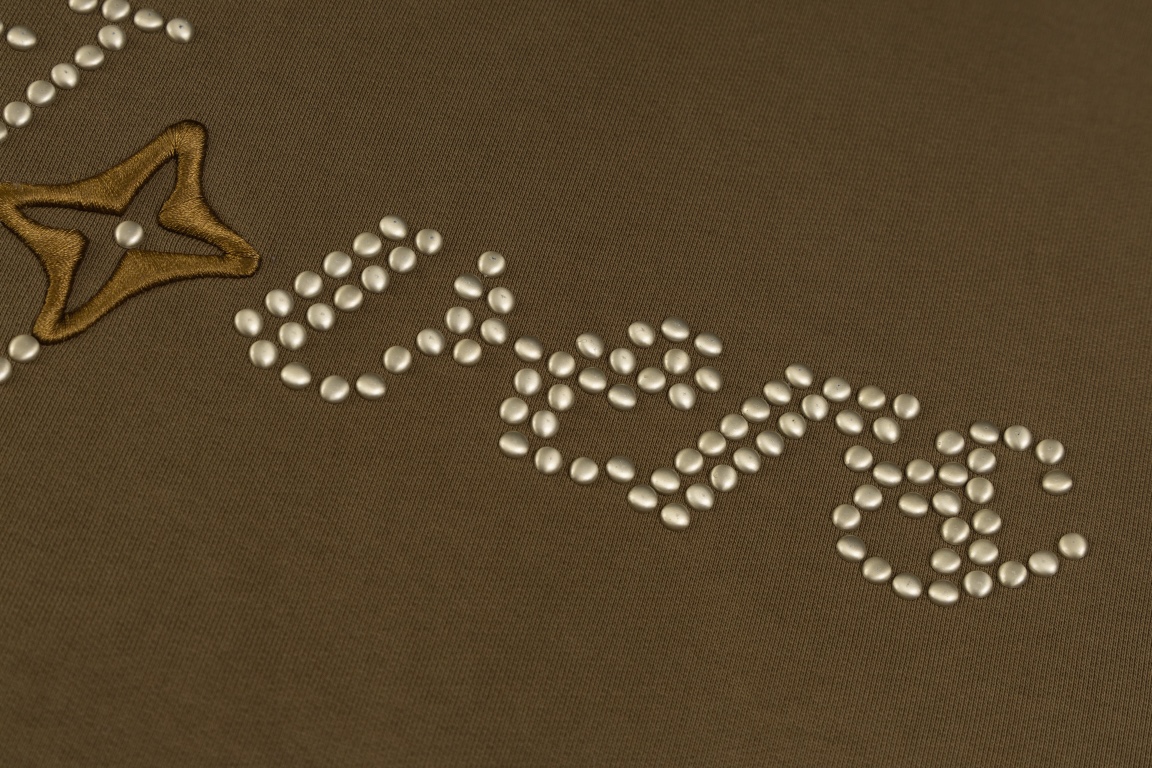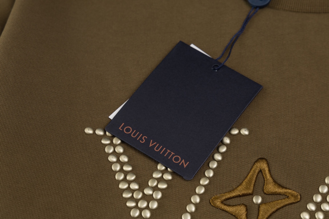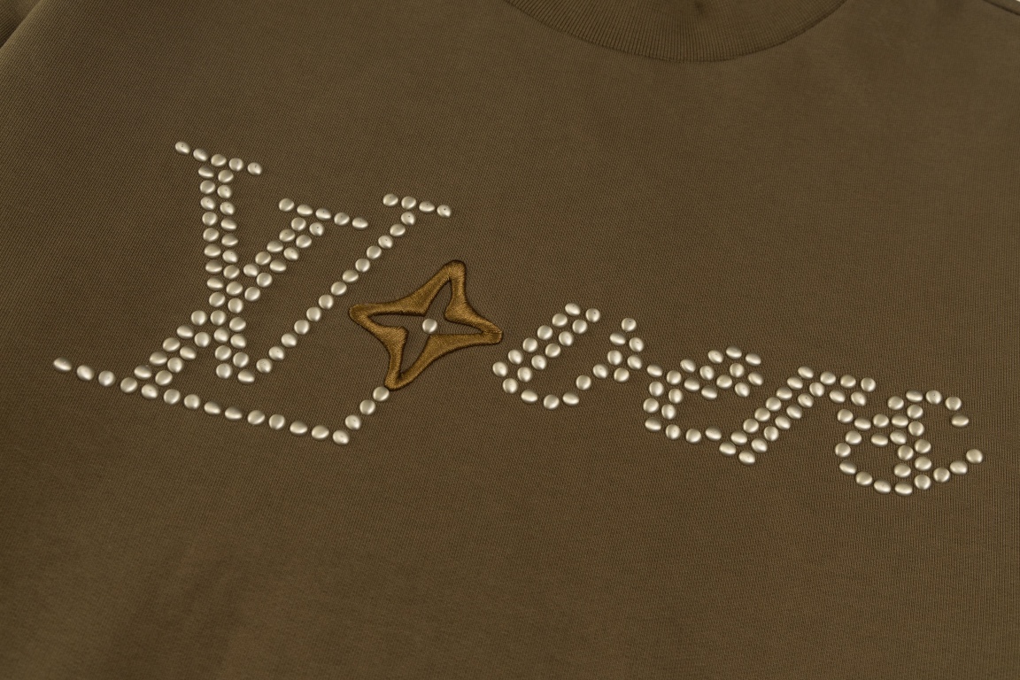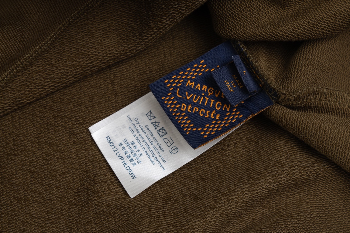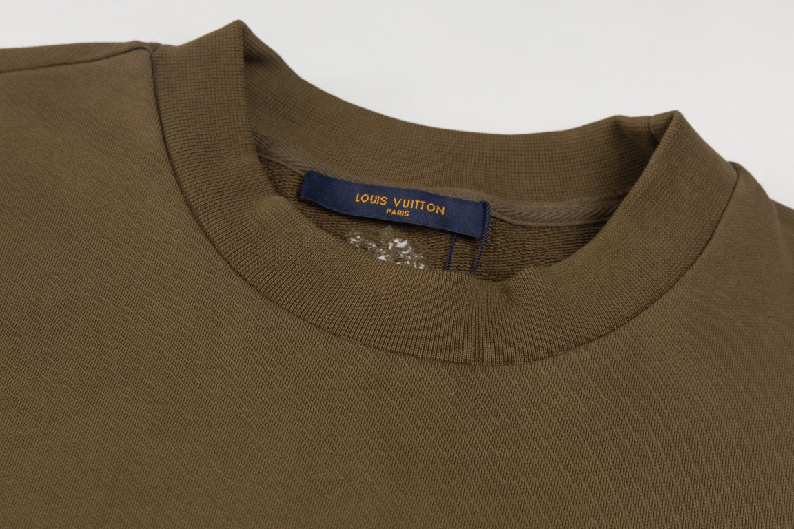 One of the highlights of this sweatshirt is its 3D embroidery. Using computer-generated scanning technology, the signature Louis Vuitton lettering and motifs are meticulously reproduced, ensuring clarity and layered texture. The embroidery utilizes approximately 100 stitches, resulting in a highly precise, three-dimensional effect that breaks away from the monotony of traditional flat embroidery. The Marque L.Vuitton Déposée logo and LV monogram embroidery on the front and back create a hand-knitted, optical illusion, adding an artistic touch and visual impact to the sweatshirt.
