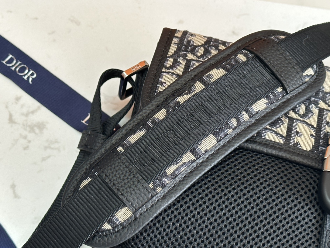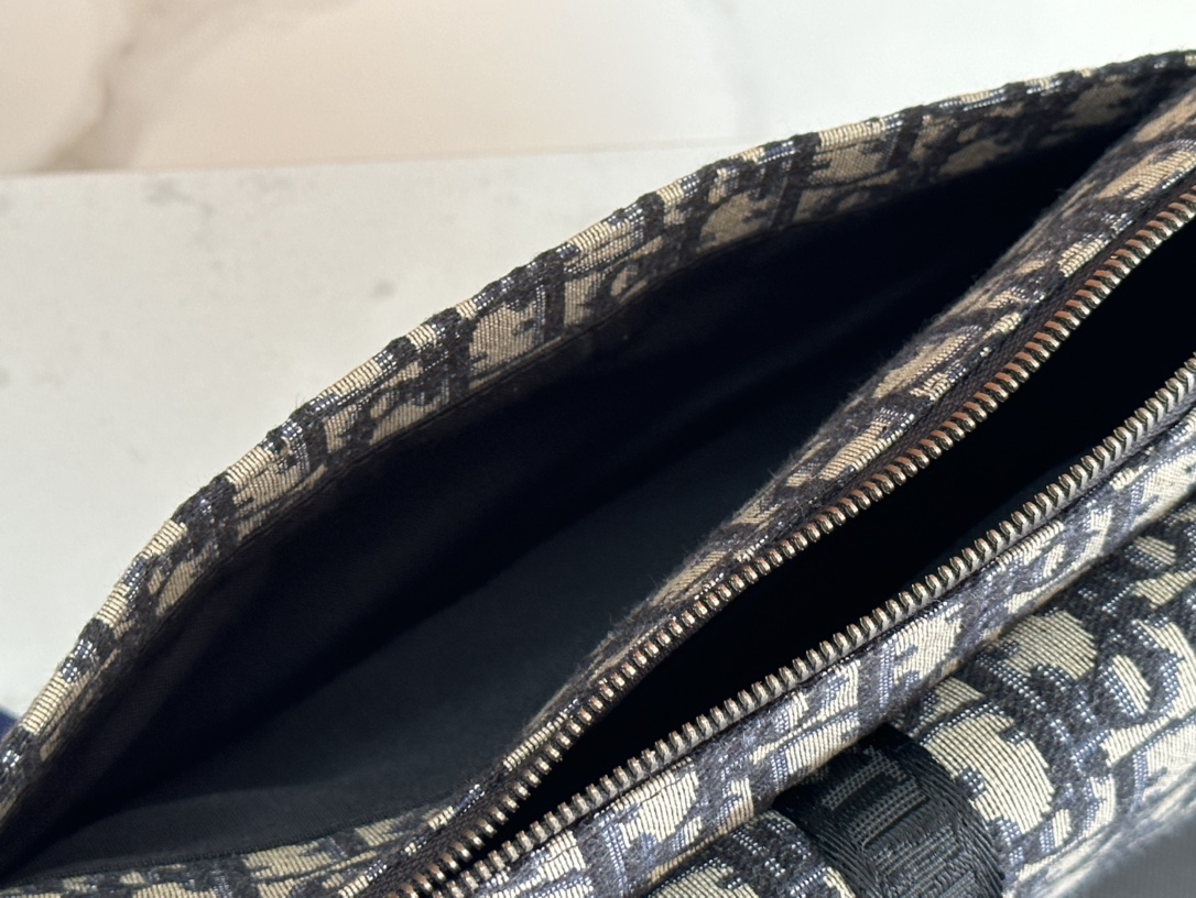 The adjustable nylon jacquard shoulder strap with the Christian Dior logo allows for shoulder or crossbody wear, making it versatile.
