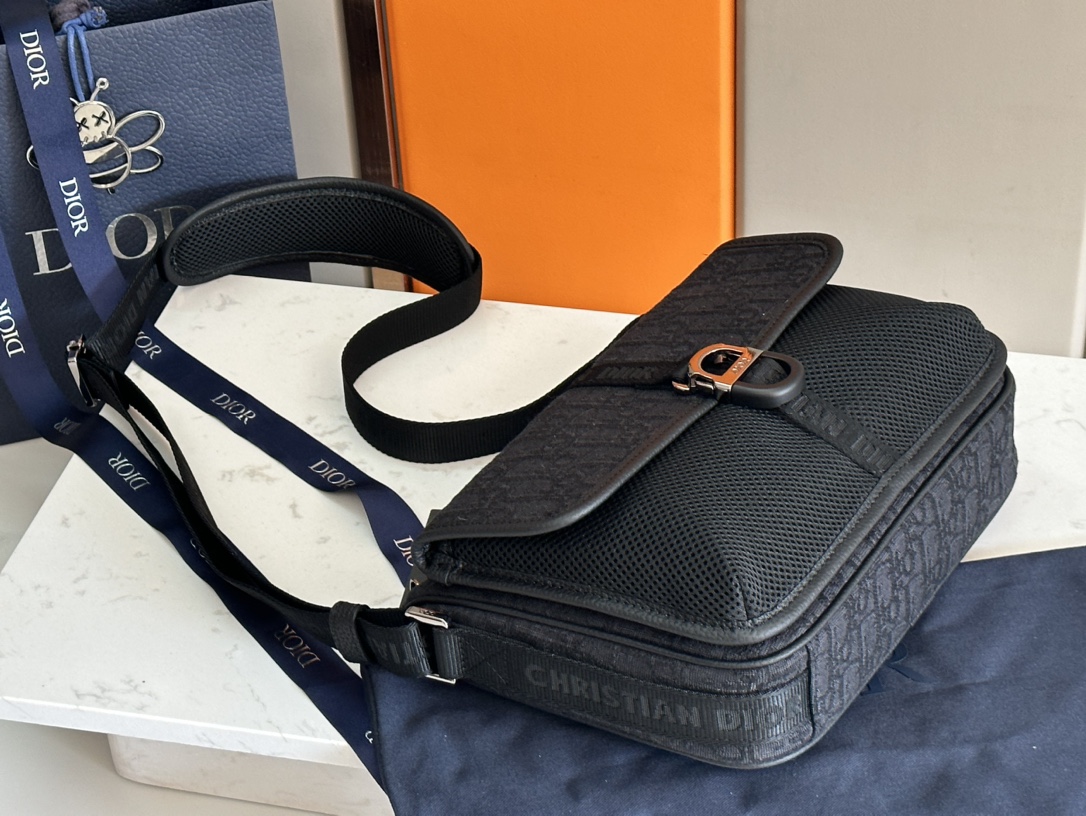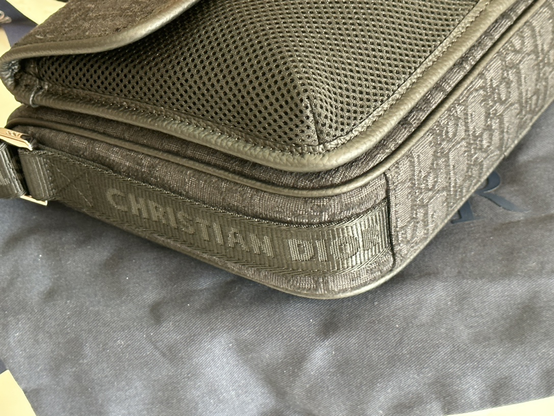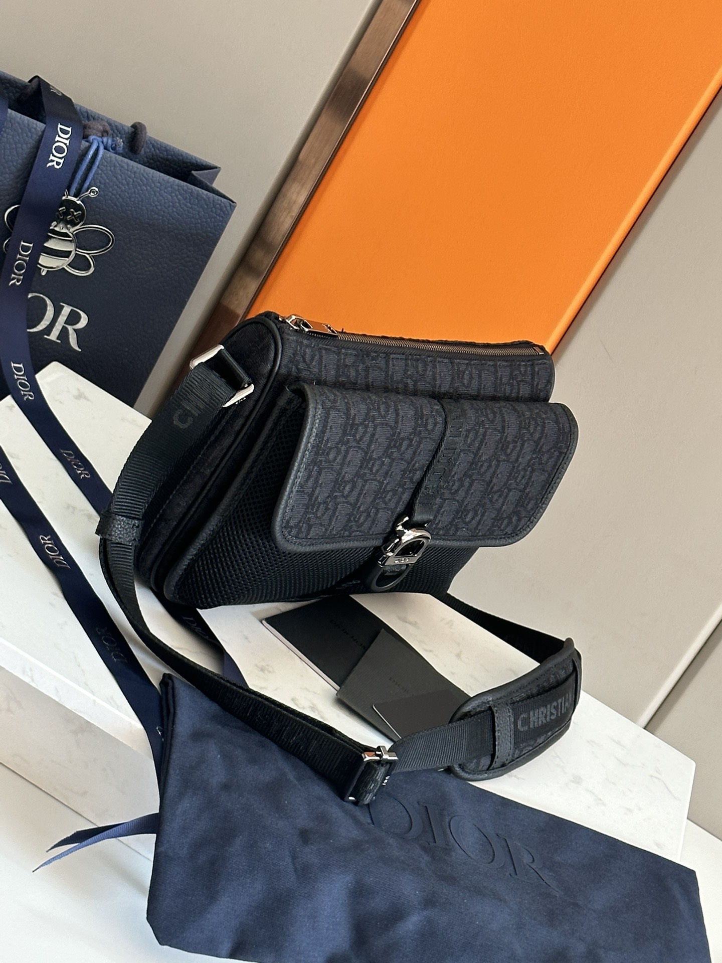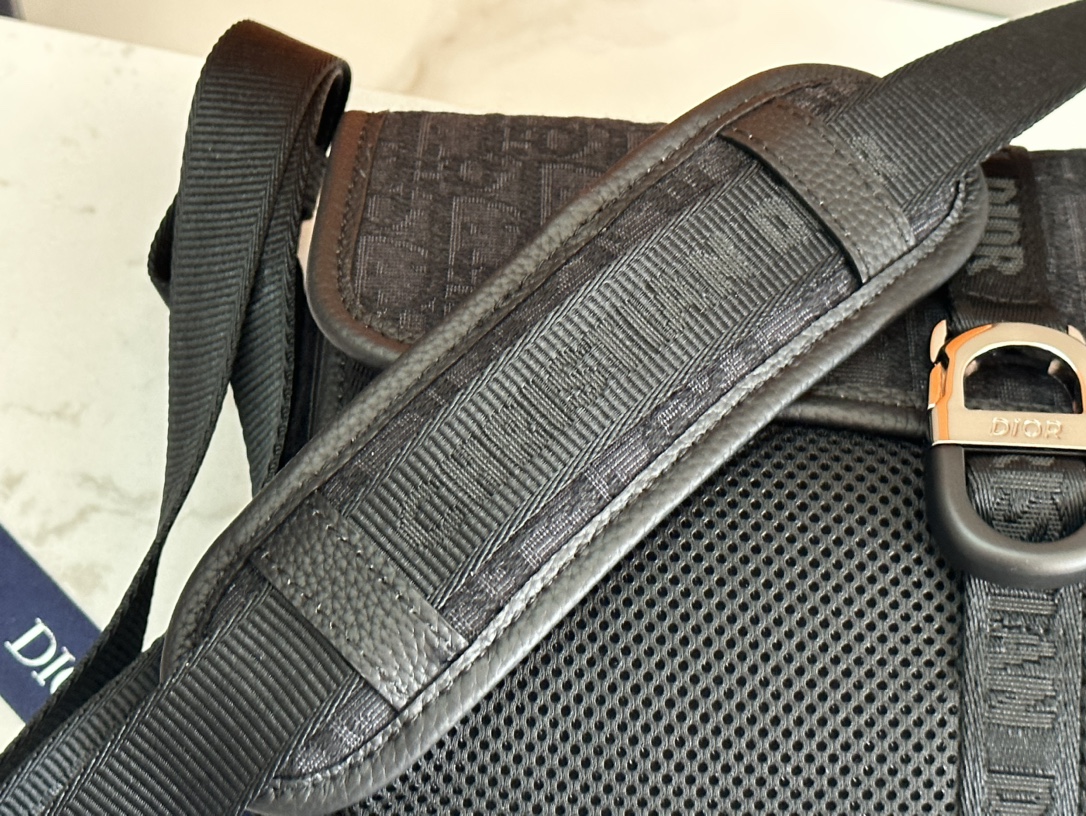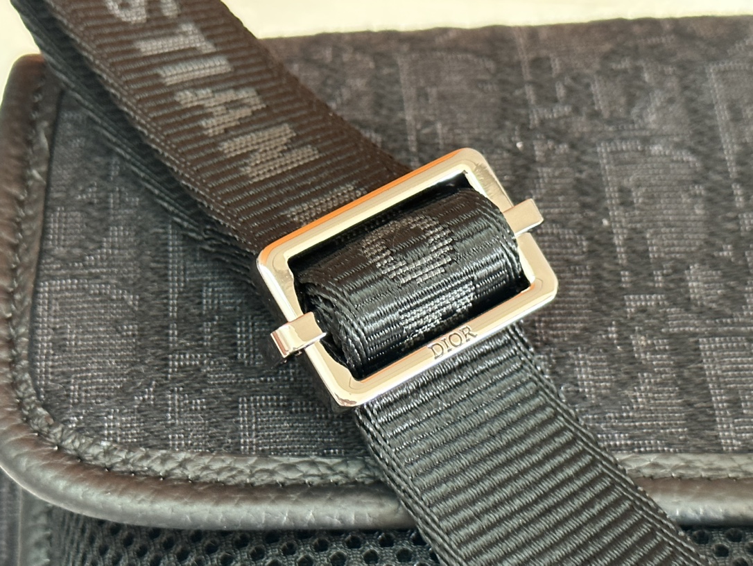 The adjustable nylon jacquard strap with the Christian Dior logo allows for versatile shoulder and crossbody carry.