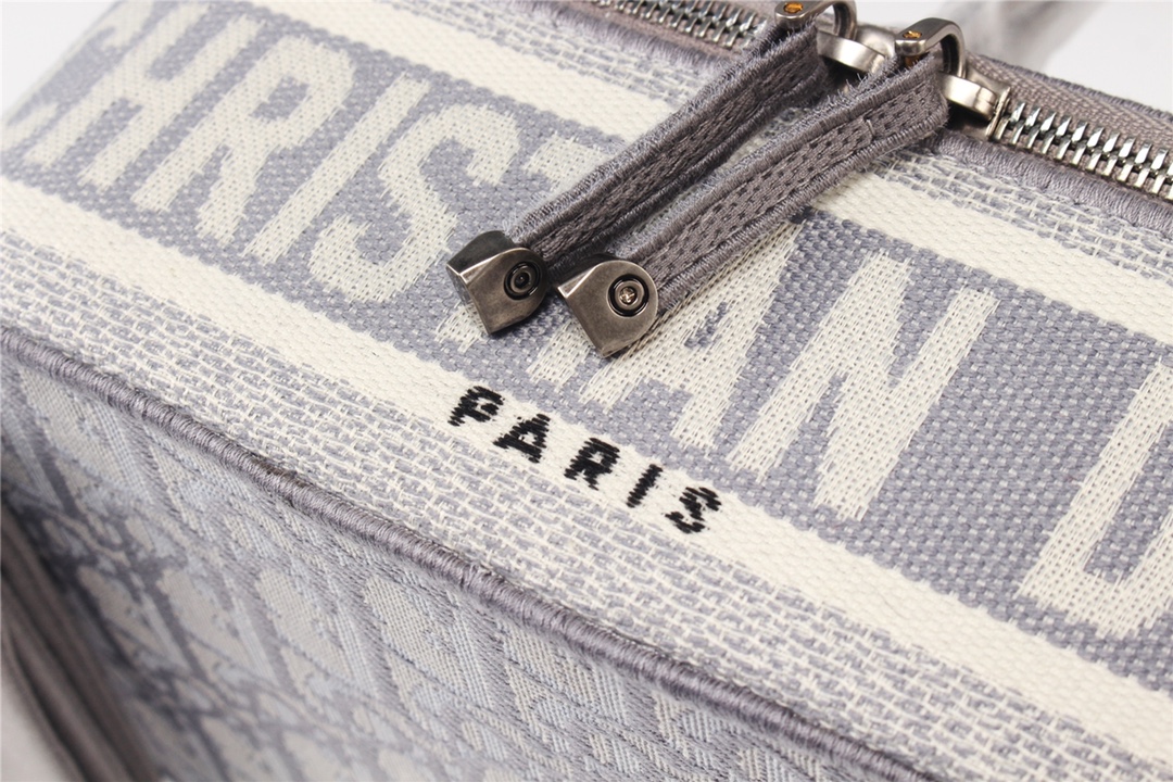 The bag features Dior's signature monogram embroidery technique, creating a three-dimensional, intricate texture that creates a luxurious yet lightweight feel. The square, rounded silhouette retains a vintage feel while incorporating a modern, stylish aesthetic, making it an eye-catching accessory whether carried by hand or stowed in luggage.
