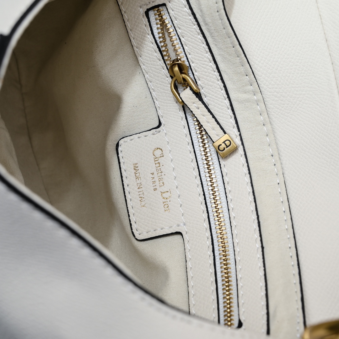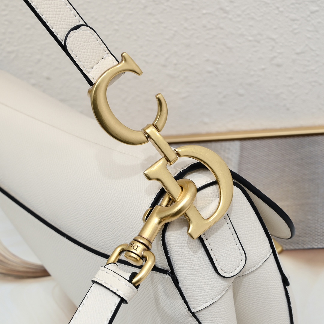The Dior Saddle Bag is one of Dior's most iconic designs, having left a lasting mark on fashion history since its creation. Continuing the classic saddle shape, the bag is meticulously crafted from soft white palm-grained calfskin leather, boasting a refined texture and sleek lines, showcasing the Dior ateliers' ultimate pursuit of elegance and craftsmanship.
