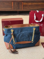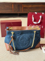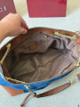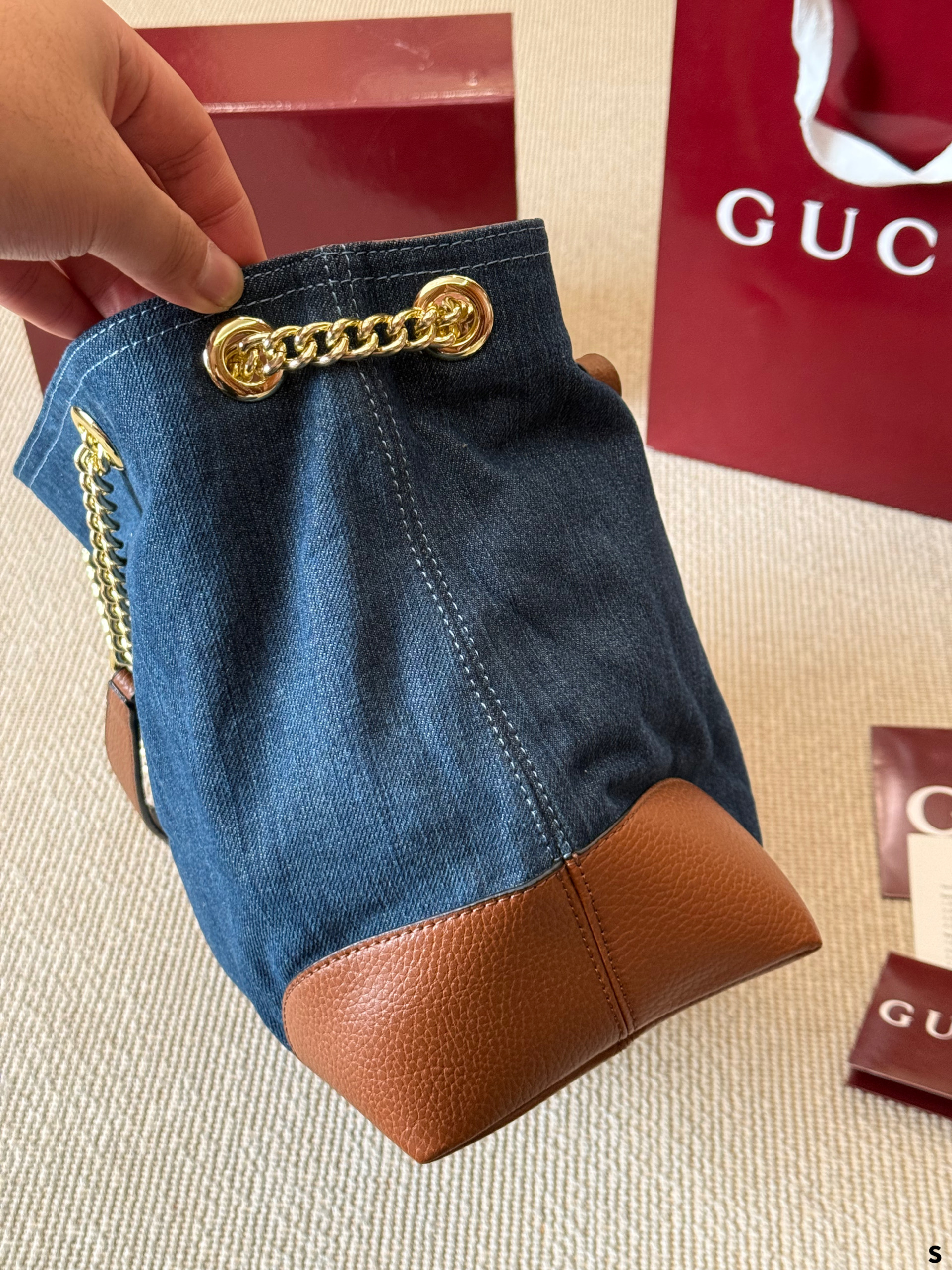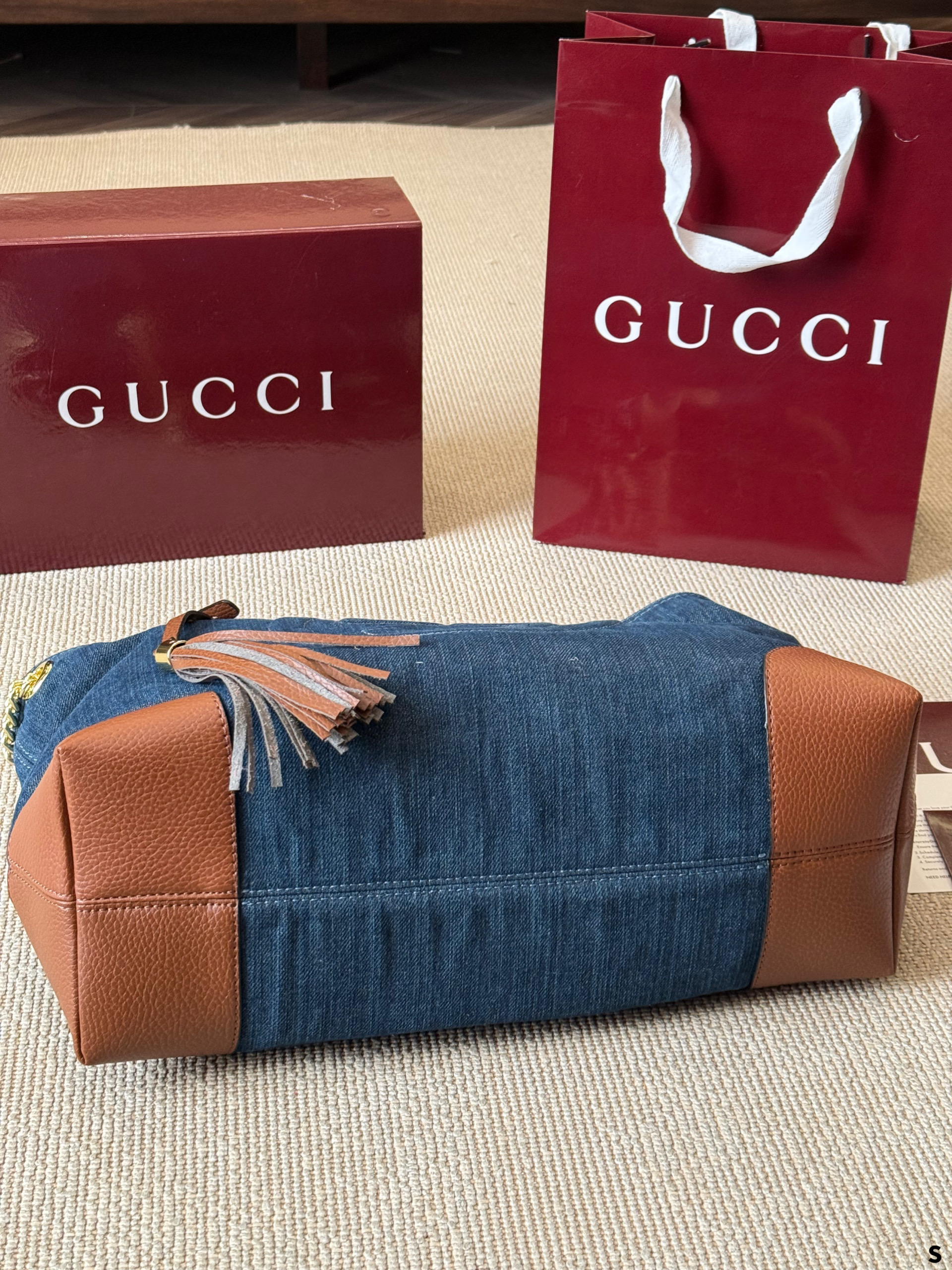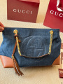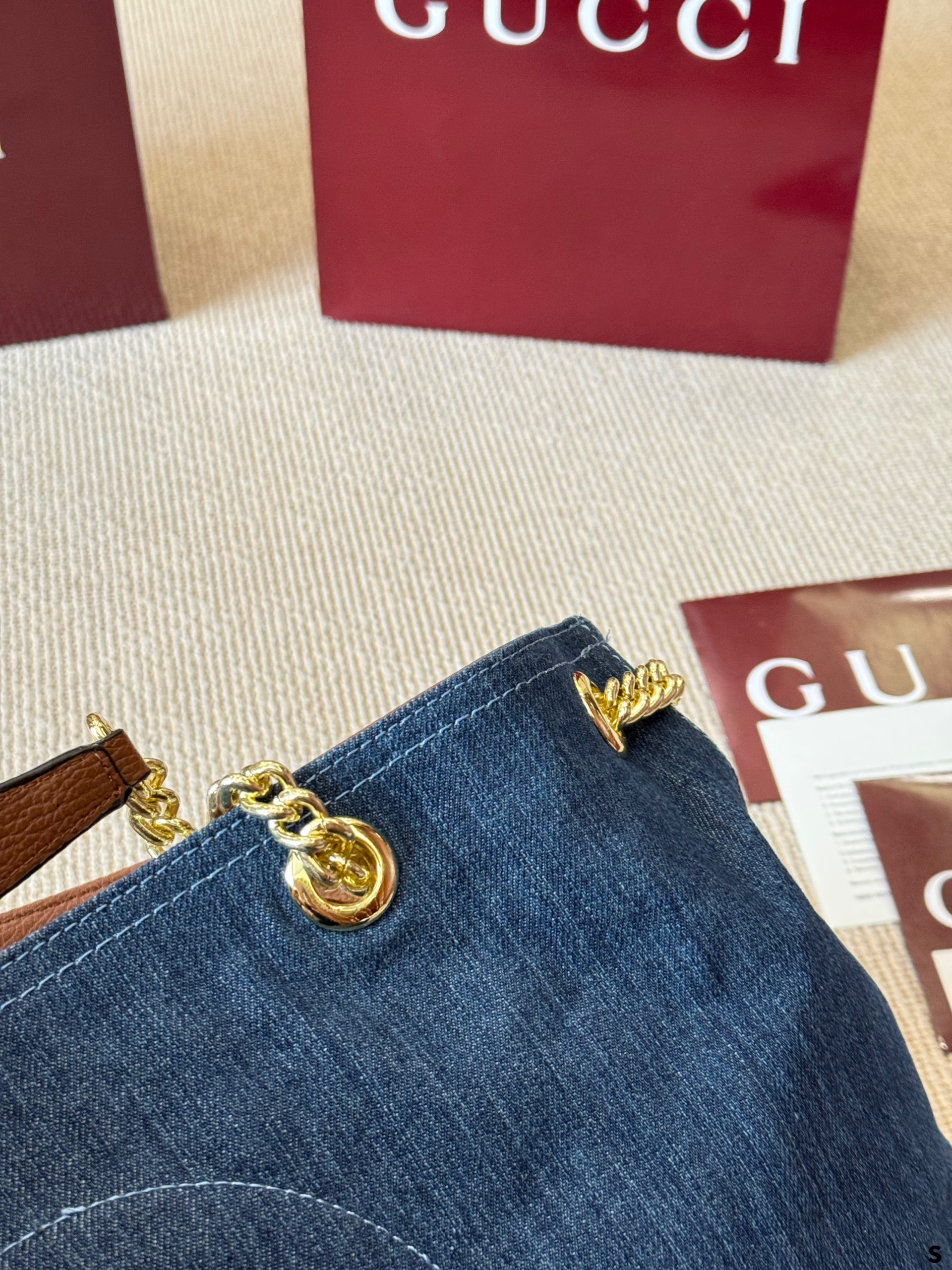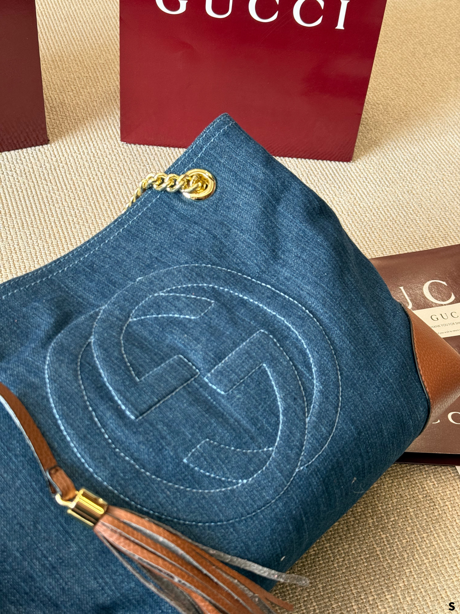 Gucci's classic Soho collection features a new denim tassel chain bag, crafted from soft washed blue denim, showcasing a vintage, casual aesthetic. The quilted design and embroidered Double G logo create a simple yet instantly recognizable design. The signature tassel zipper complements the metal chain, adding a touch of playfulness and sophistication. The lightweight silhouette and perfectly sized compartments make it perfect for everyday travel. Whether you're out and about or heading out on the weekend, it exudes a casual yet elegant modern vibe.
