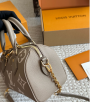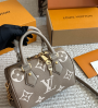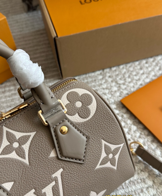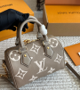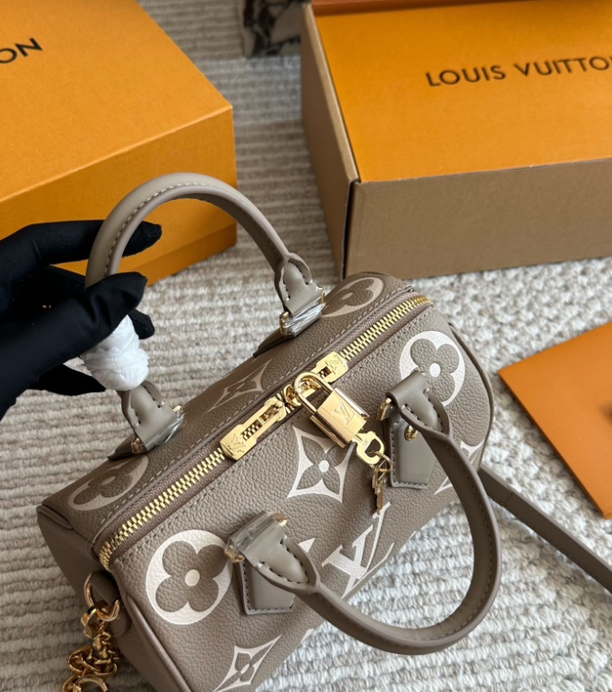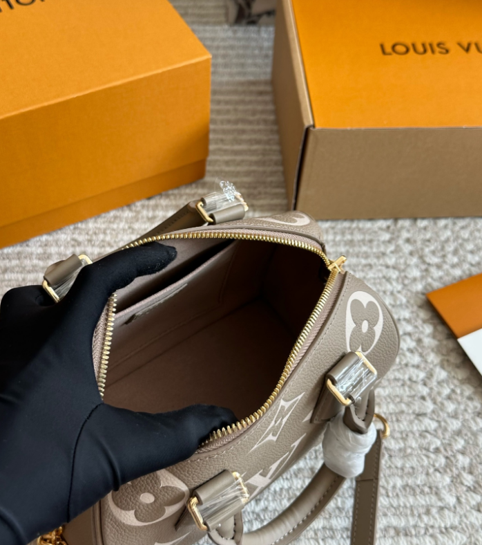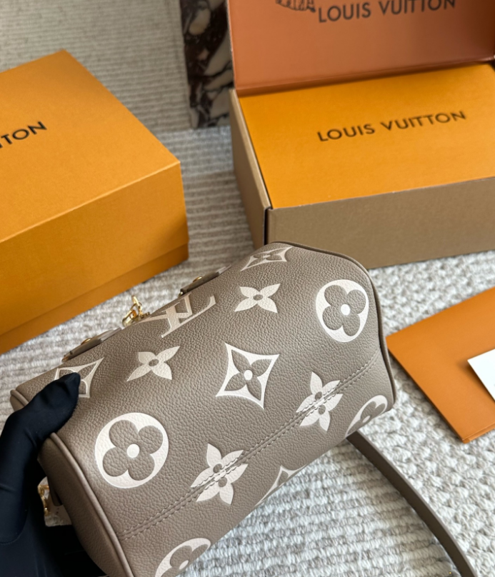 Expertly crafted from supple Monogram Empreinte embossed grain cowhide, the Speedy Bandoulière 20 perfectly blends the classic pillow bag shape with modern elegance. Its soft beige-grey hue, accented by gold hardware and the signature padlock design, exudes a refined touch.