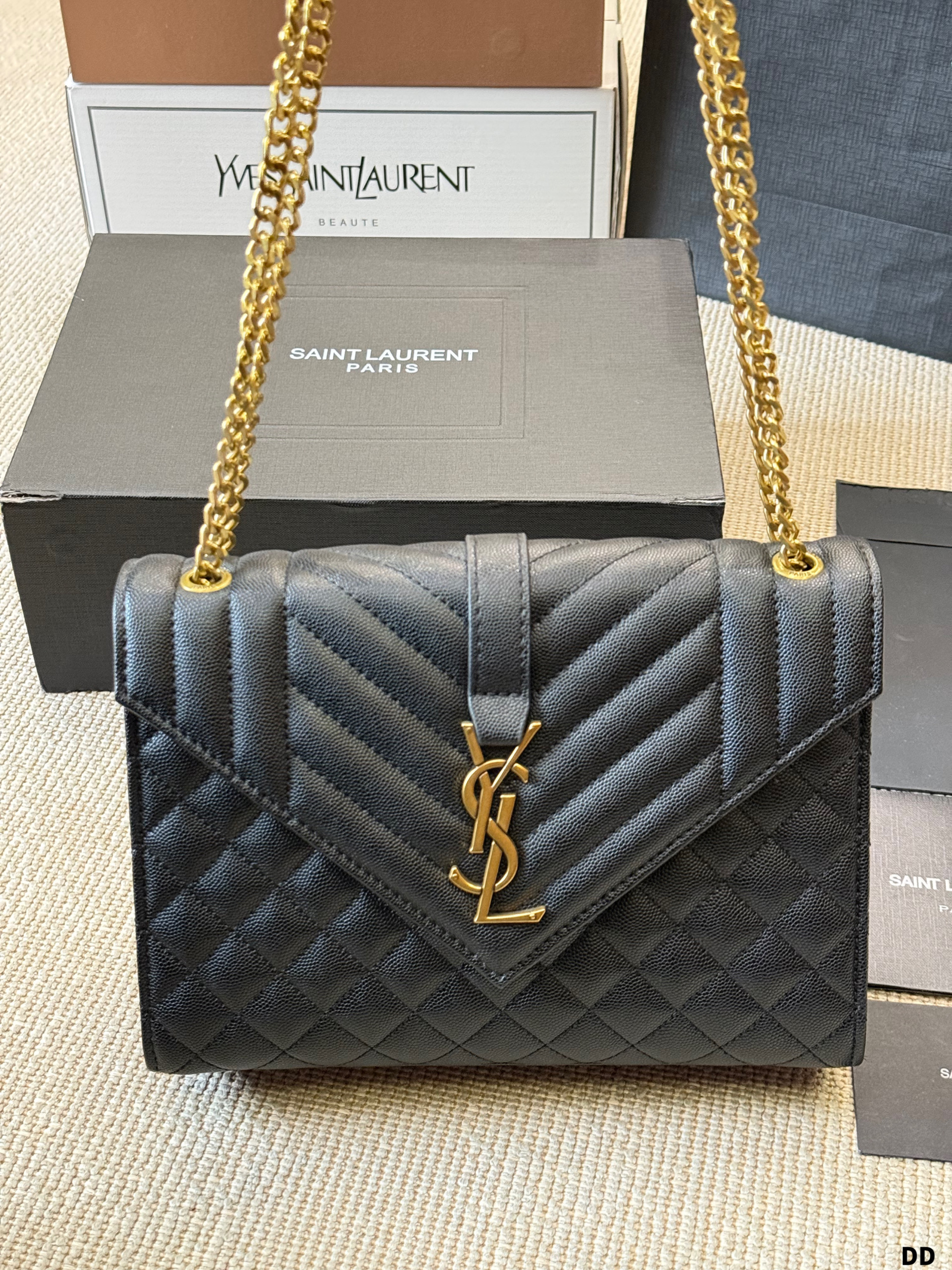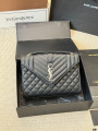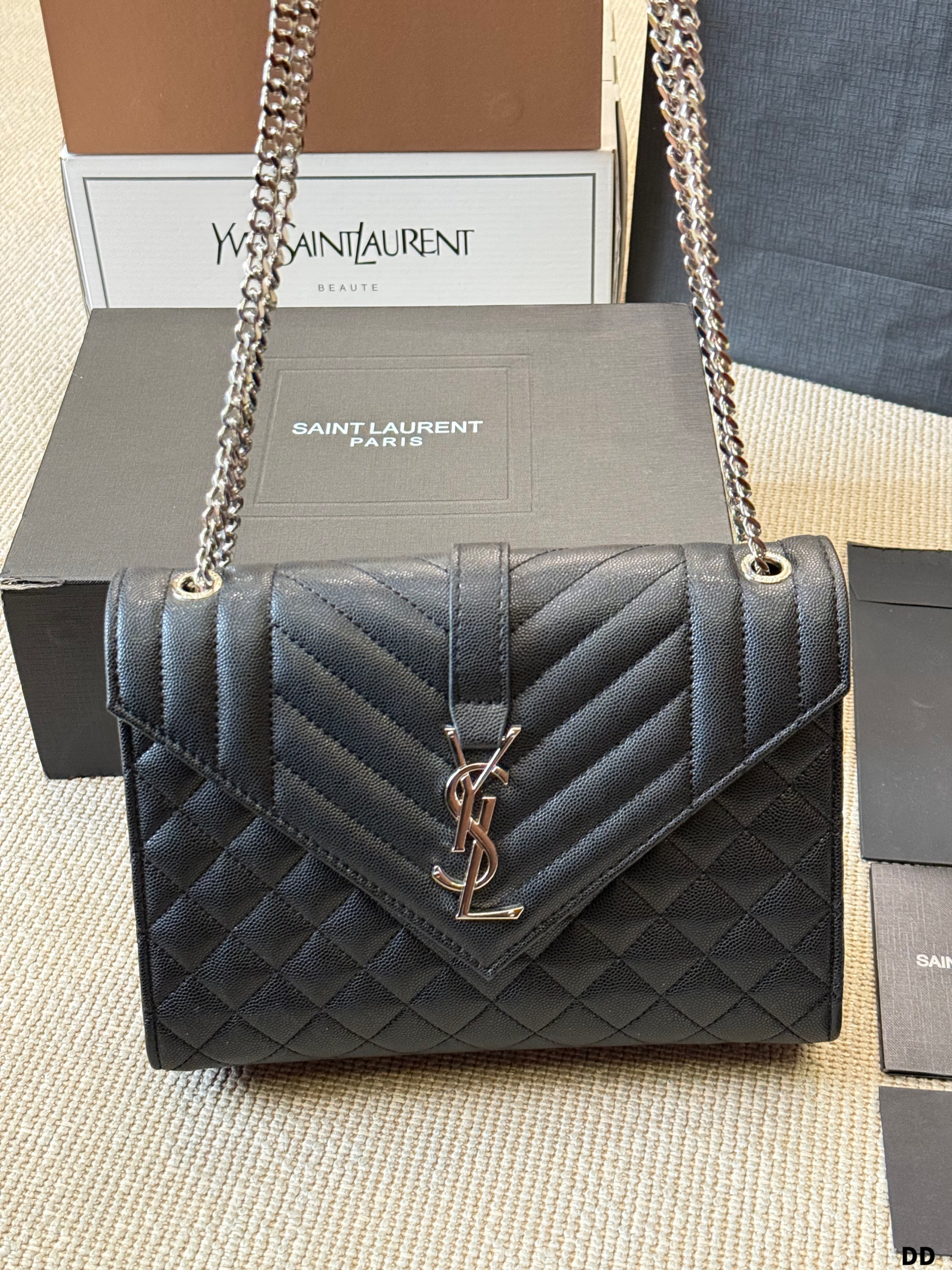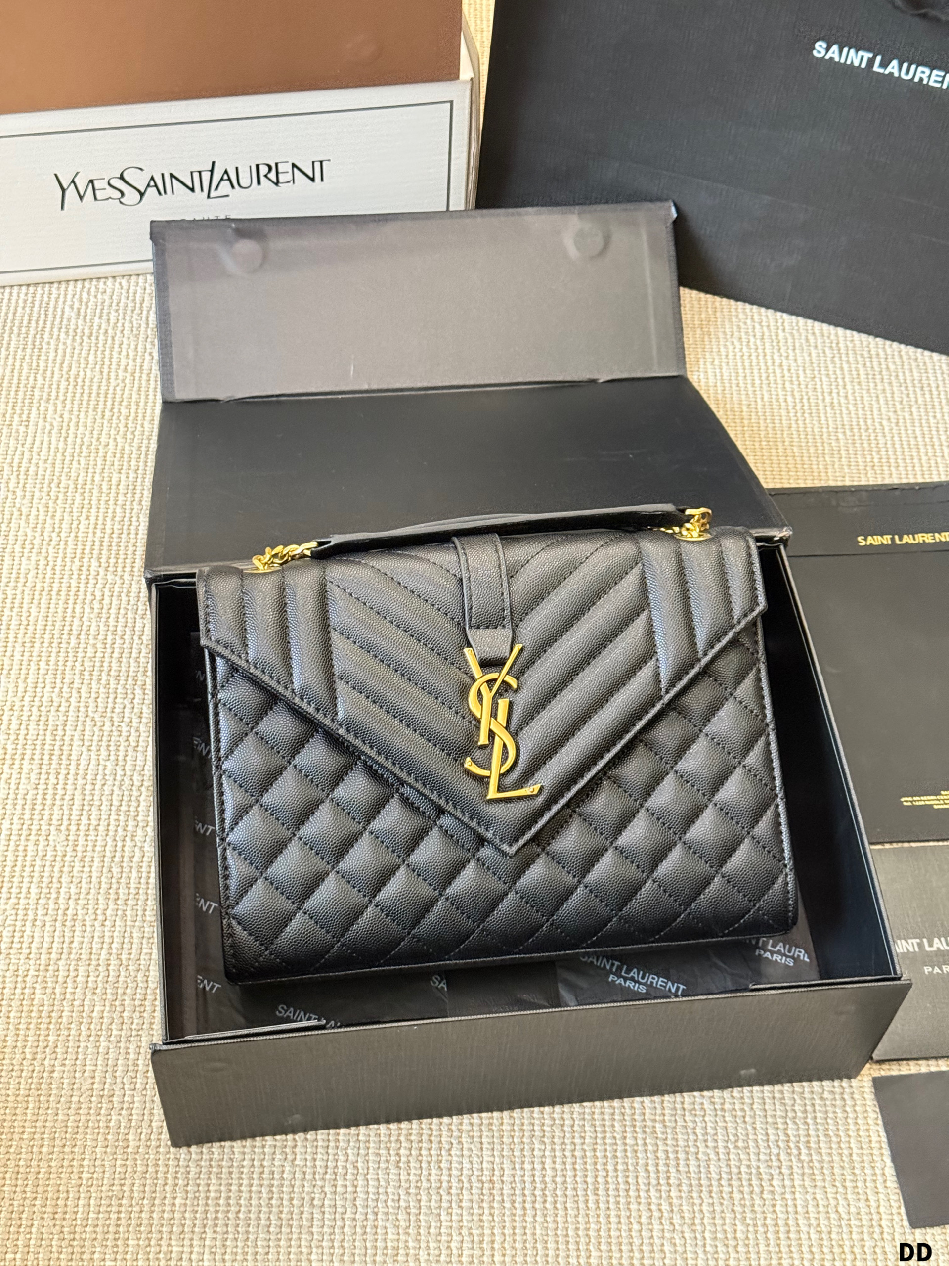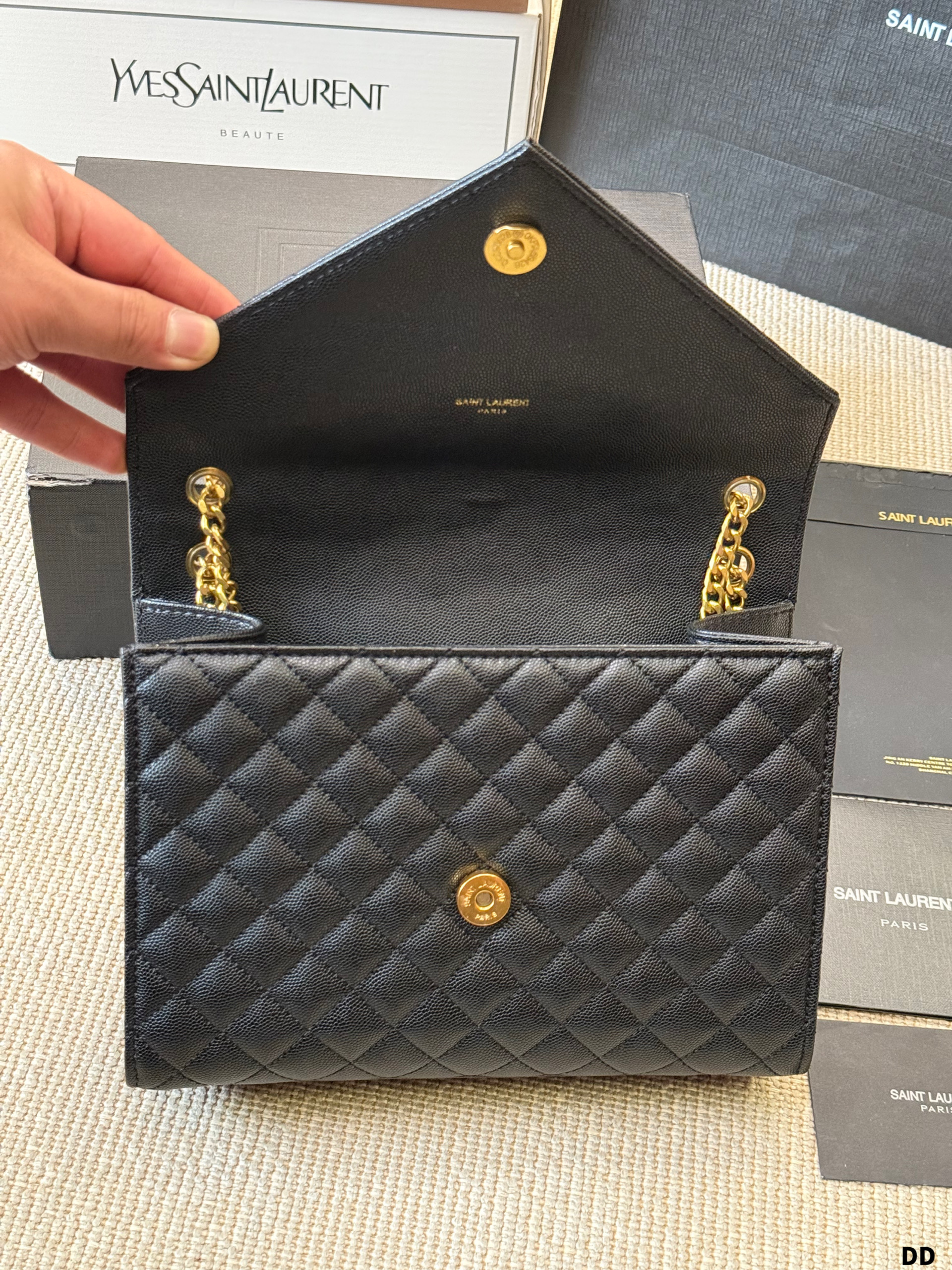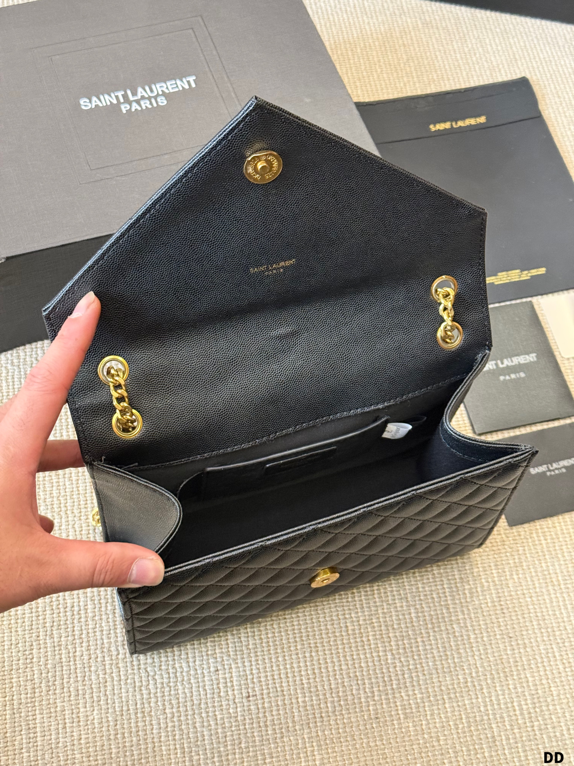 This SAINT LAURENT Envelope bag is expertly crafted from the brand's signature grained cowhide leather, boasting a durable, sturdy texture and a fine, natural texture, exuding a sense of luxury and refinement. Its geometric envelope-style flap creates a sleek silhouette, embodying both strength and elegance.