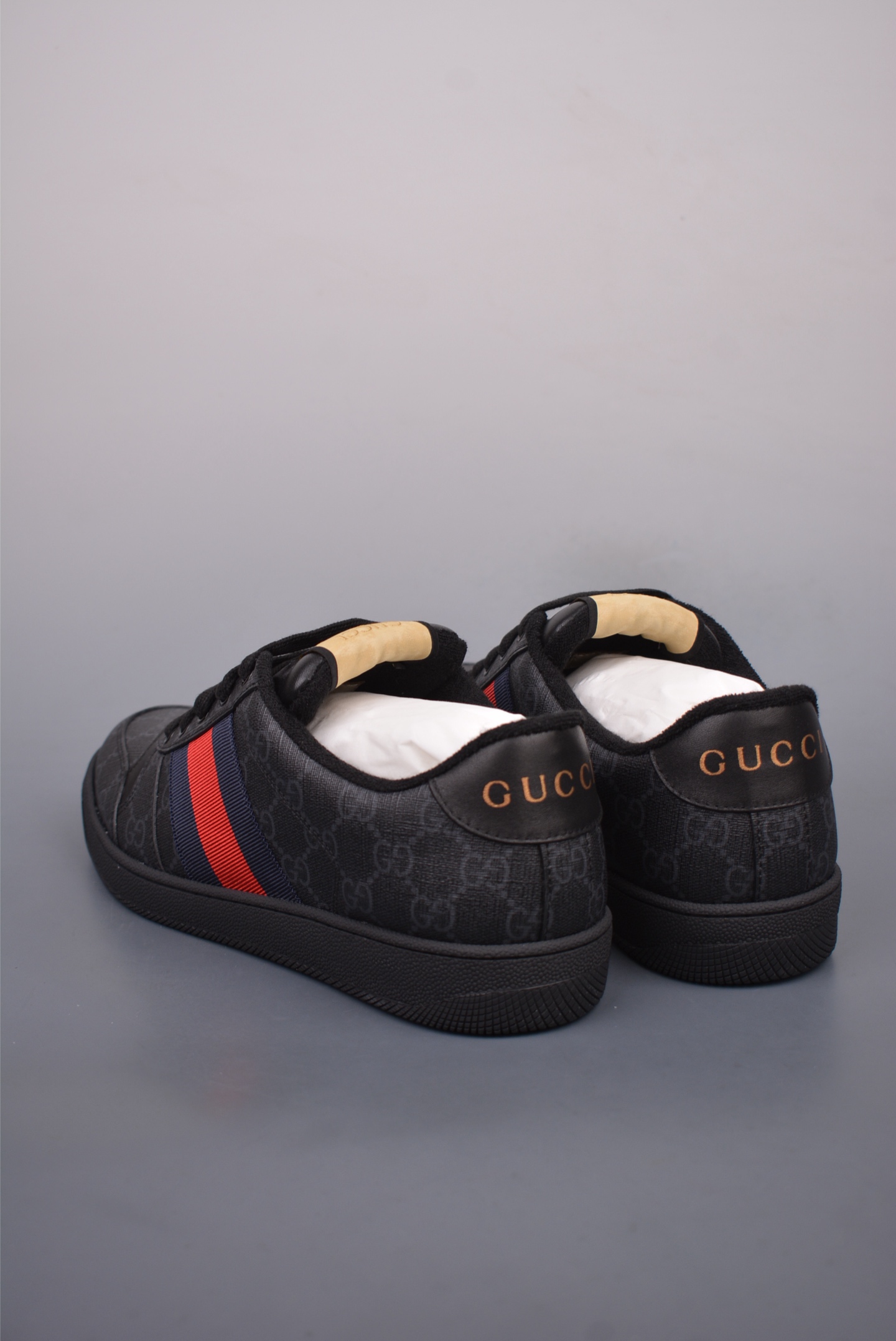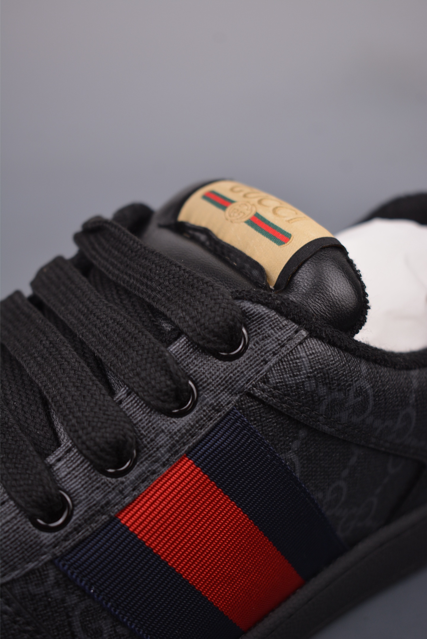 The shoe features the iconic black and red GG canvas pattern, creating an instantly recognizable silhouette that embodies the fusion of luxury heritage and streetwear aesthetics. 🧵 Dirty, distressed finish · Restores the original vintage spirit
