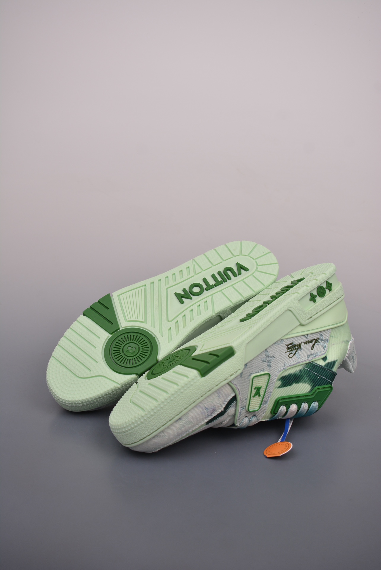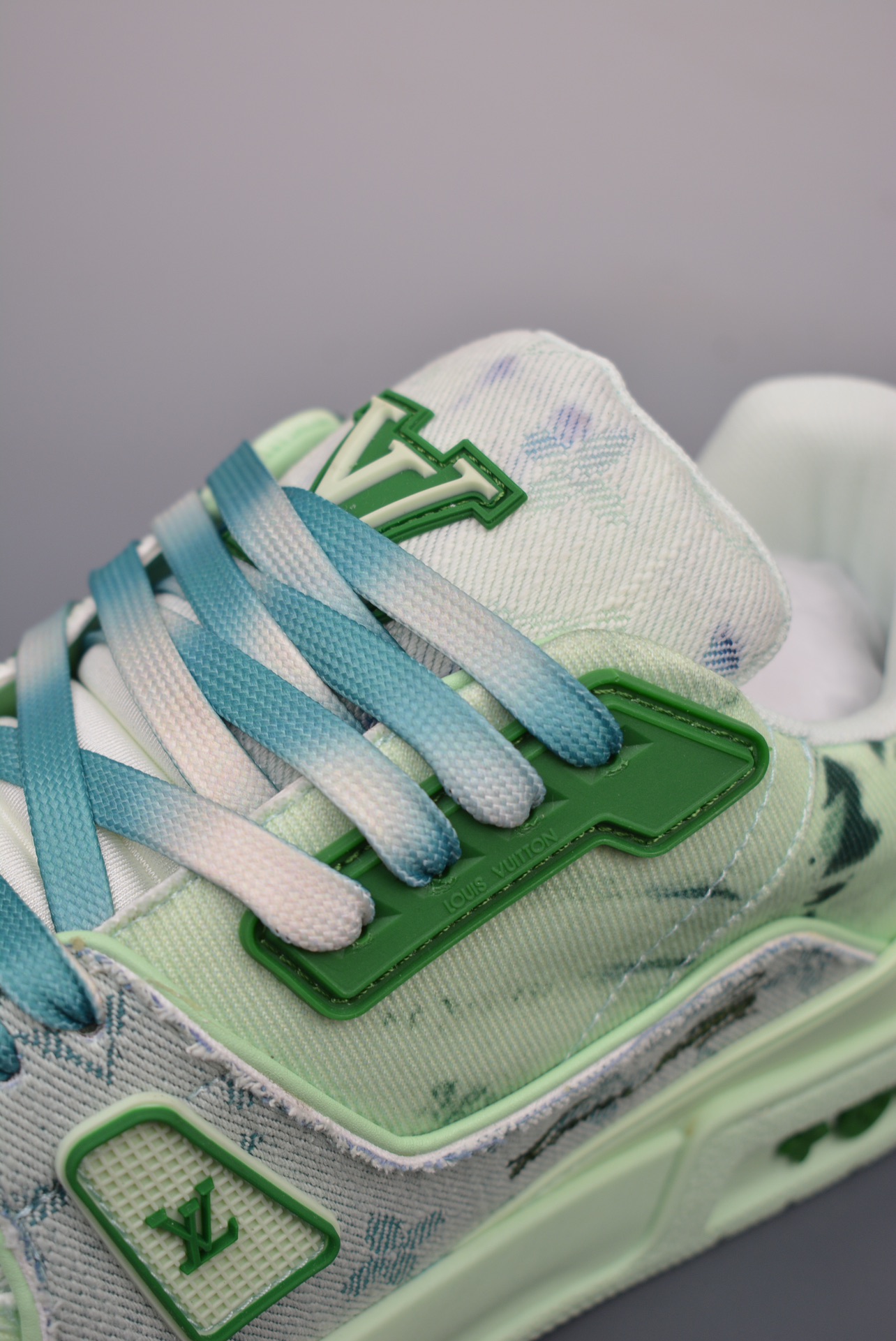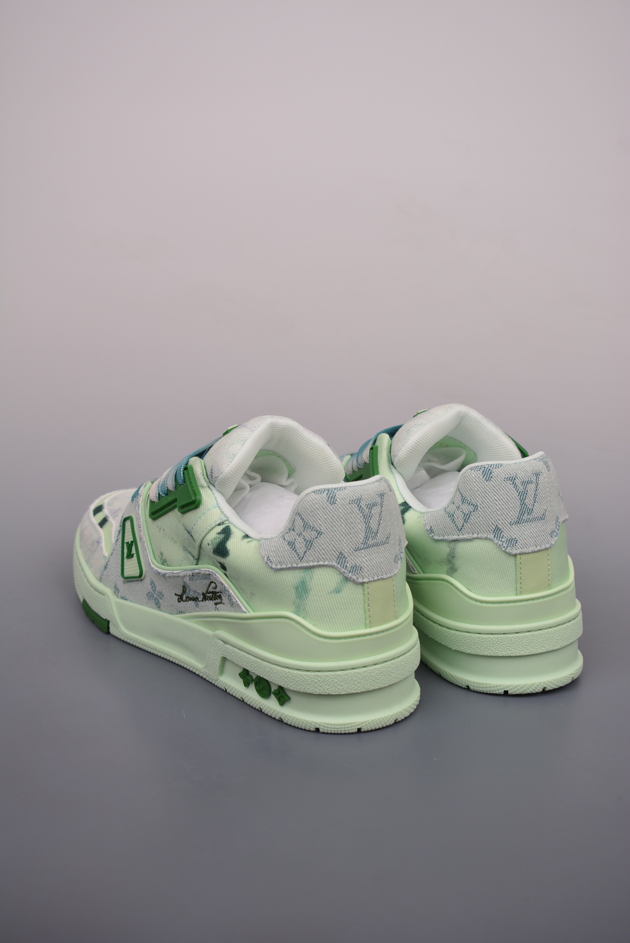 The 2021S LV Trainer limited edition collaboration features a stunning new green colorblock edition. Featuring a colorway not available in China, this unique and rare shoe is incredibly rare! The entire shoe took nearly two months to develop. From material selection to mold creation, every detail was meticulously crafted to meet the exacting standards of the LV original. This high-end replica truly achieves a complete restoration of its form, color, feel, and craftsmanship.