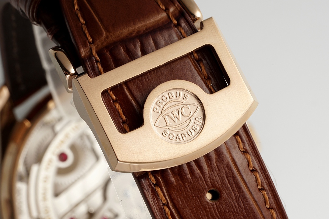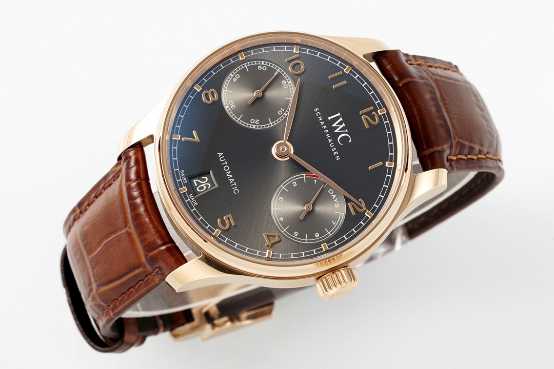 This IWC Portugieser Red Gold watch, with its deep black dial and warm red gold accents, embodies a gentleman's calm and distinguished demeanor. Its classic dual sub-dial layout showcases IWC's consistent aesthetic balance and precision watchmaking tradition.