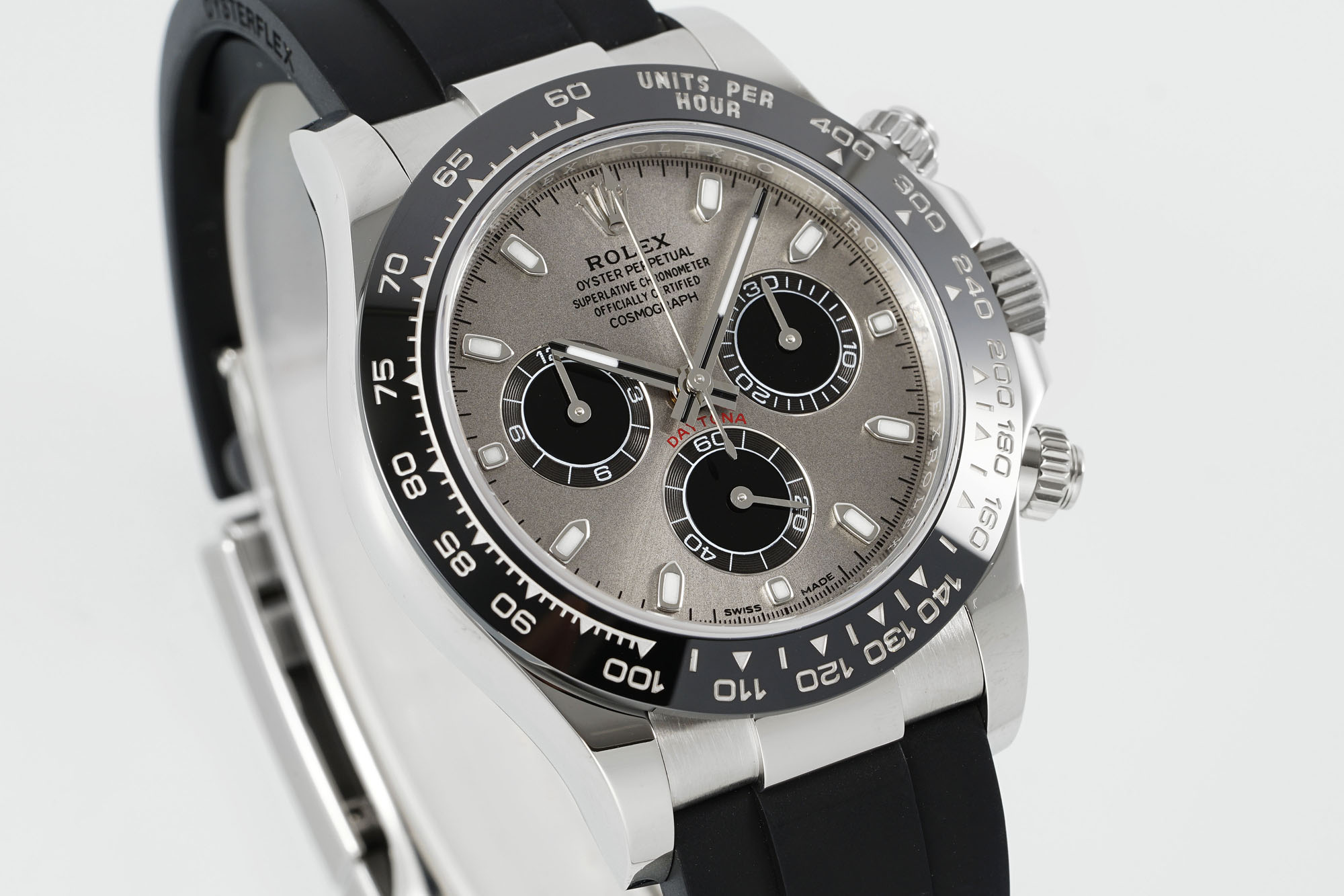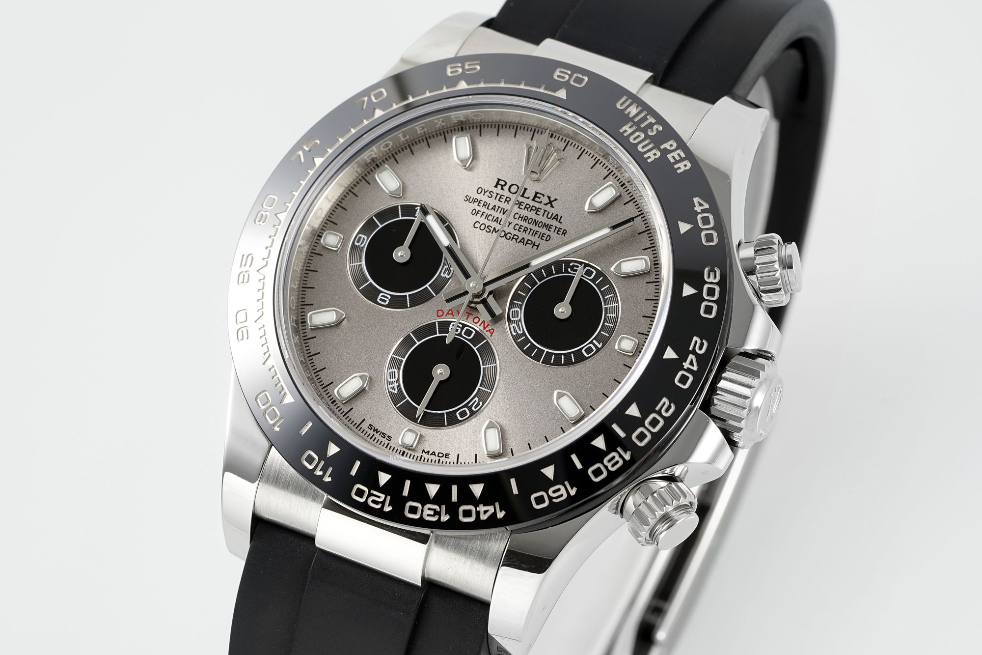 The cement gray hue, imbued with an urban, industrial aesthetic, creates a low-contrast aesthetic with the silver subdials, creating an elegant and striking colorway that is a uniquely modern addition to the Daytona collection.