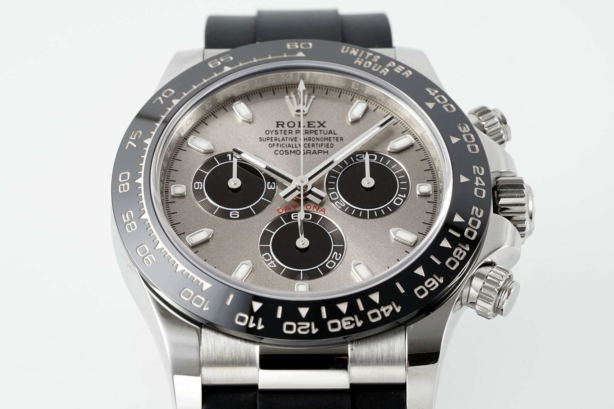 This Cosmograph Daytona men's watch features an elegant and sophisticated "cement grey" silver dial and an 18K white gold case. It exudes understated luxury and precision, imbued with power. It embodies not only the legacy of Rolex's classic racing spirit but also a fusion of high-end watchmaking craftsmanship and avant-garde aesthetics.