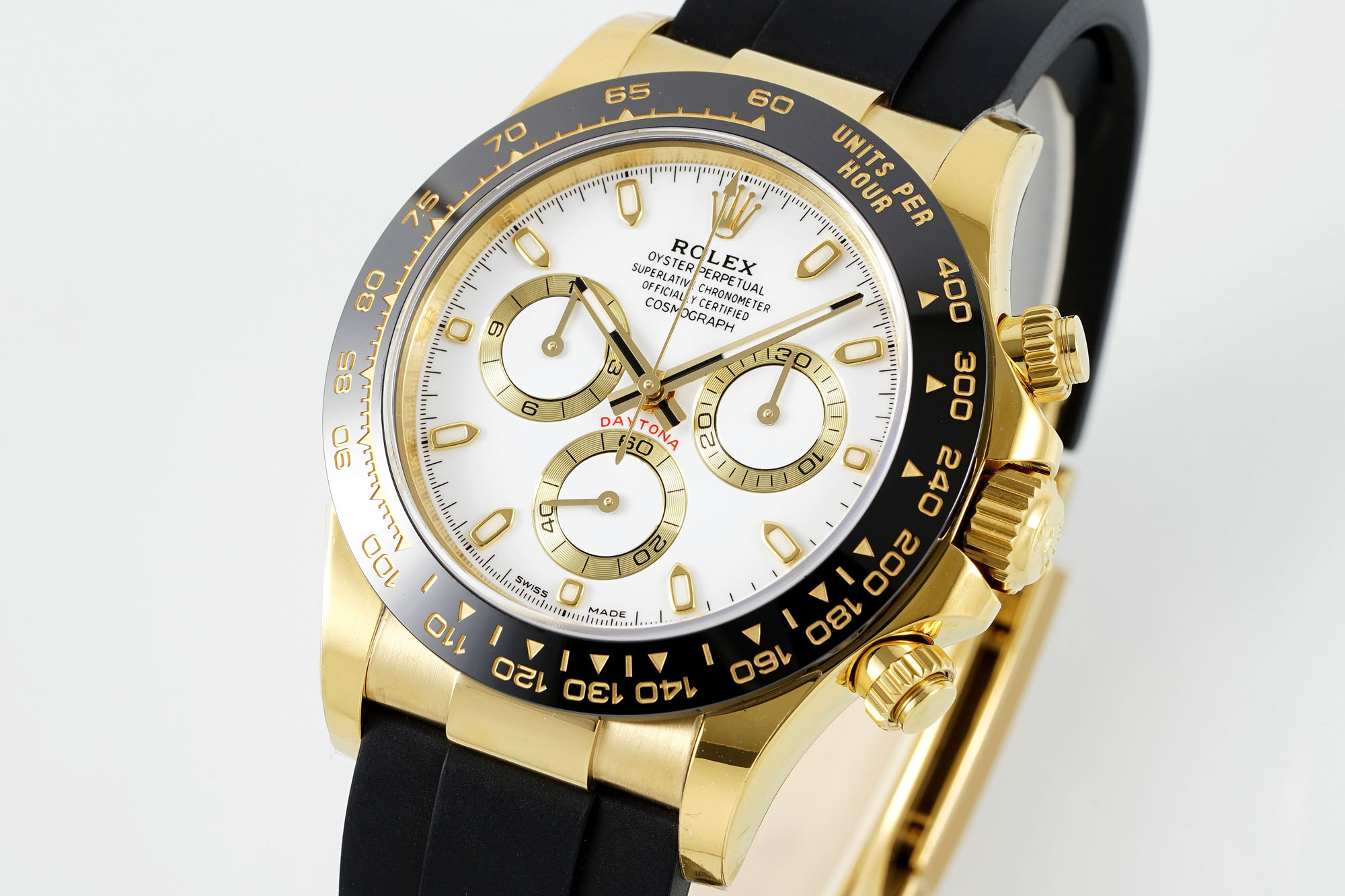 Inheriting the spirit of legendary racing, this Rolex Cosmograph Daytona men's watch features a classic white dial and a black Cerachrom ceramic bezel, creating a striking contrast that exudes speed and power in its elegance. Its precise mechanical performance combined with premium materials makes it a standout piece on every wrist.