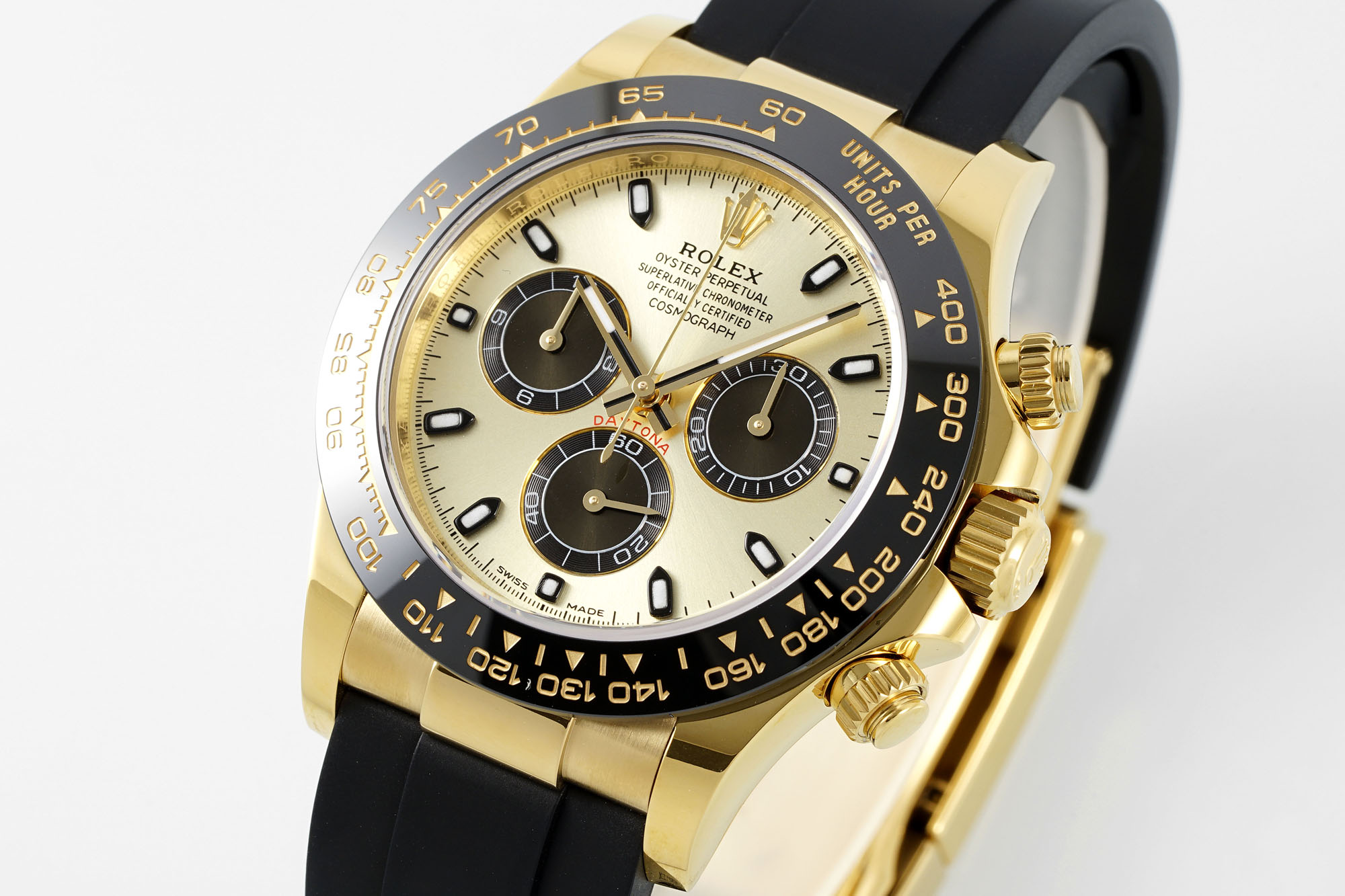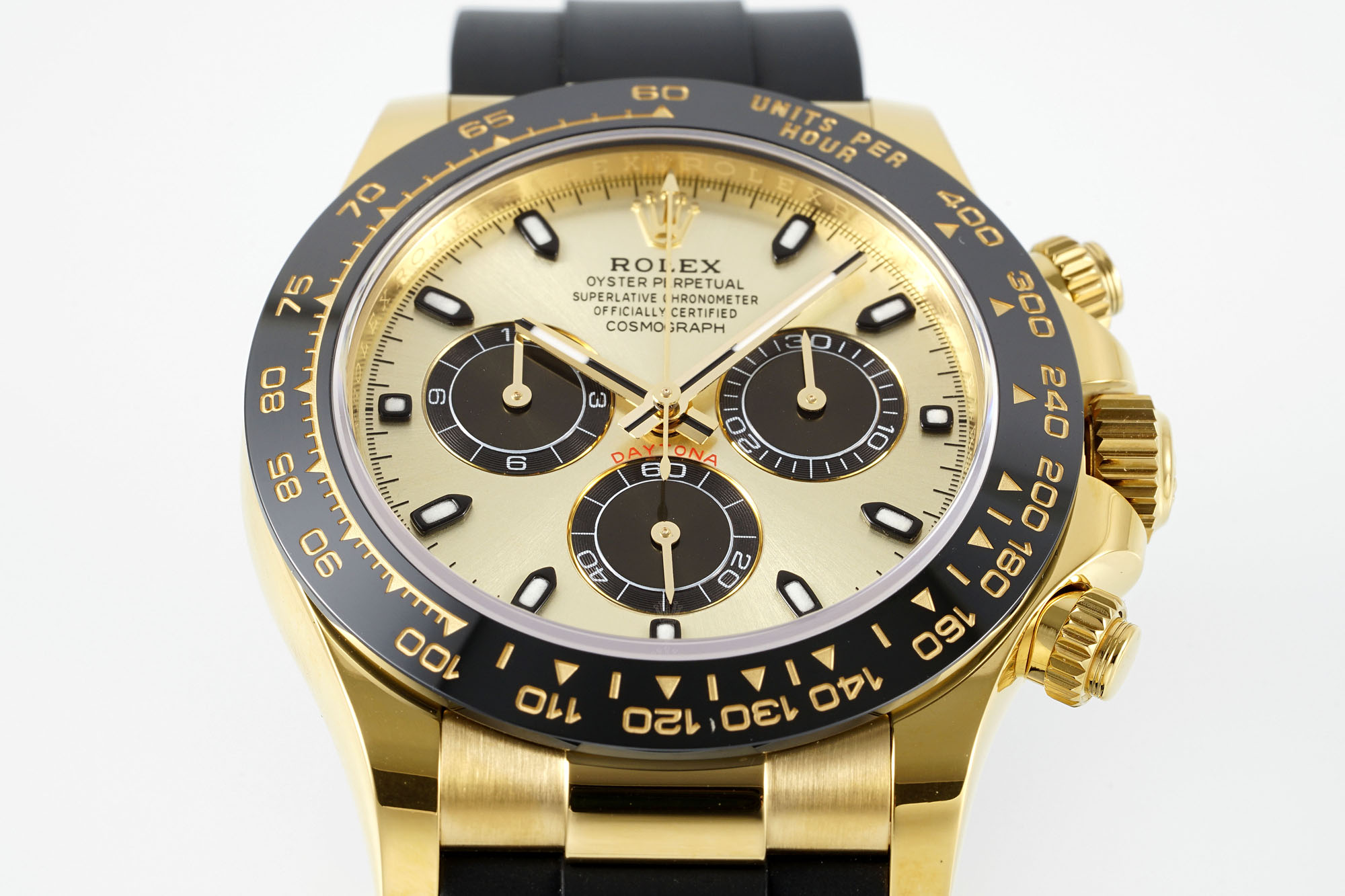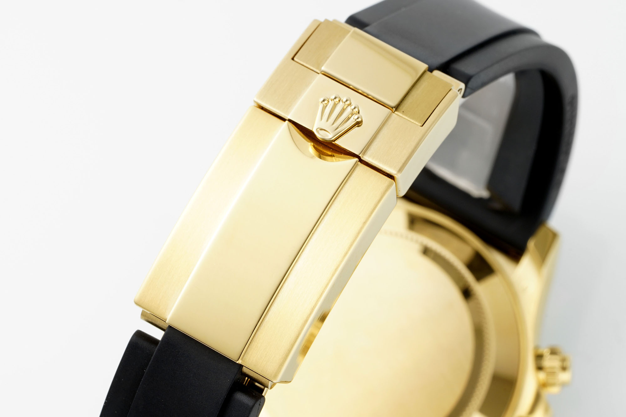 A perfect blend of classicism and luxury, this Rolex Cosmograph Daytona "Panda Dial" watch features a striking gold dial with delicate black subdials, creating a highly recognizable classic "Panda Dial" design. The 18ct gold case exudes elegance, and the 40mm diameter, defined by the golden ratio, further enhances a man's calm and elegant demeanor.