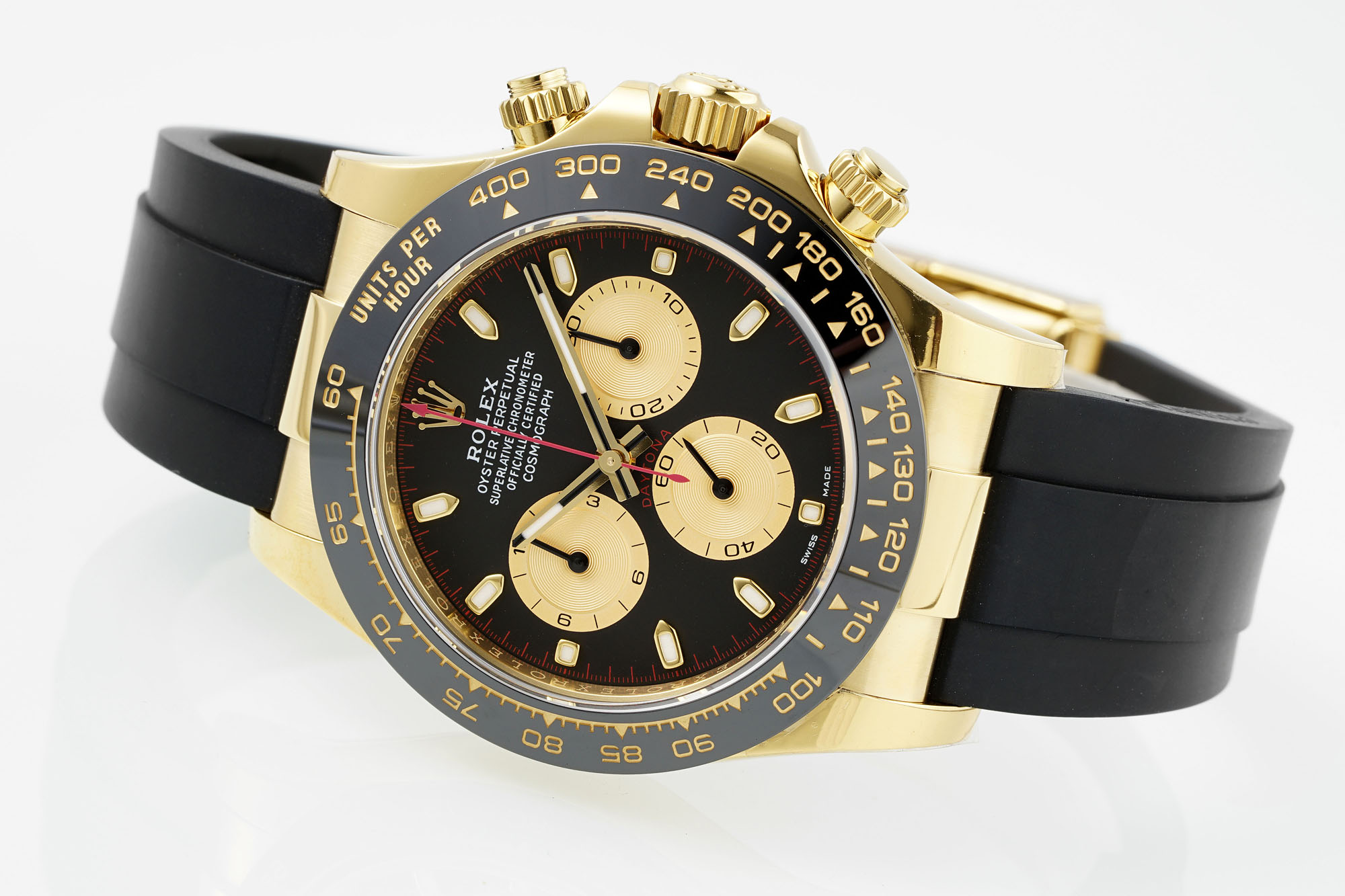 The chronograph dial precisely records seconds, minutes, and hours, while the tachymeter scale on the outer ring embodies the racing spirit, perfectly embodying the Daytona's sporting DNA.