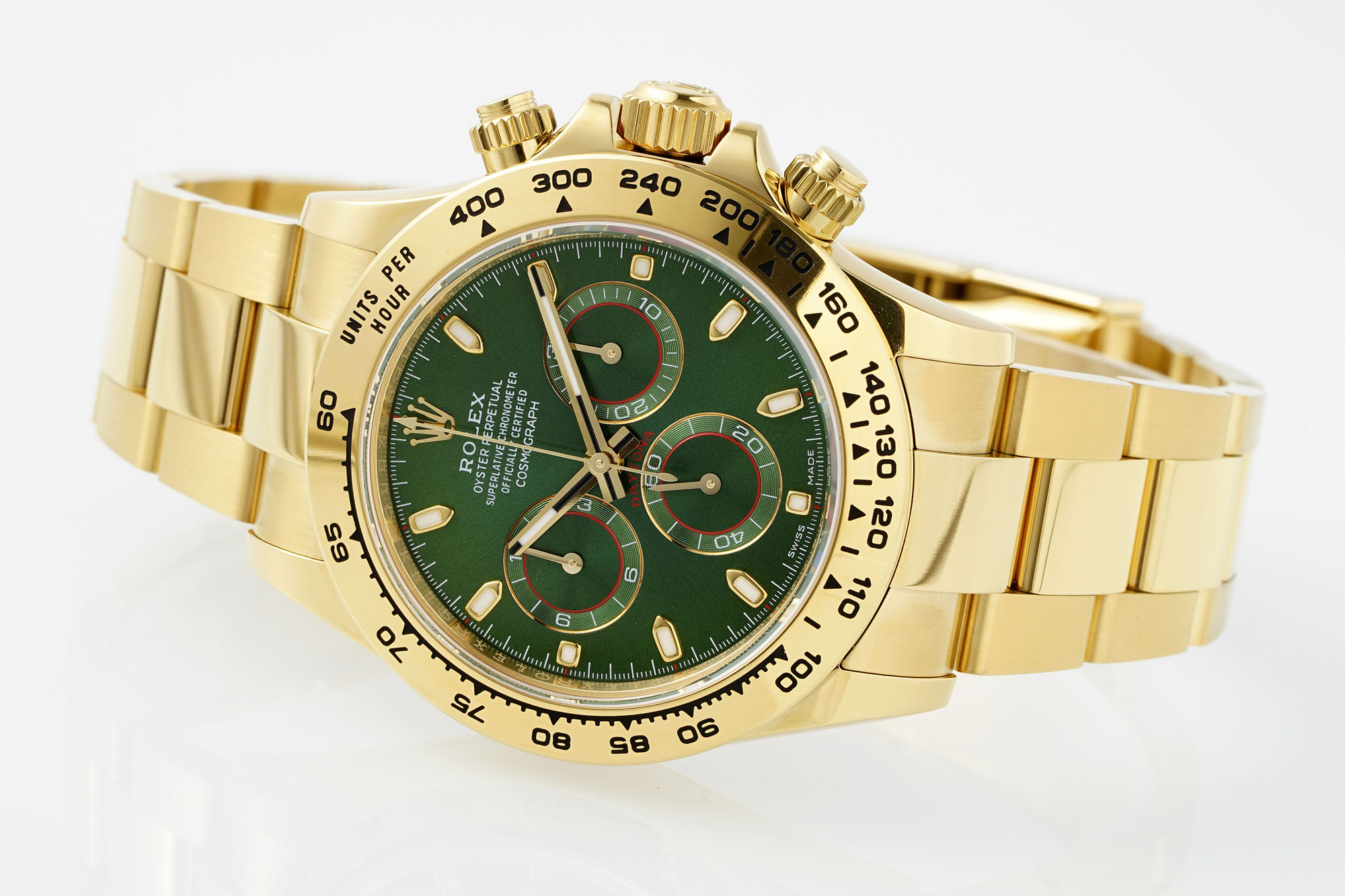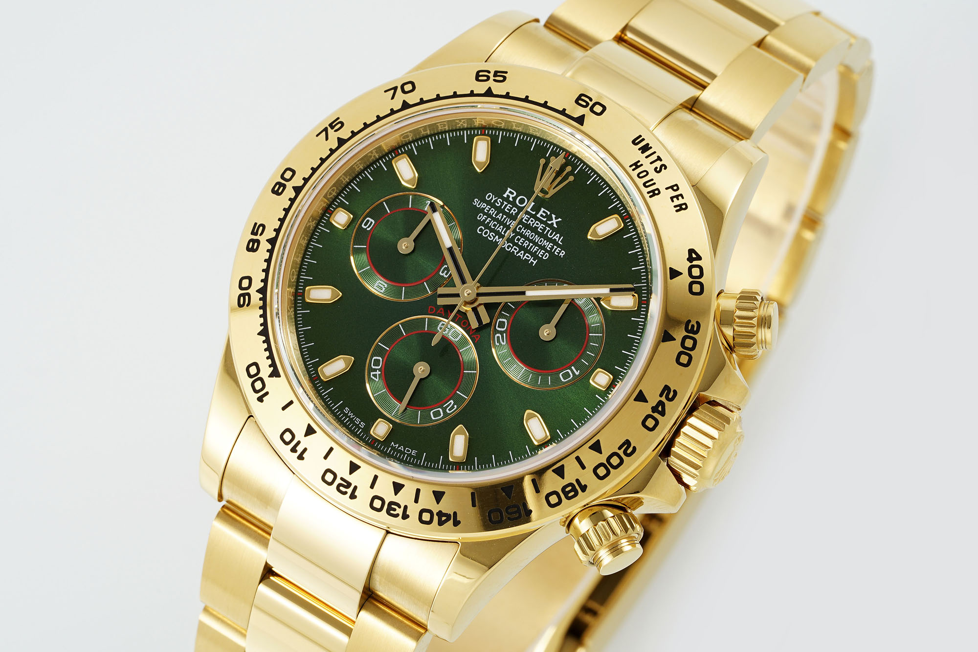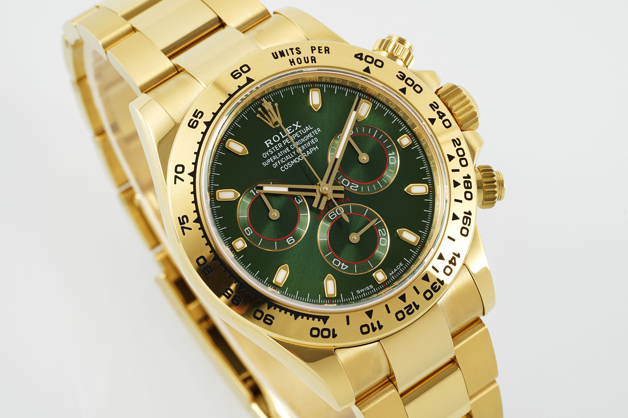 Combining luxurious materials with exceptional performance, this Rolex Cosmograph Daytona men's watch features a striking green dial paired with 18ct gold and Oystersteel, delivering exceptional visual impact and precise timing. As one of the most popular models in the Rolex Daytona family, it not only symbolizes sporting spirit but also embodies elegance and status.