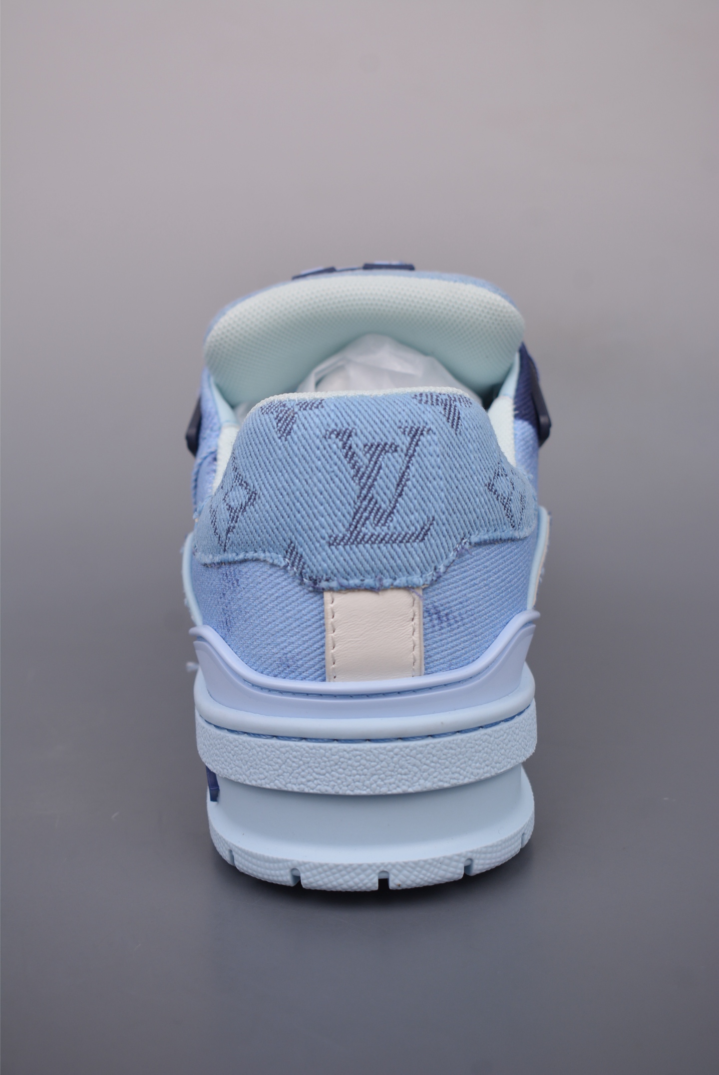 The 2021 limited edition Louis Vuitton Trainer Gradient Denim Blue Limited Joint shoe features a gradient blue denim design, combining luxurious materials with a sporty style, showing a unique sense of fashion and personality, suitable for fashionistas who pursue a unique style.