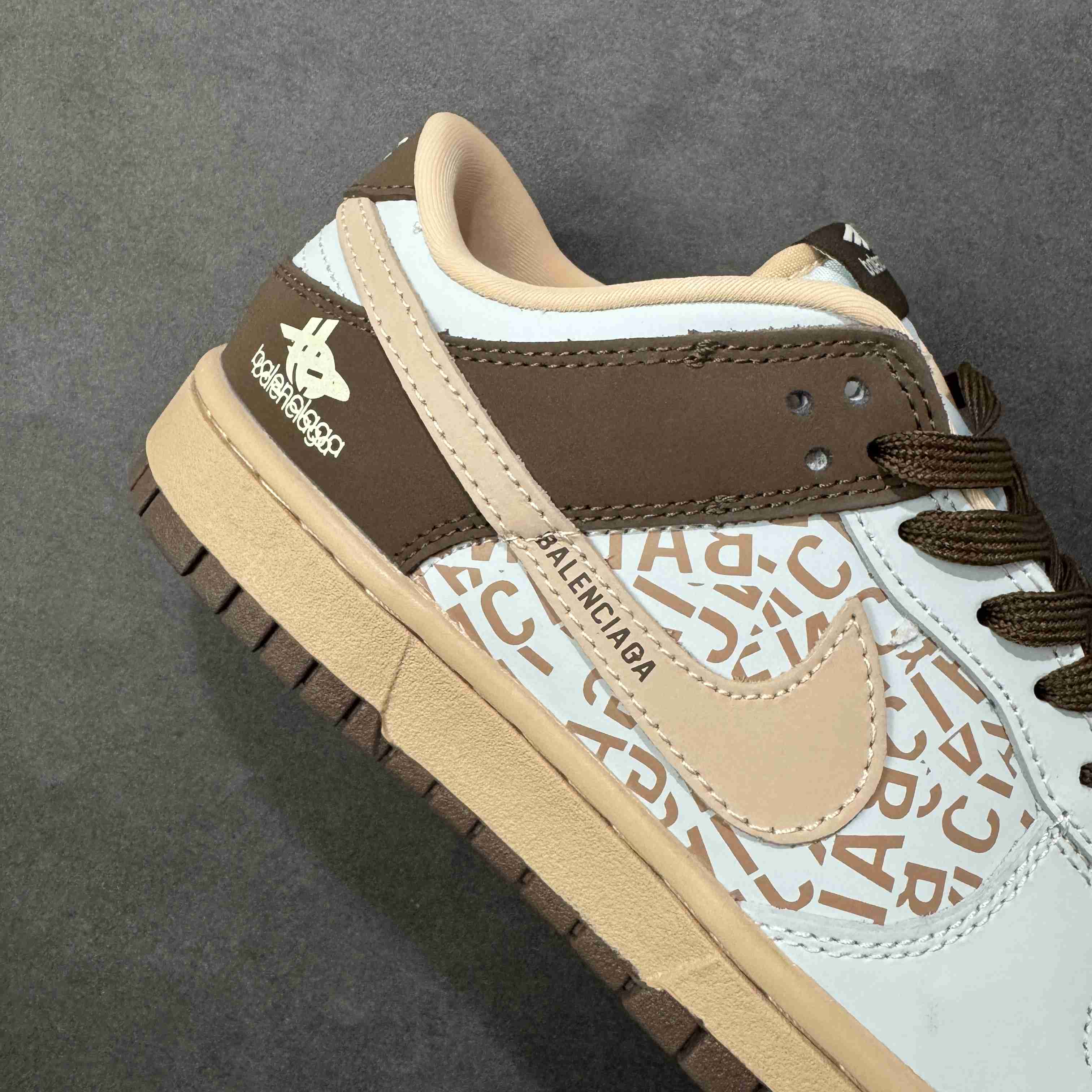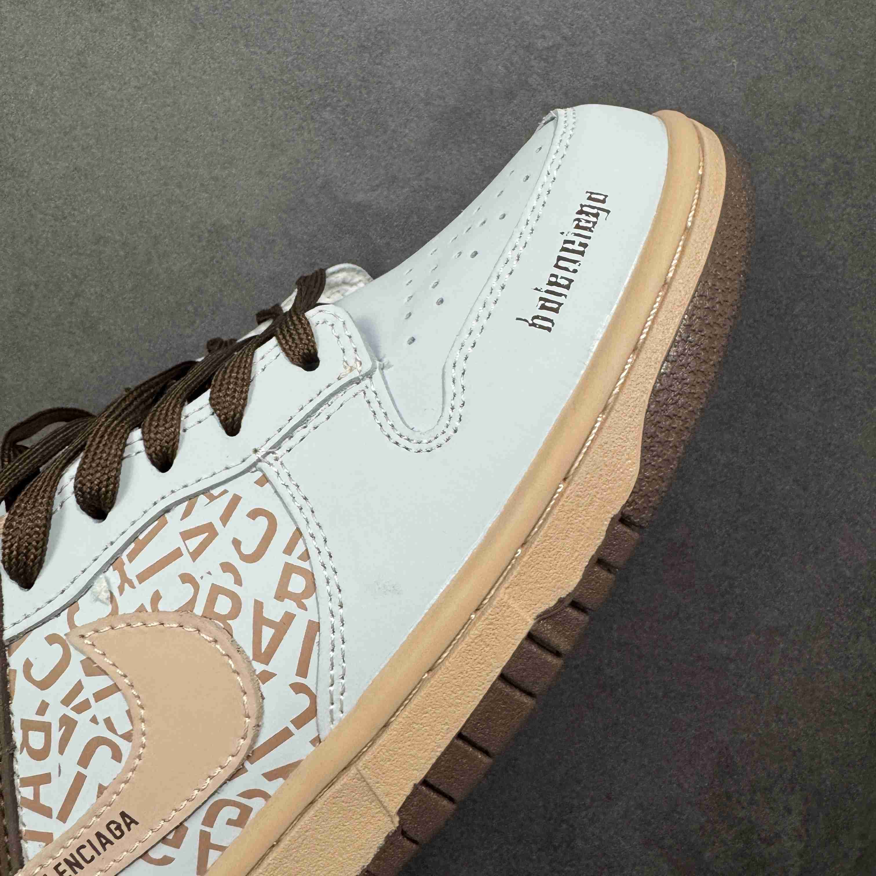 The signature Swoosh and Balenciaga logo are cleverly integrated, while a retro monogram print on the side panel adds a modern, cutting-edge touch to the classic silhouette. Contrasting brown laces and the midsole enhance the overall visual depth and stylish aesthetic.