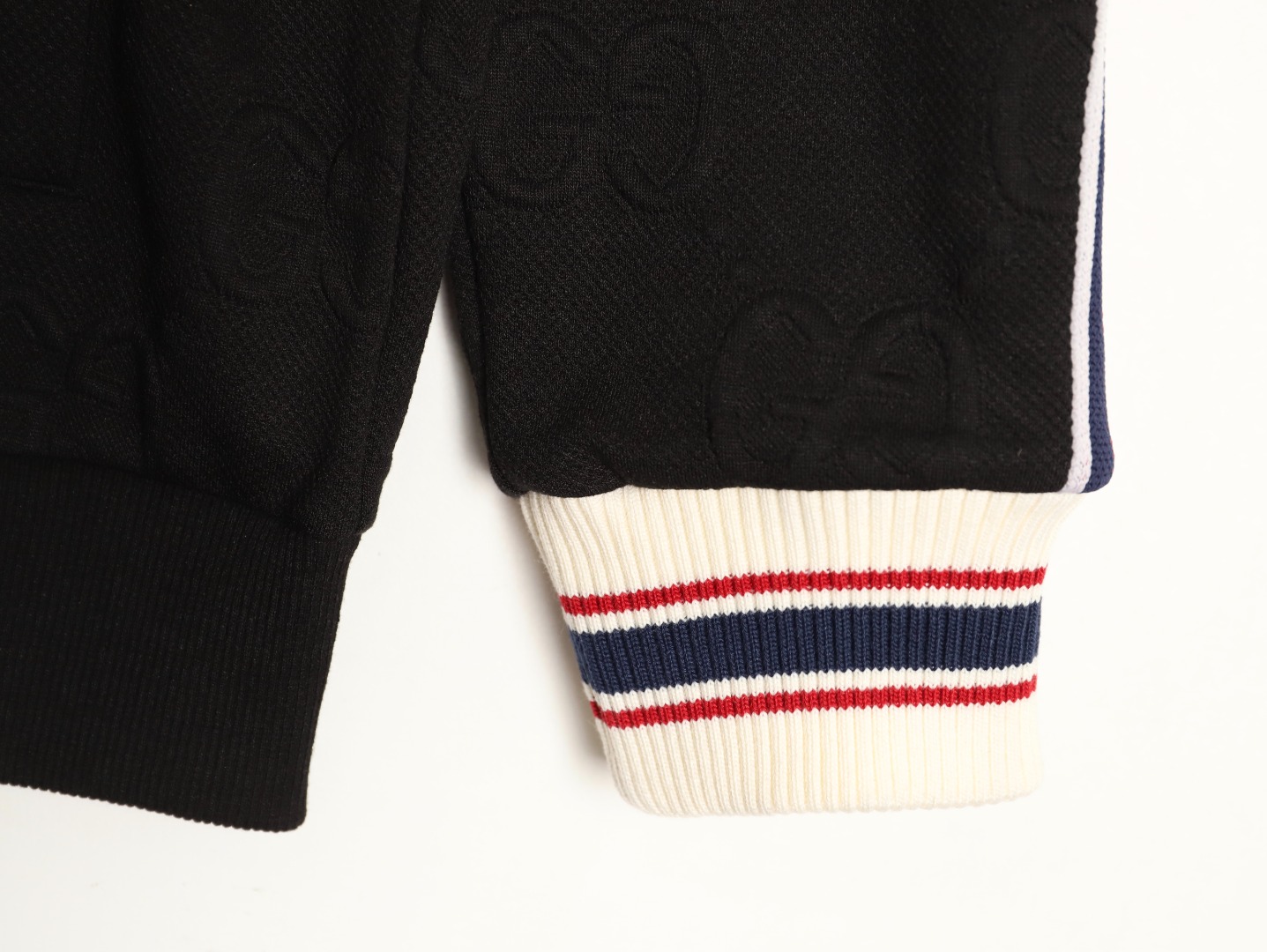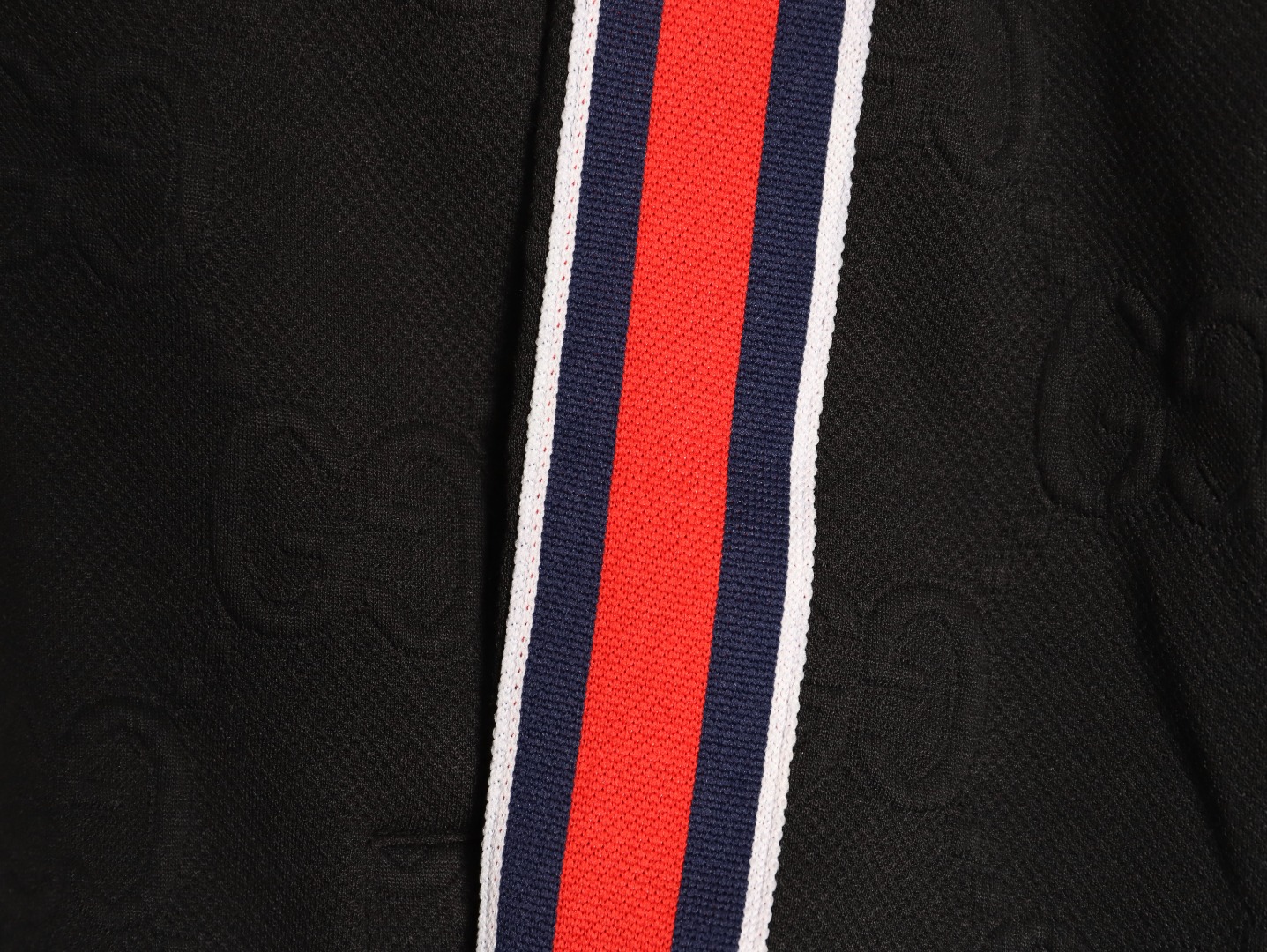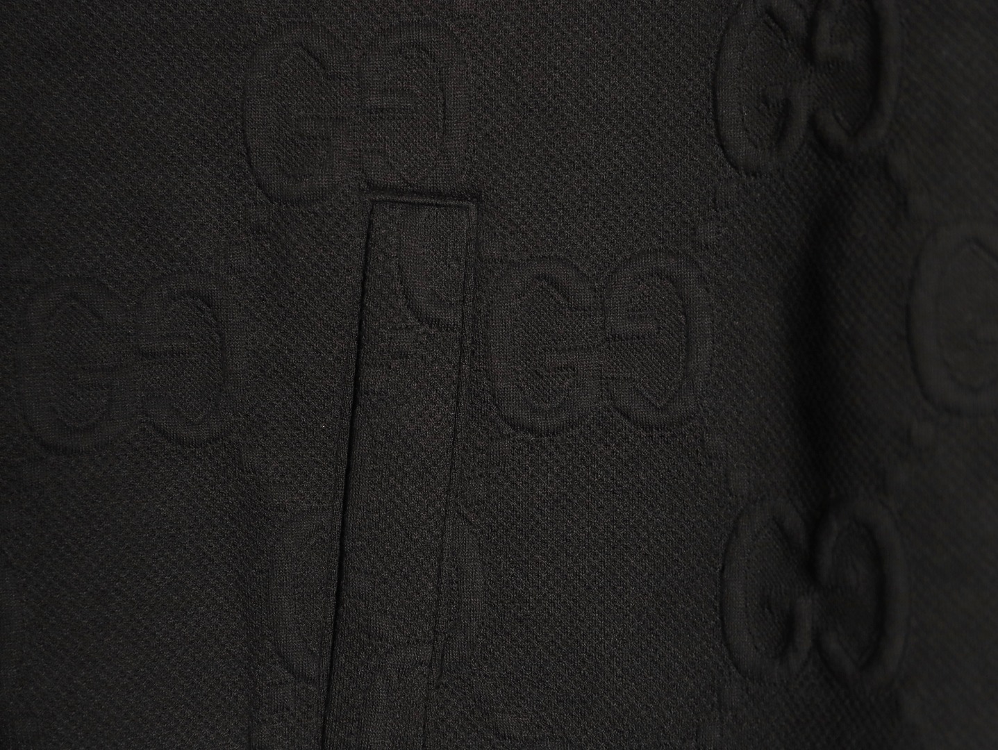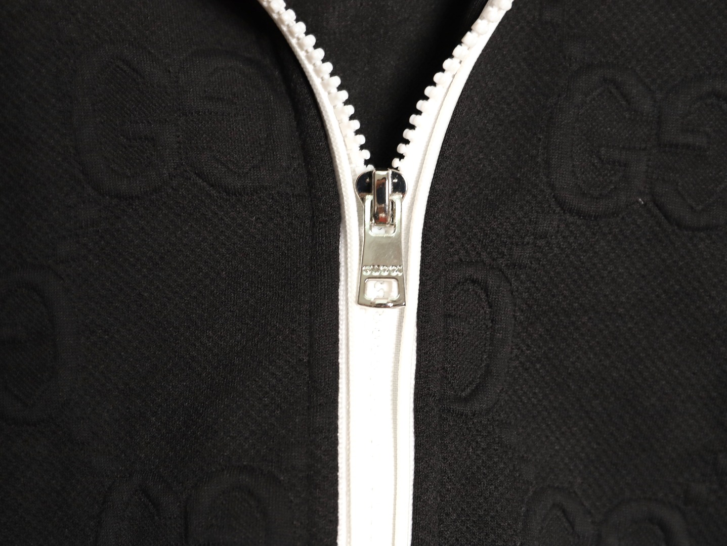 The overall color scheme is dark green or black, creating a calming yet understated look. **The all-over GG jacquard pattern** is woven into the fabric itself, not a post-print, resulting in a clear, three-dimensional pattern with meticulous detail. **The zipper placket features precisely aligned patterns**, ensuring seamless fit and adherence to ZP-grade craftsmanship standards.