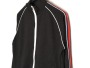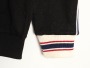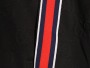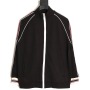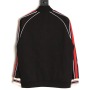 **Red, white, and blue webbing stripes** run through the sleeves and sides of the pants, breaking up the dullness of the dark base and adding a pop of color, showcasing Gucci's unique design aesthetic. The neckline features a **stand-up collar and white zipper**, with a custom zipper pull, for a sleek, stylish look and easy on and off.
