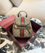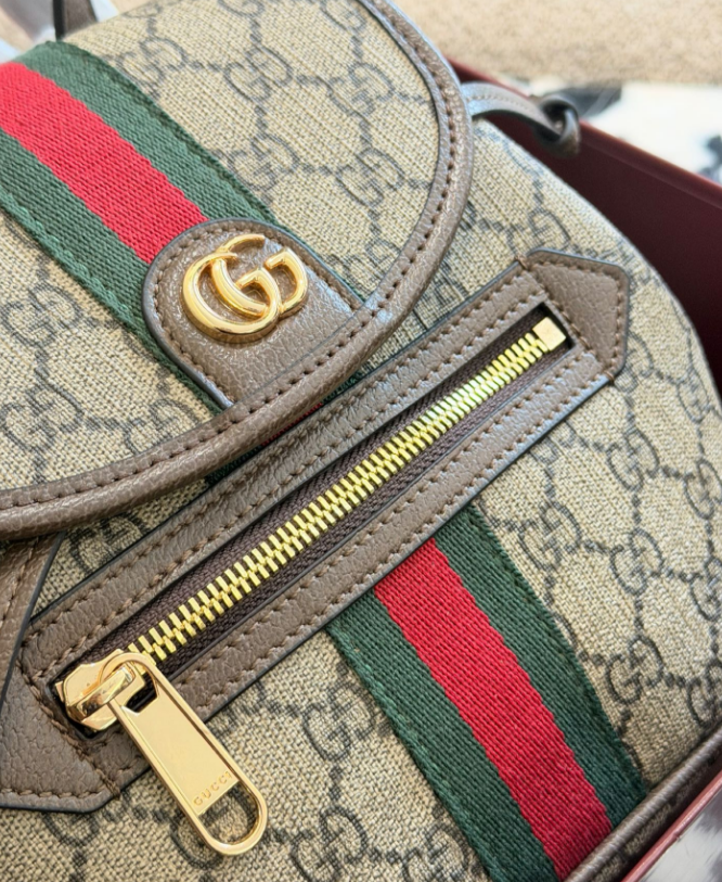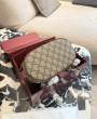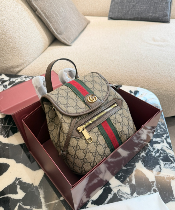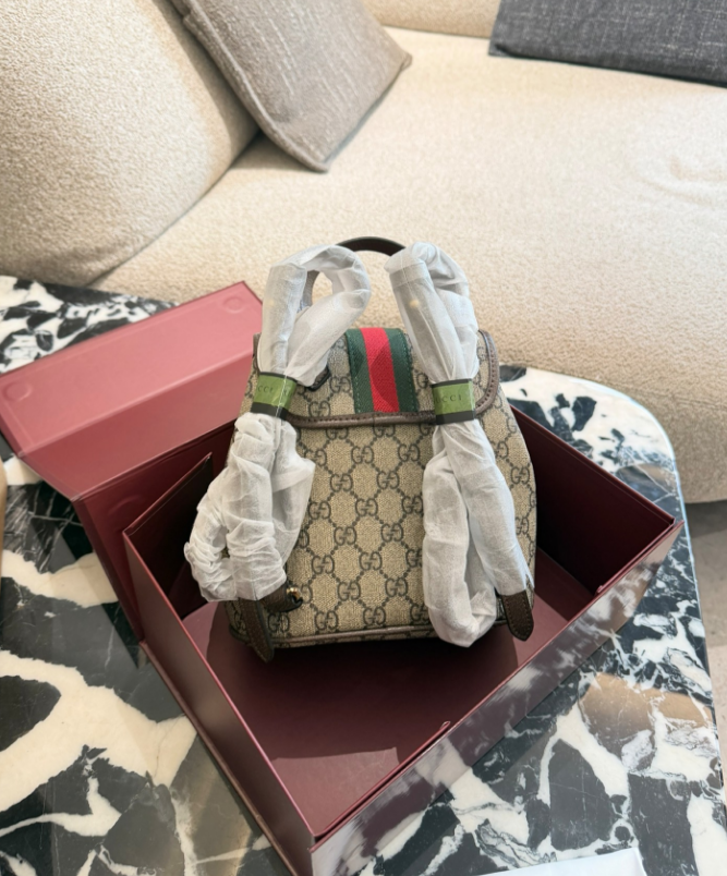 GUCCI's classic Ophidia collection is enhanced with a new model crafted from the iconic GG Supreme coated canvas in a beige and brown colorway, showcasing a vintage feel. The Double G logo and classic web embellishment on the front create a subtle yet luxurious statement. Lightweight and sleek, the bag boasts a generous storage compartment within its compact design. The adjustable shoulder strap provides a comfortable fit, perfectly balancing style and practicality. Whether worn for daily commuting, leisure outings, or travel, this backpack exudes elegance and style.