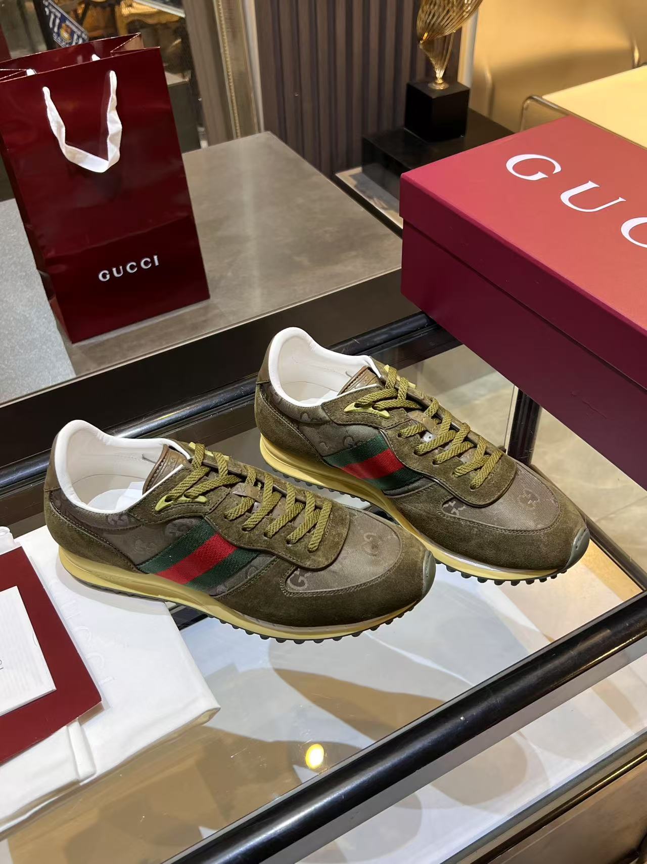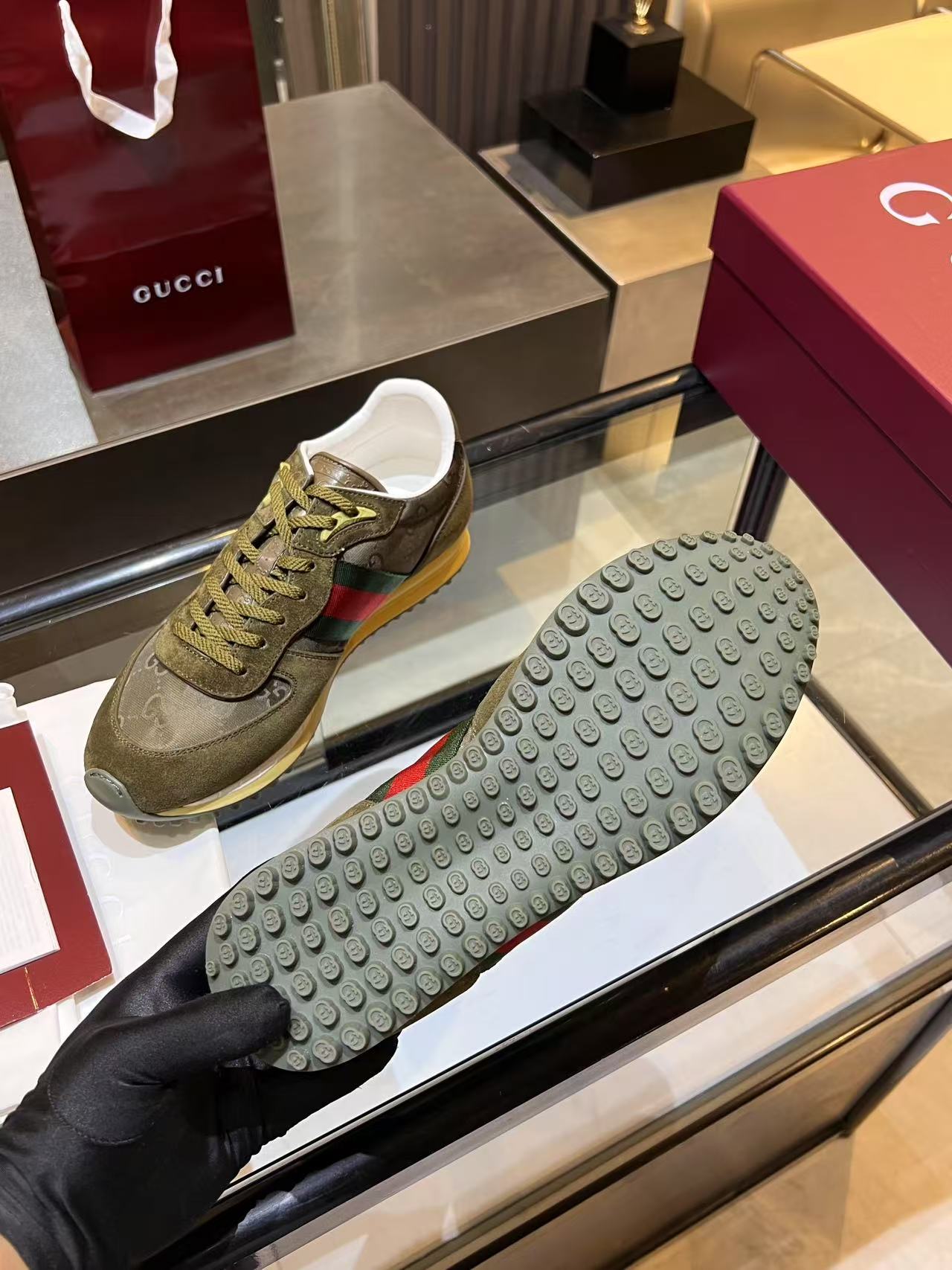 The overall lines are simple and sleek, with details reflecting Gucci's runway style.