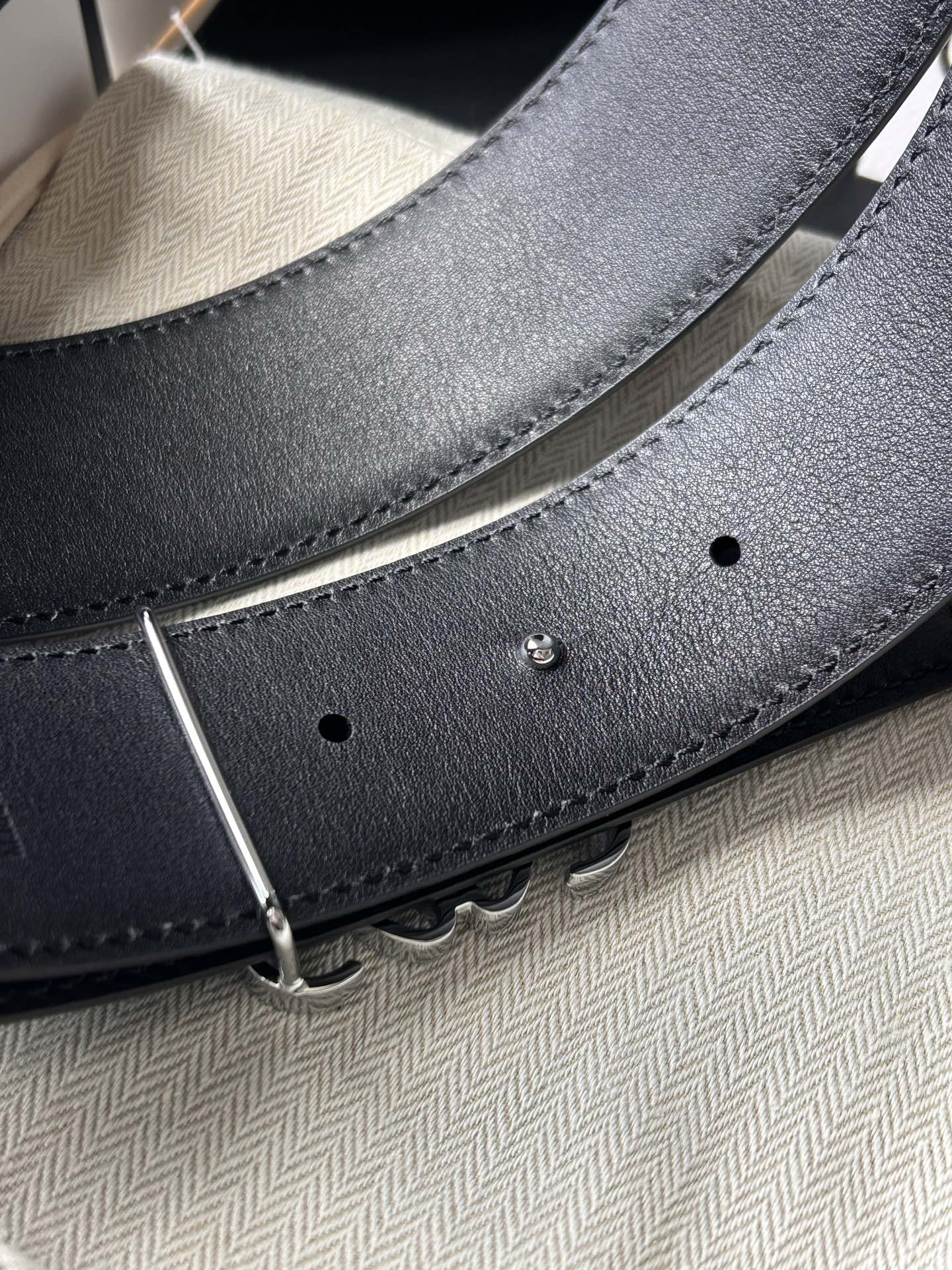 This high-quality, double-sided belt is crafted from carefully selected top-grain cowhide, boasting a supple, fine texture and smooth feel. The reversible design allows for flexible color switching—one side elegantly black, the other classic brown—perfect for both business and casual wear. The palladium-finished metal buckle boasts a soft sheen and a simple, elegant design, embodying understated luxury within a modern aesthetic.