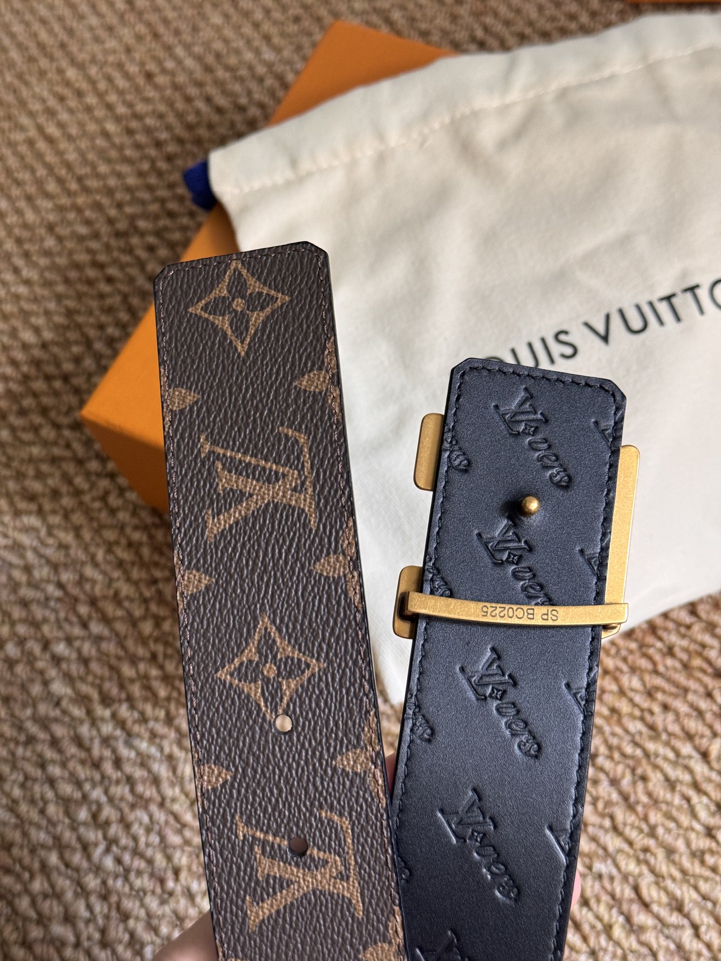 This belt showcases the brand's iconic design in Monogram coated canvas, with embossed calfskin on the back, showcasing Pharrell Williams's latest signature.