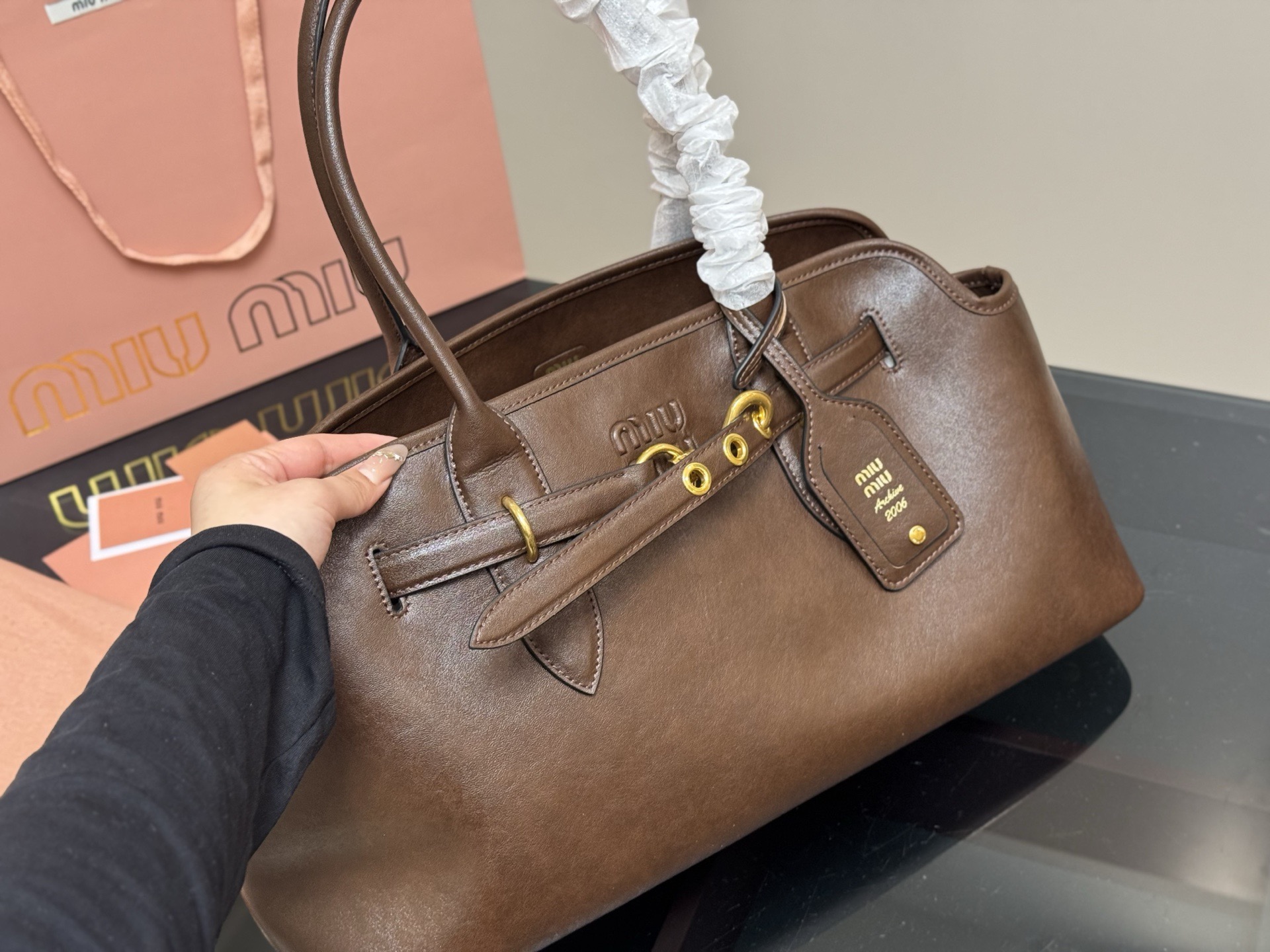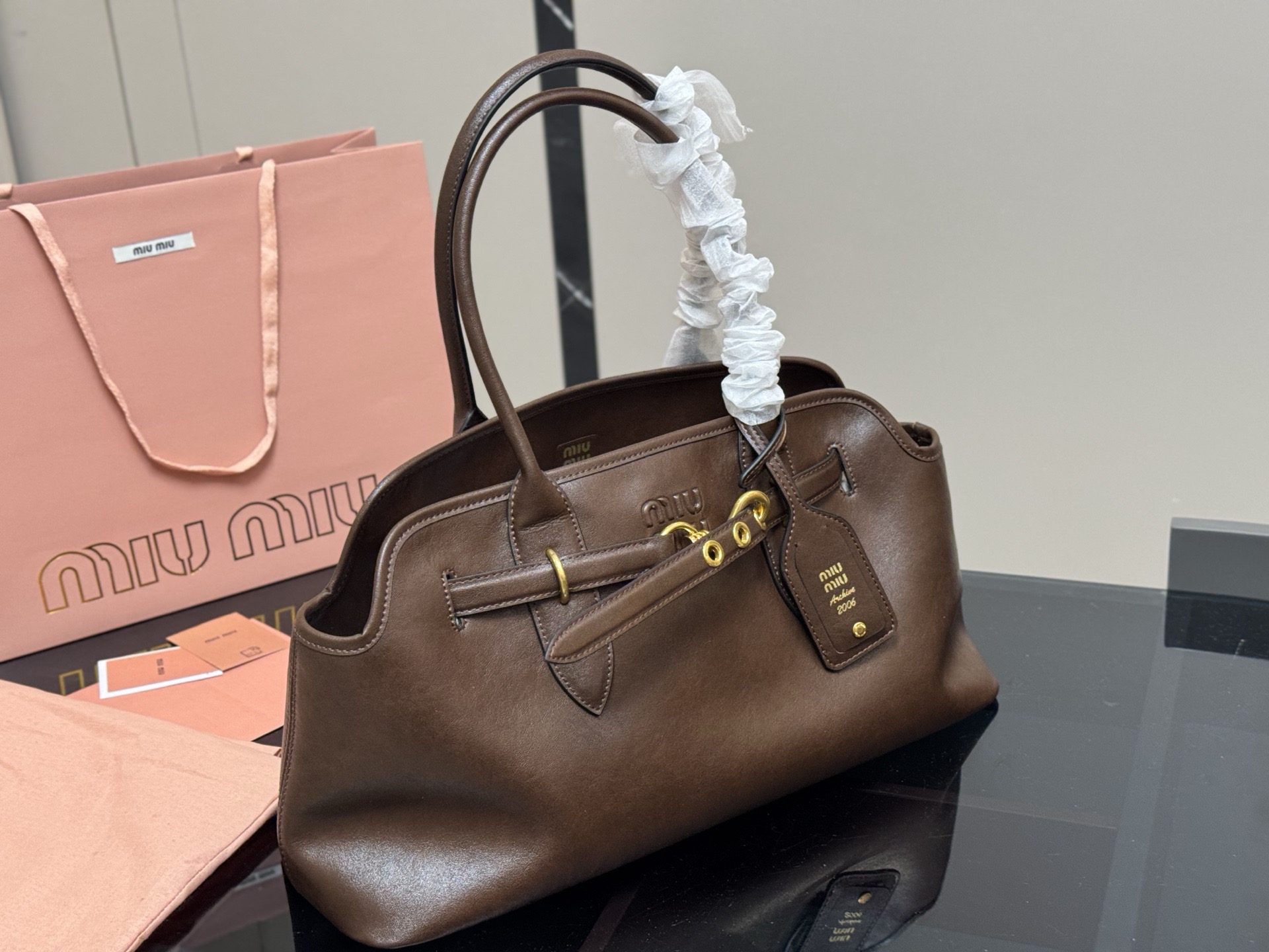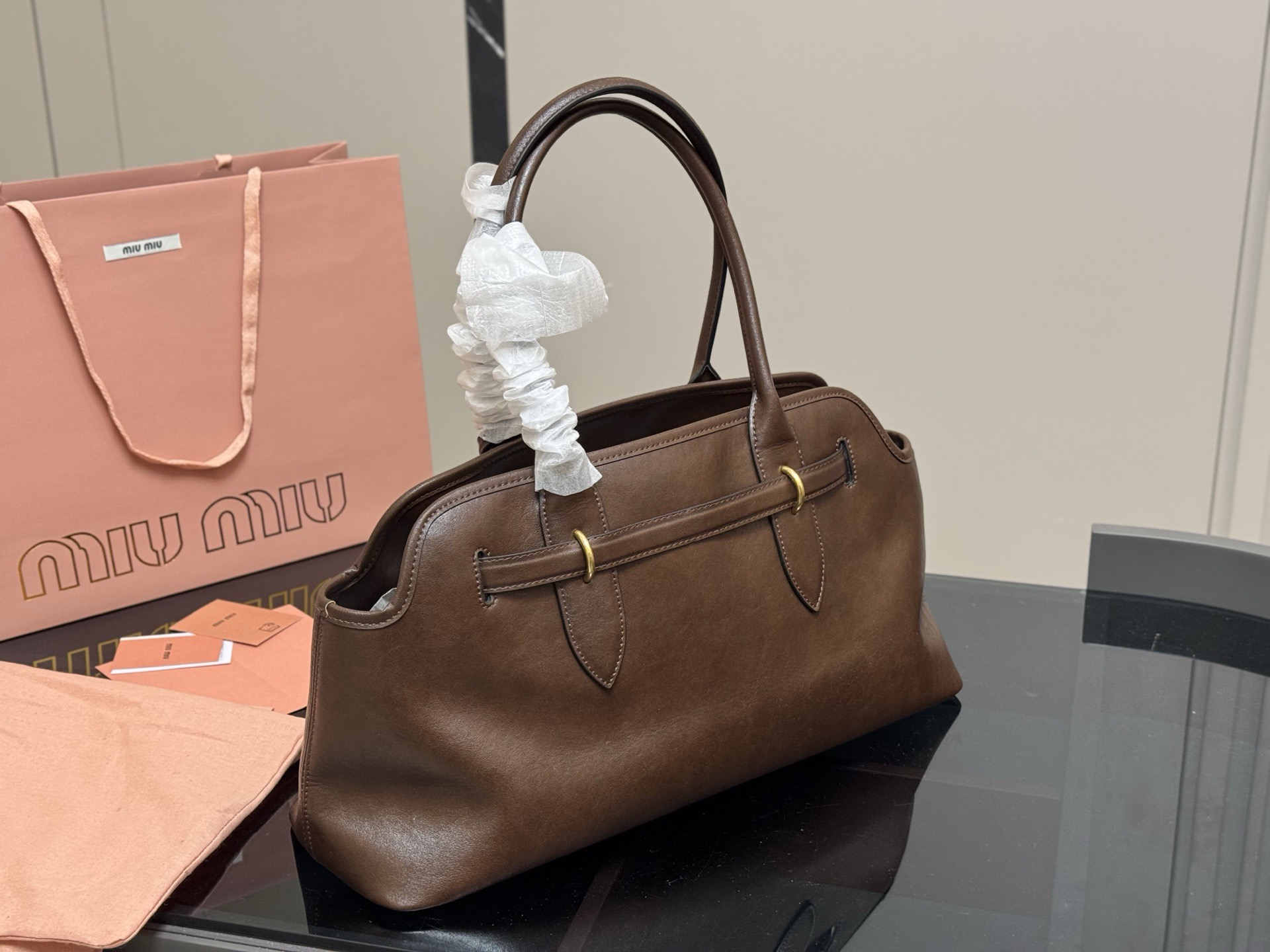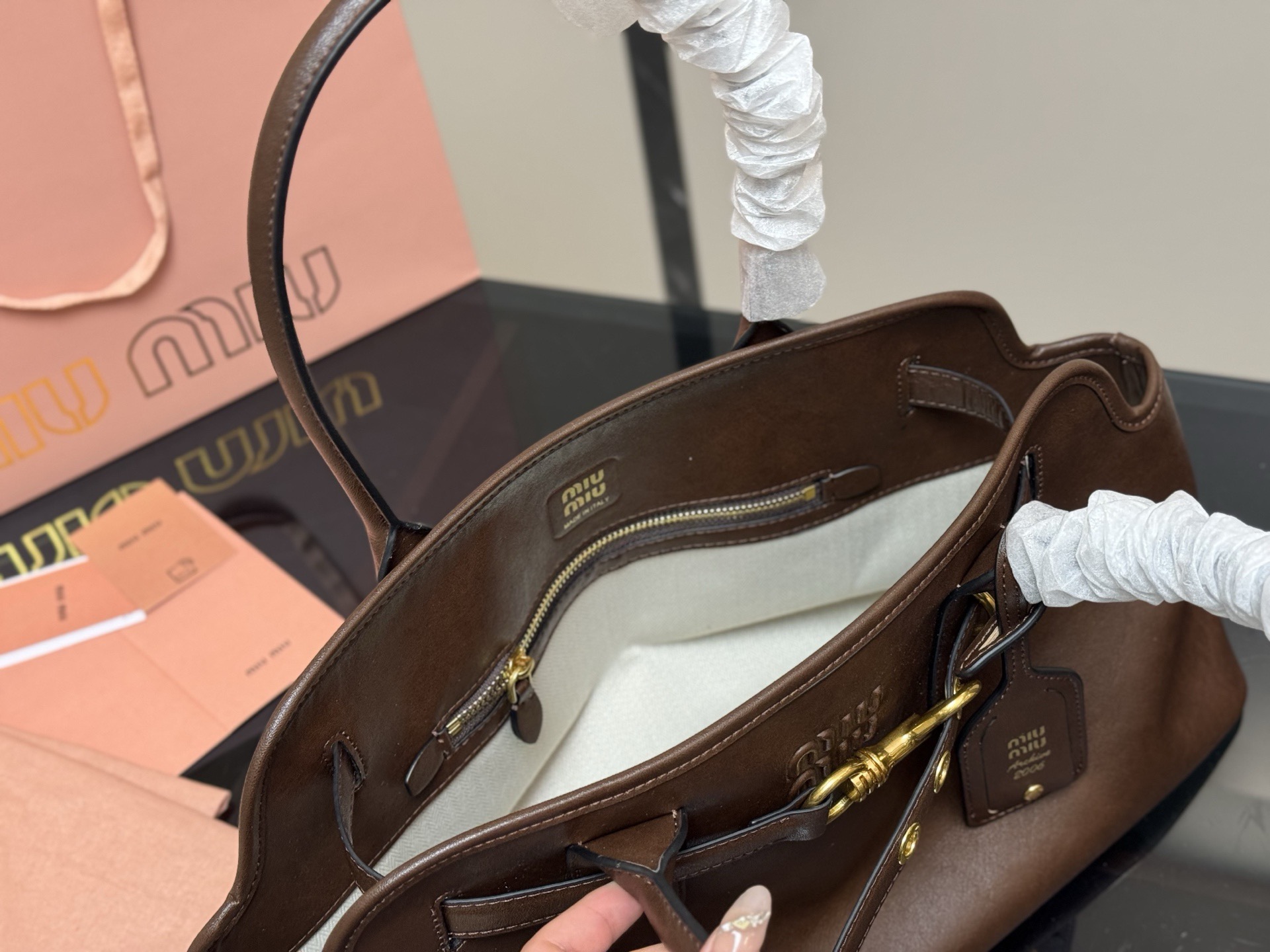 A masterpiece embodying Italian vintage chic, the MIU MIU Aventure handbag is crafted from premium Nappa leather, boasting a soft, delicate touch and a natural sheen. The signature embossed bronze metal logo is understated yet recognizable, highlighting the brand's style.