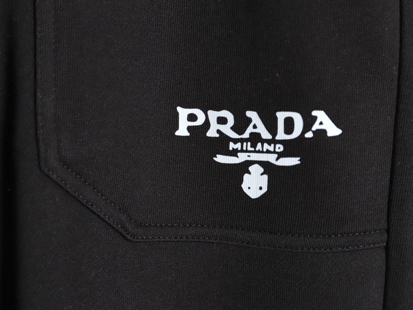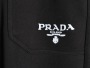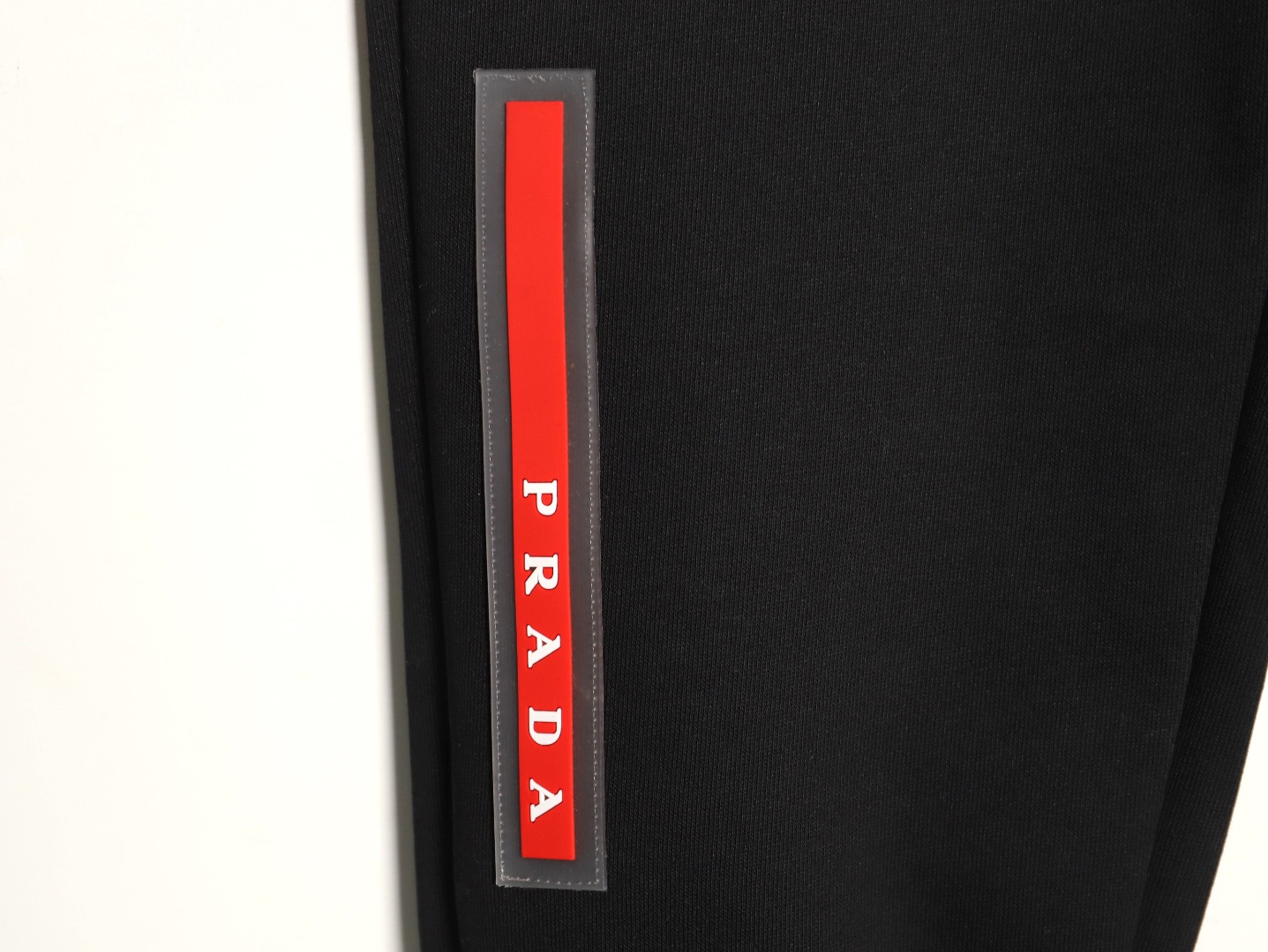 Red Rubber Stamp Logo Lettering: The Prada red rubber stamp logo is prominently displayed on the pants, continuing the brand's signature identity. Made from a high-end custom material, the stamp features a rich, vibrant color, creating a striking visual contrast with the black and white pants. The logo's lettering adheres strictly to Prada's exclusive specifications, with spacing and proportions accurately replicating the original, without blurring or distortion. The distinct, embossed texture is felt to the touch, highlighting the brand's identity and creating a stylish statement piece, distinguishing the pants from the cheaply printed logos of common imitations.