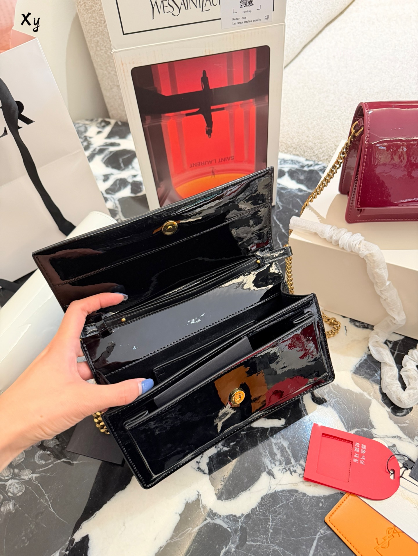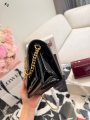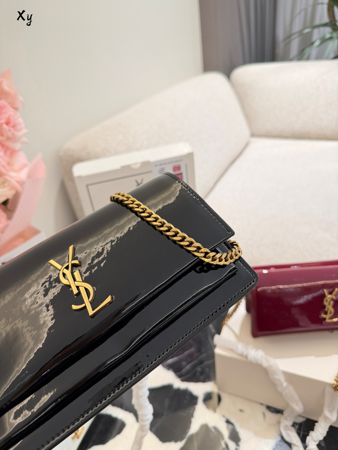 The exquisite YSL gold logo on the front is a key feature. The classic, minimalist design of the lettering highlights the brand's appeal and enhances the overall design's recognizability. The chain shoulder strap, featuring a lustrous metal finish, perfectly complements the patent leather, making it suitable for both shoulder and crossbody use, making it both practical and stylish.