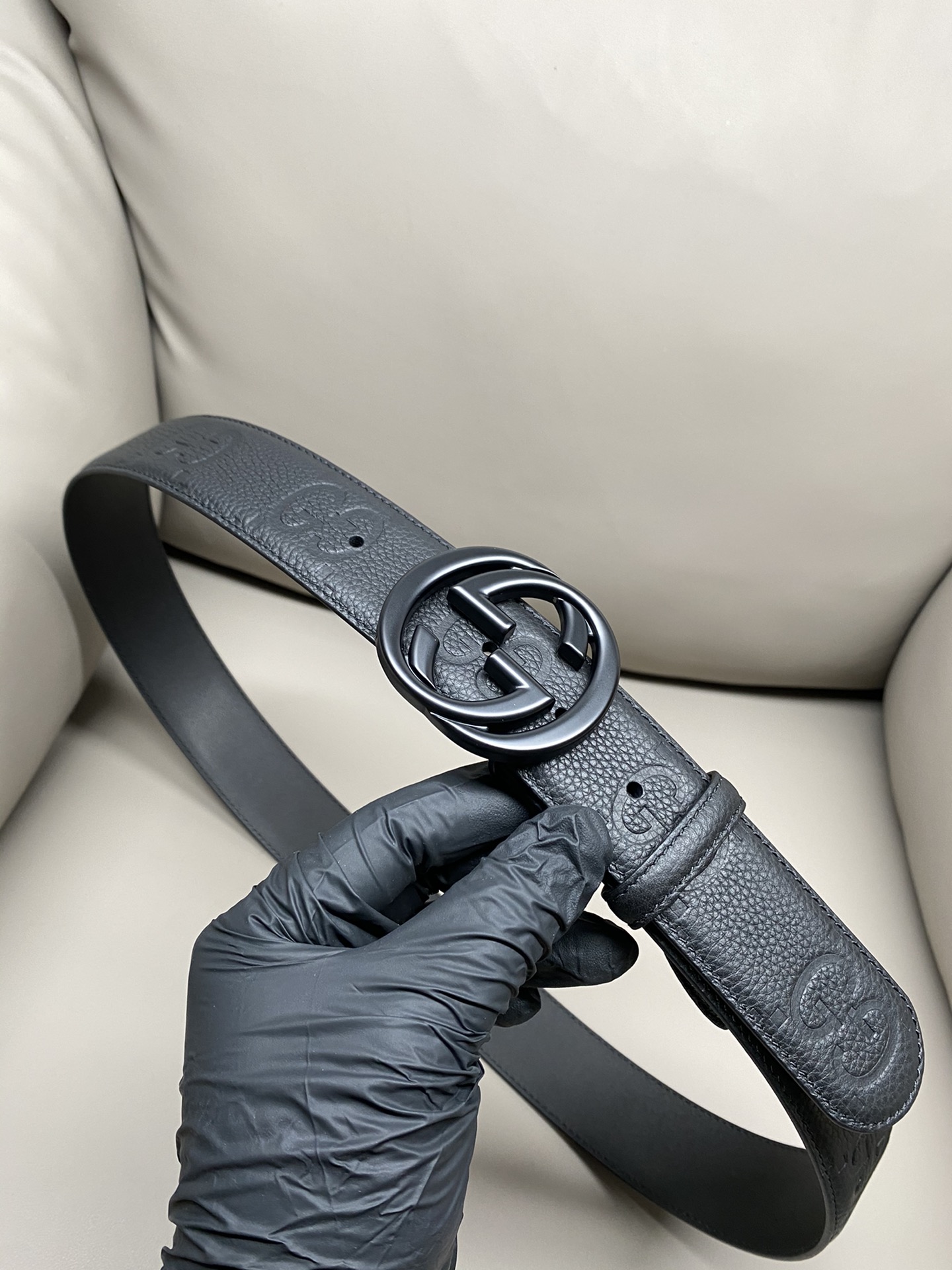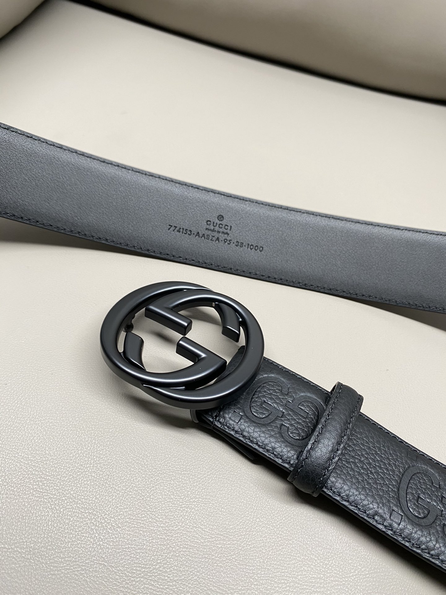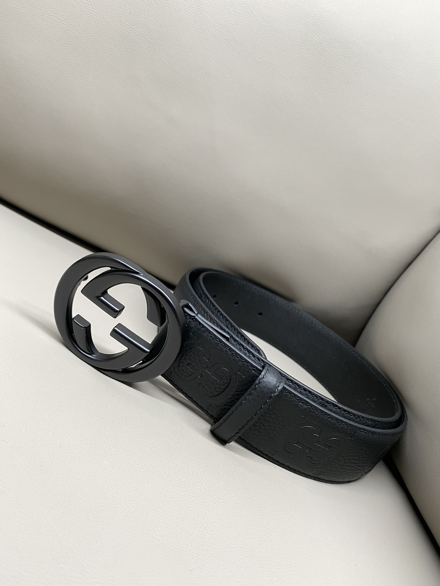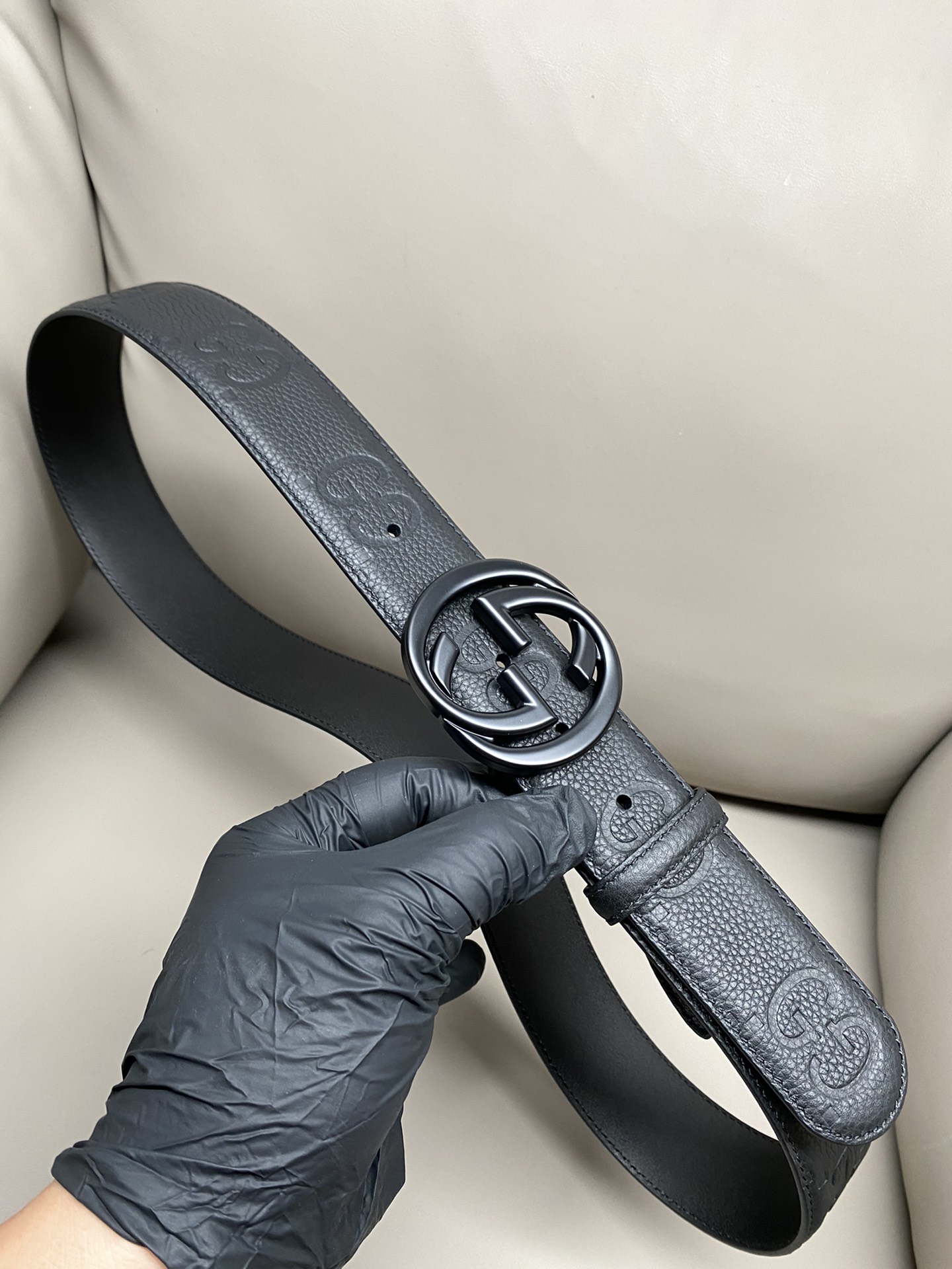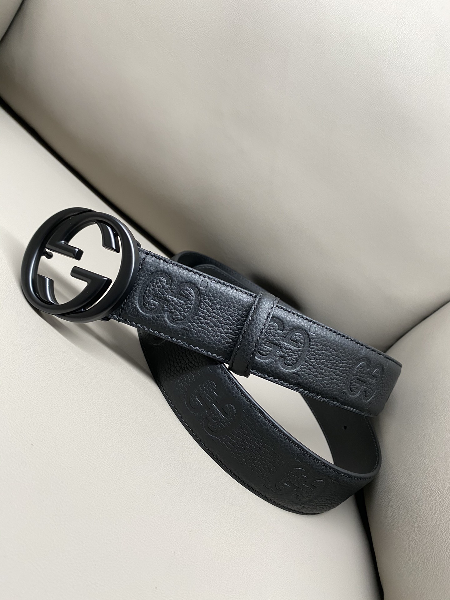 This classic GUCCI double-sided belt is crafted from the brand's signature Gucci Signature heat-embossed leather. Made from imported top-grain cowhide, it boasts a thick, crisp, and smooth feel. The distinctive, three-dimensional print creates a rich, textured look. The interlocking G metal buckle exudes the brand's understated luxury.