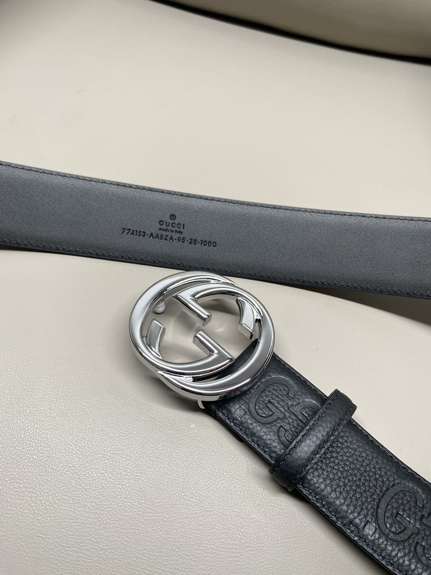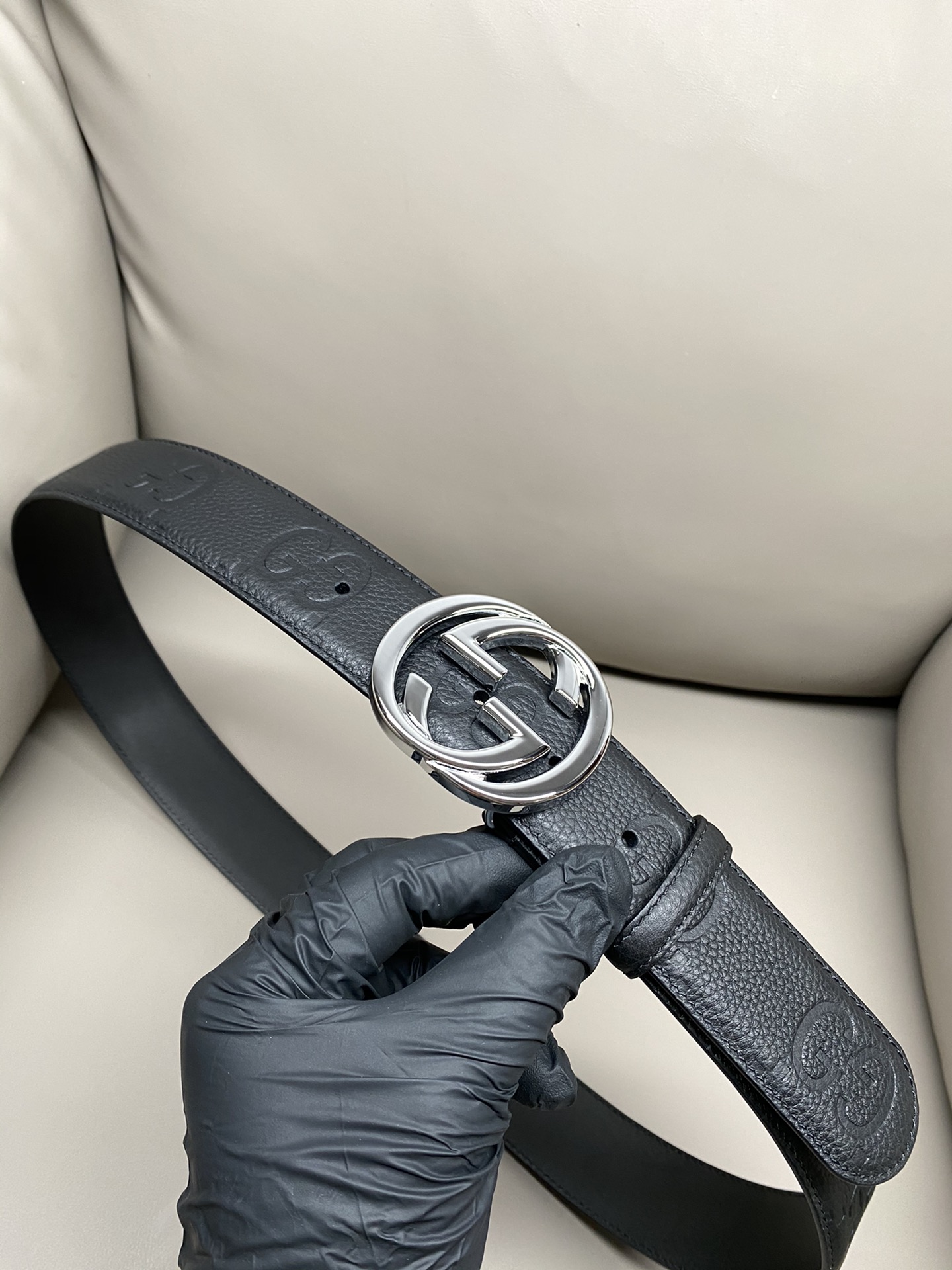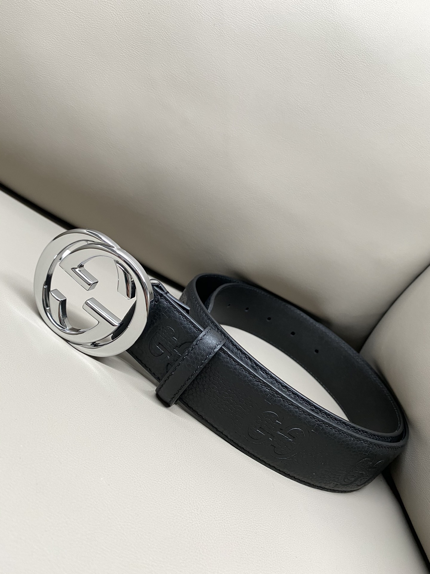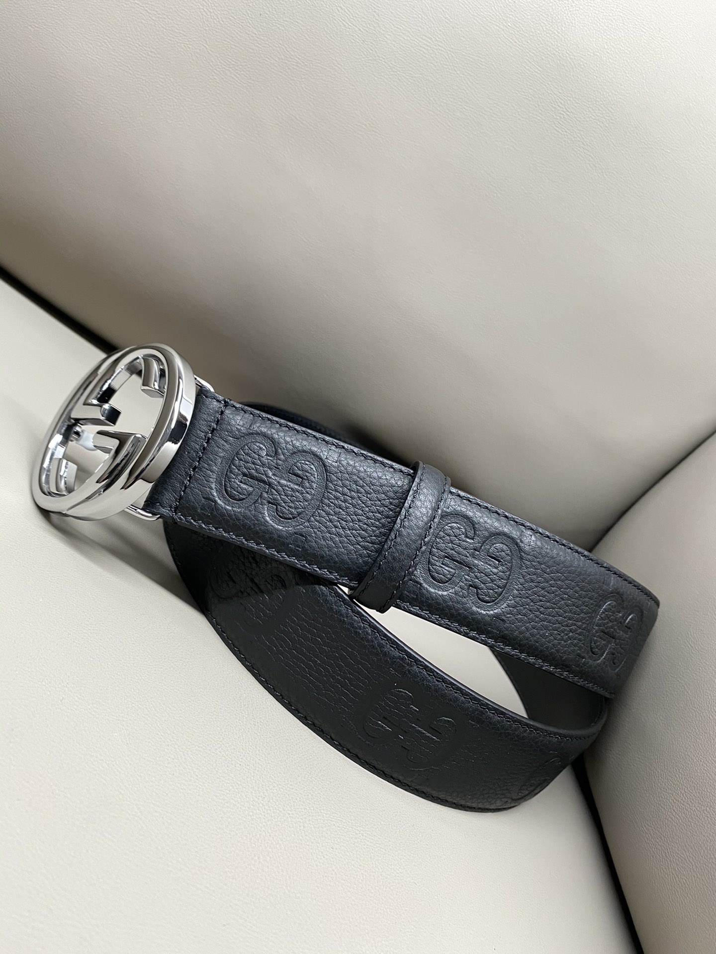 This classic GUCCI double-sided belt is crafted from the brand's signature Gucci Signature heat-embossed leather. Made from imported top-grain cowhide, it boasts a thick, crisp, and smooth feel. The distinctive, three-dimensional print creates a rich, textured look. The interlocking G metal buckle exudes the brand's understated luxury.