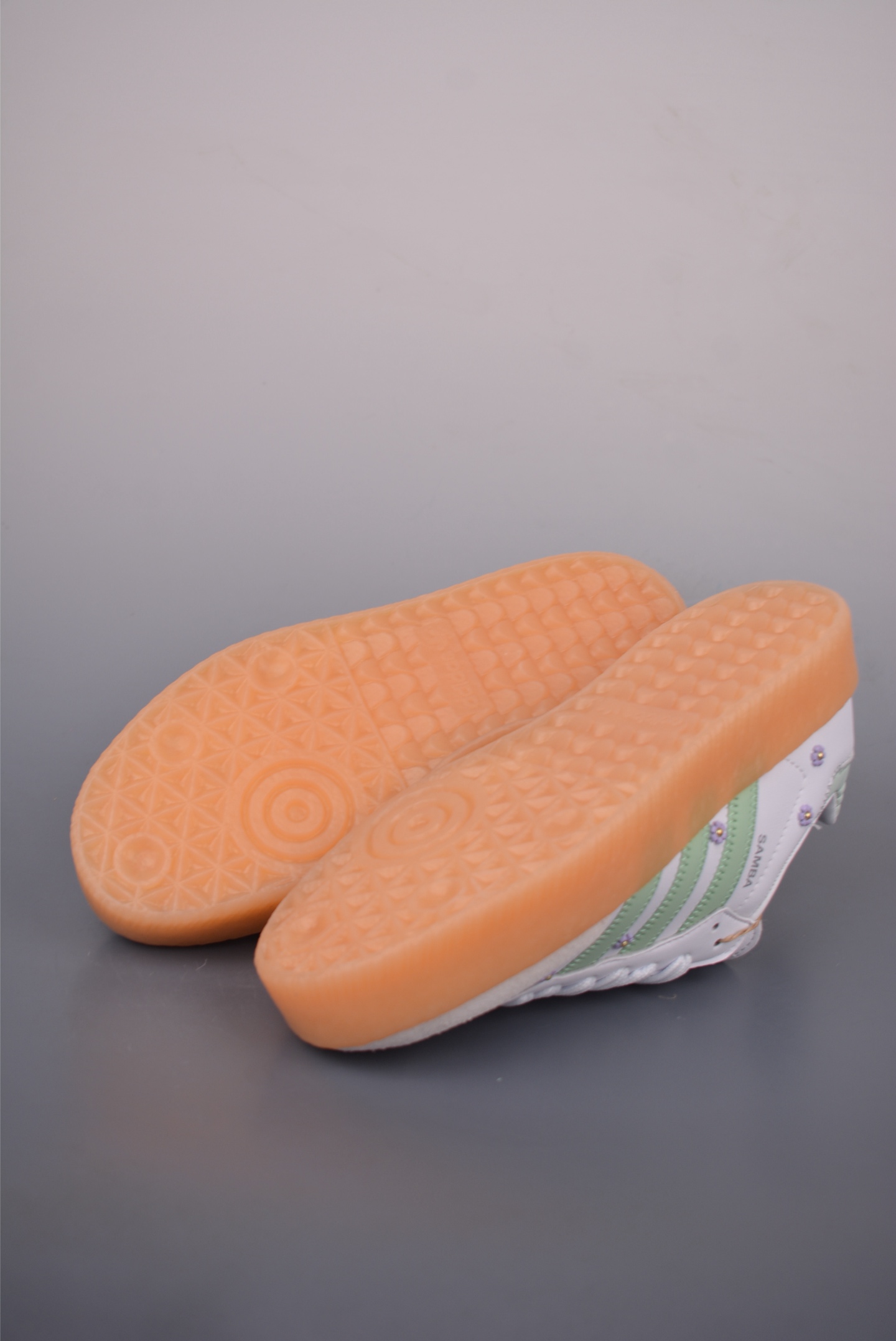This shoe retains the classic design of the Adidas Samba, particularly with its white upper and refreshing green floral pattern, creating a delicate and vibrant look. The floral embroidery adds a soft, artistic touch, enhancing the shoe's three-dimensional and layered look, creating a stylish yet classic look. The green floral pattern adds a fresh and natural touch, giving the shoe a relaxed and casual feel.