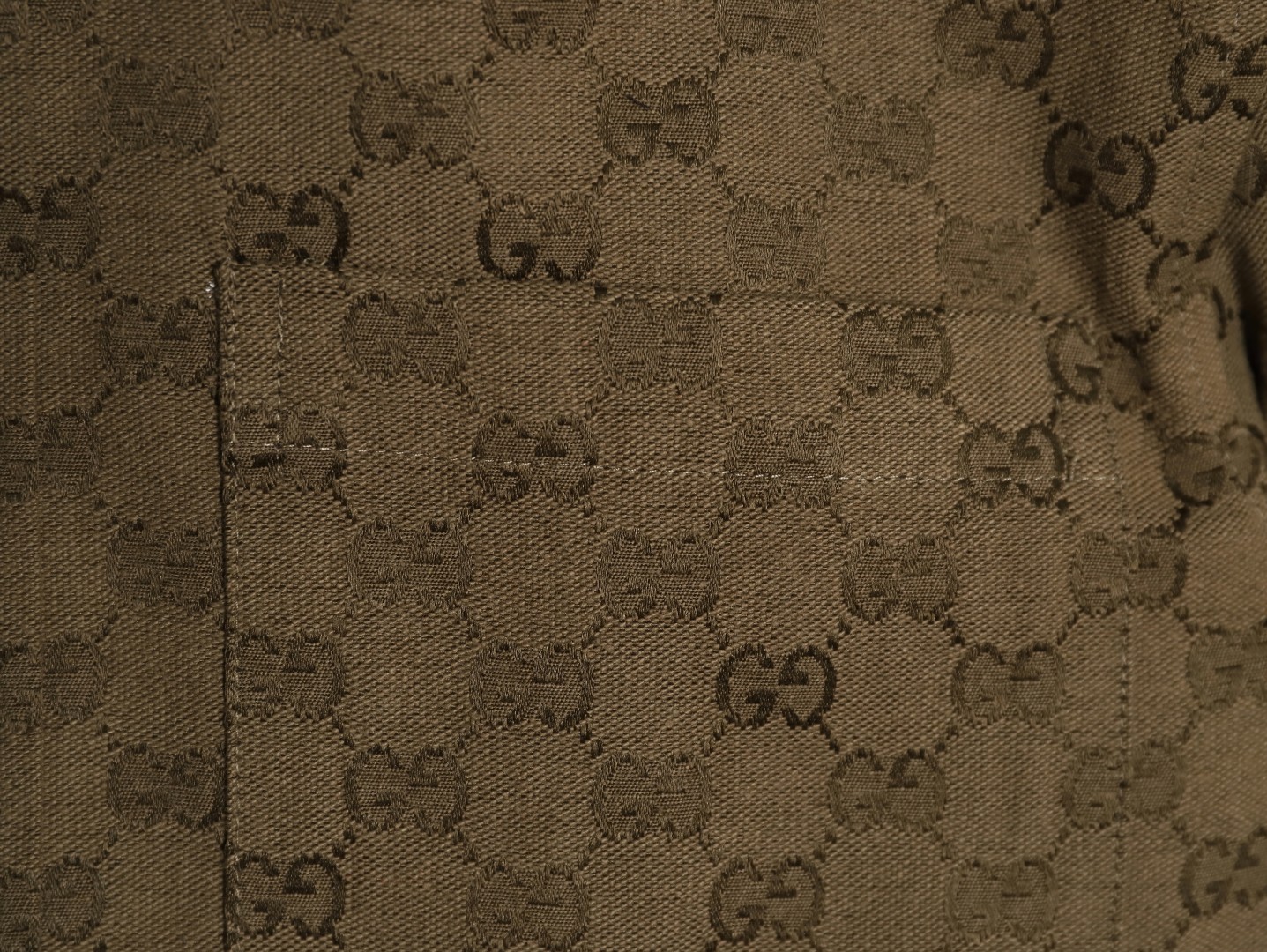 Retro monograms are timeless, and meticulous detailing creates a classic. This GUCCI double G allover jacquard shirt jacket is crafted from the original at a high price. Made from a custom-woven warp siro-spun cotton-nylon blend, it is woven using a dyed jacquard technique on imported large rapier looms. The allover three-dimensional monogram double G pattern boasts a fine texture, a firm feel, and an exceptional quality.