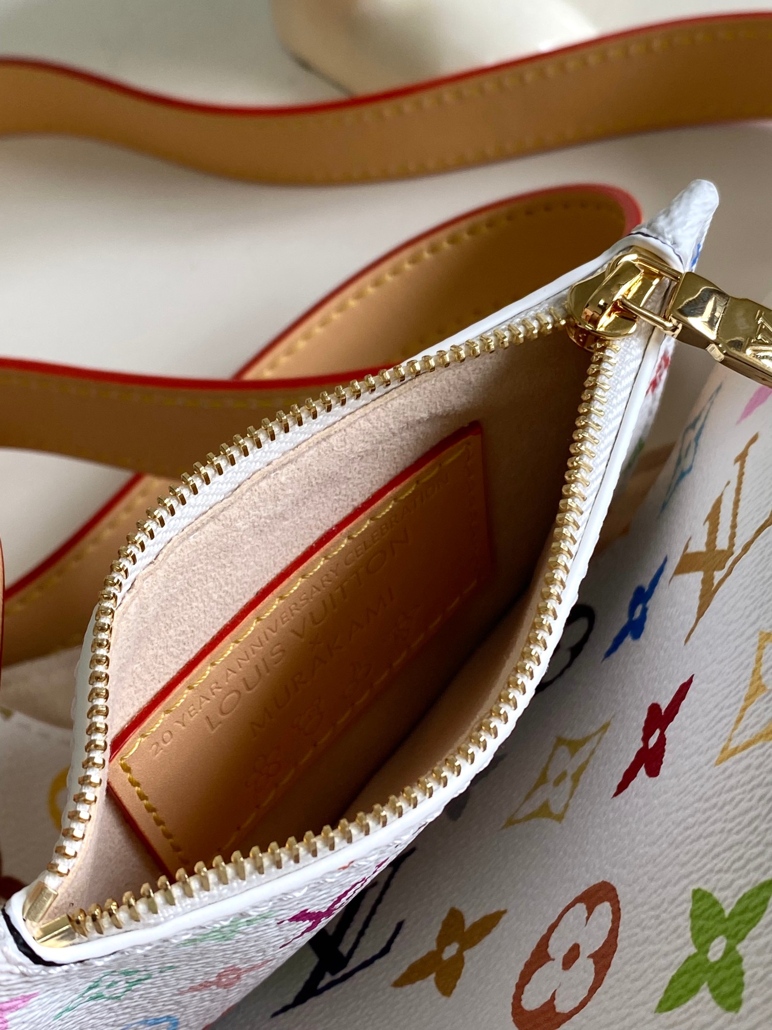 LOUIS VUITTON x Takashi Murakami ALL IN BB collaboration, featuring the white tri-color coated canvas with leather trim, women's white shoulder bag.